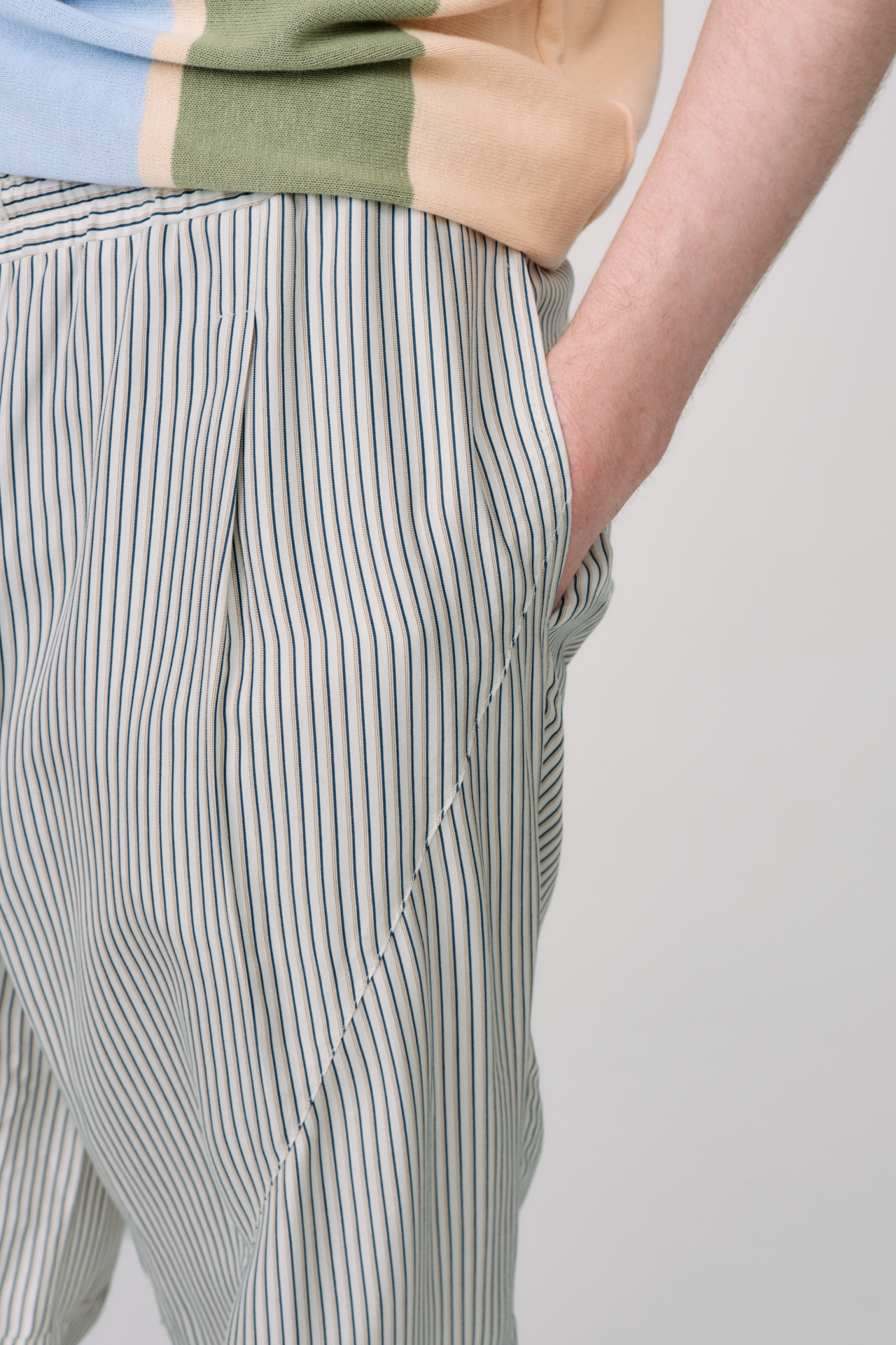 Тонкая вертикальная полоска создаёт мягкий ритм, визуально вытягивает силуэт и добавляет глубины спокойному оттенку. Лёгкая вискоза струится при движении, делая посадку максимально комфортной и живой.