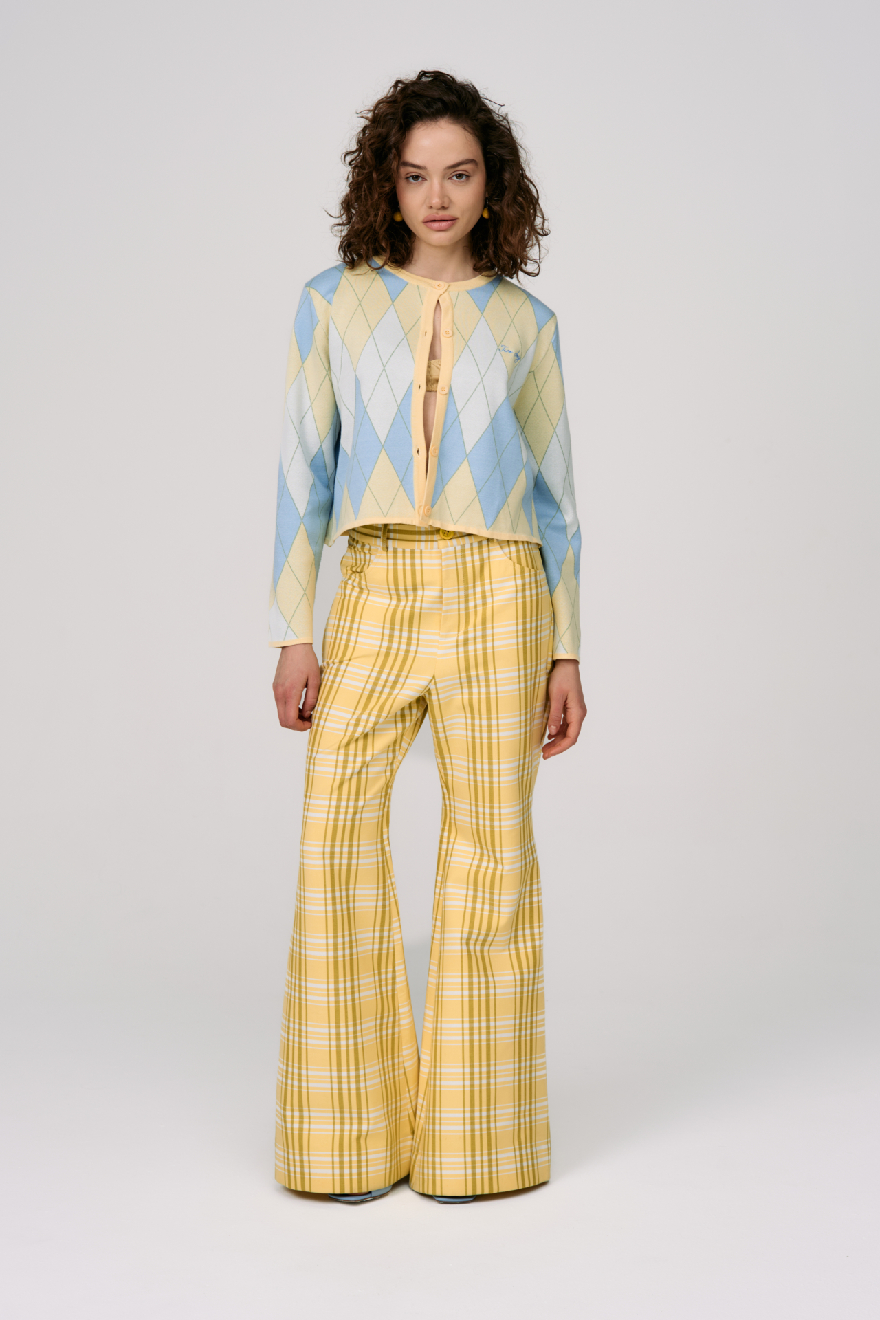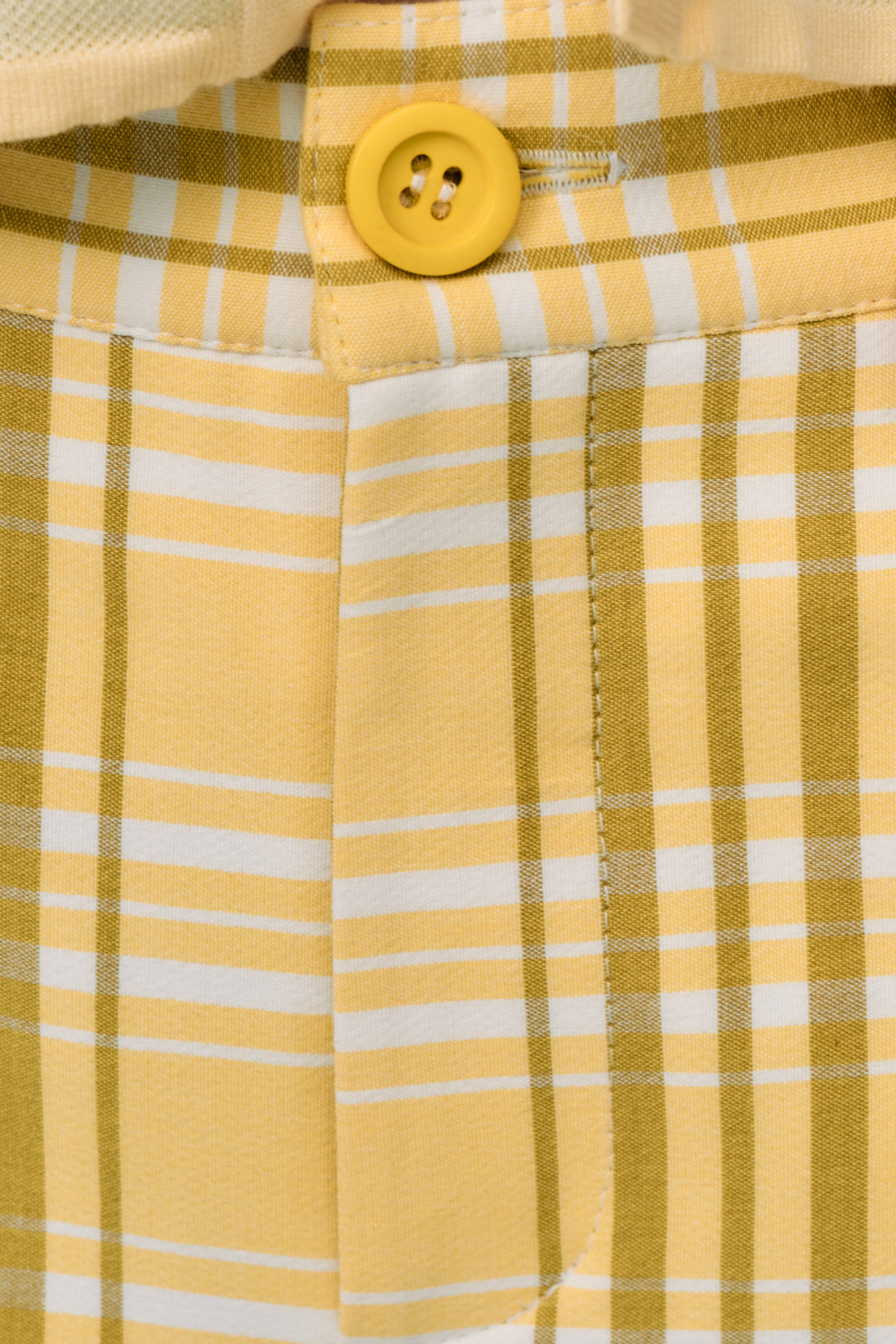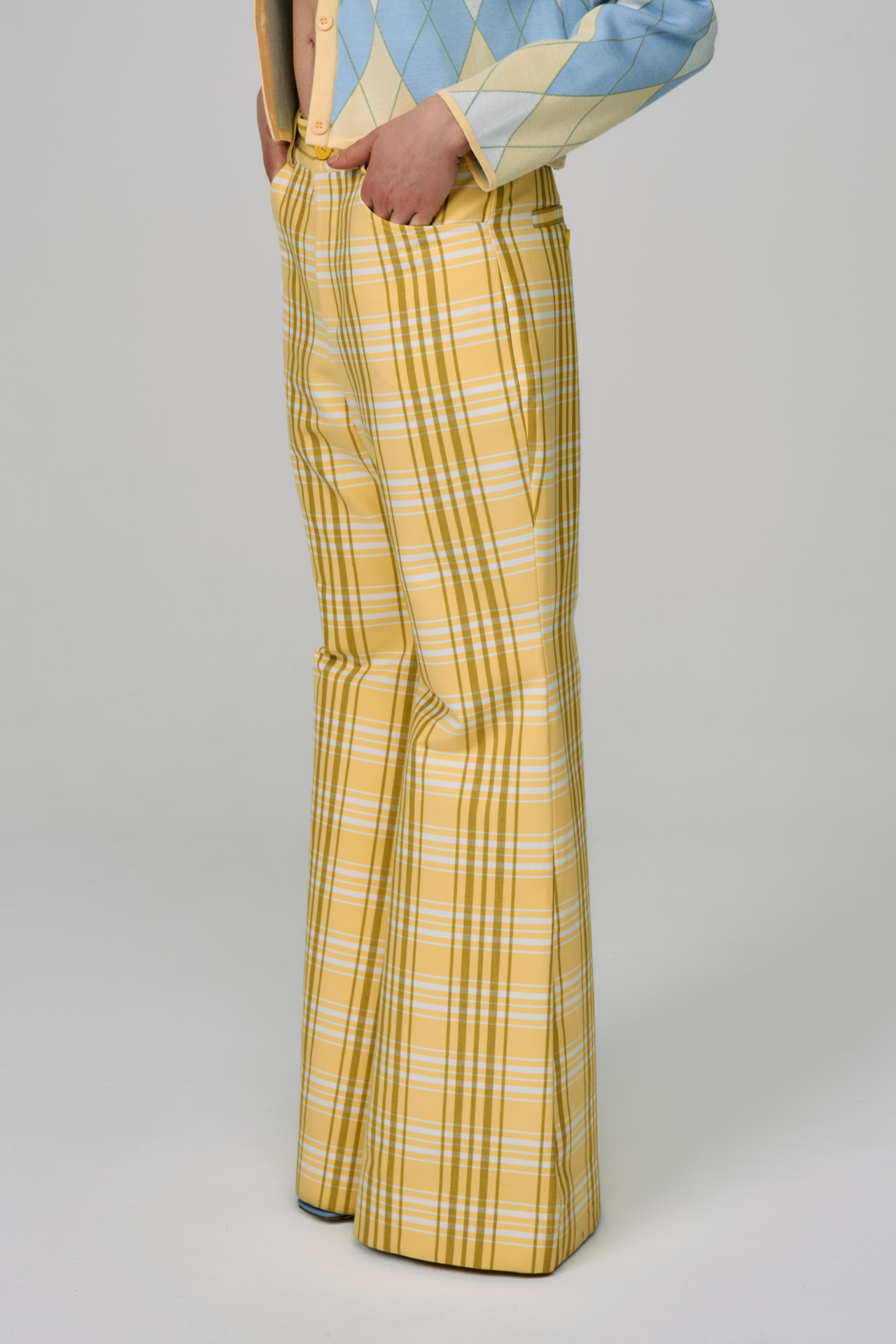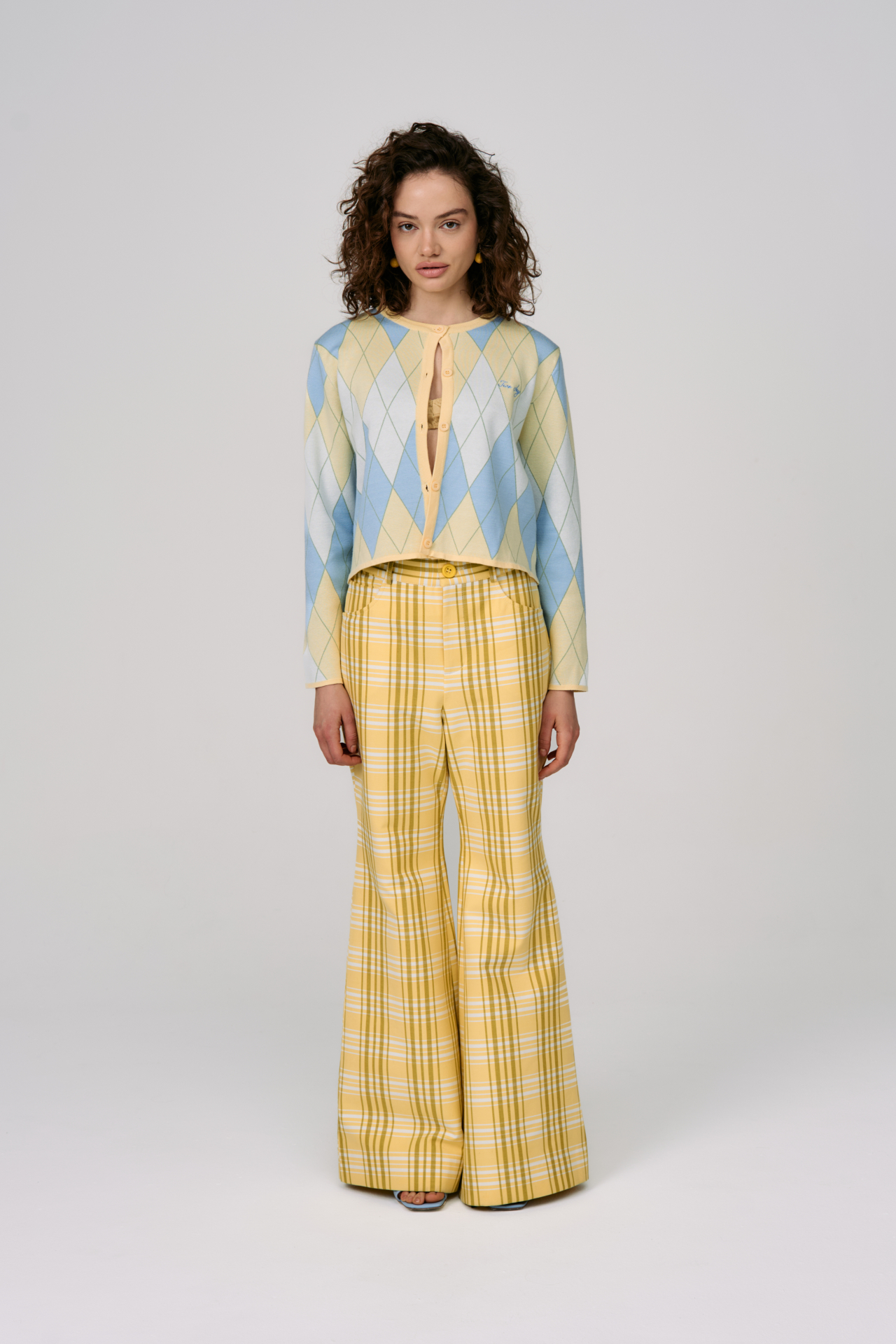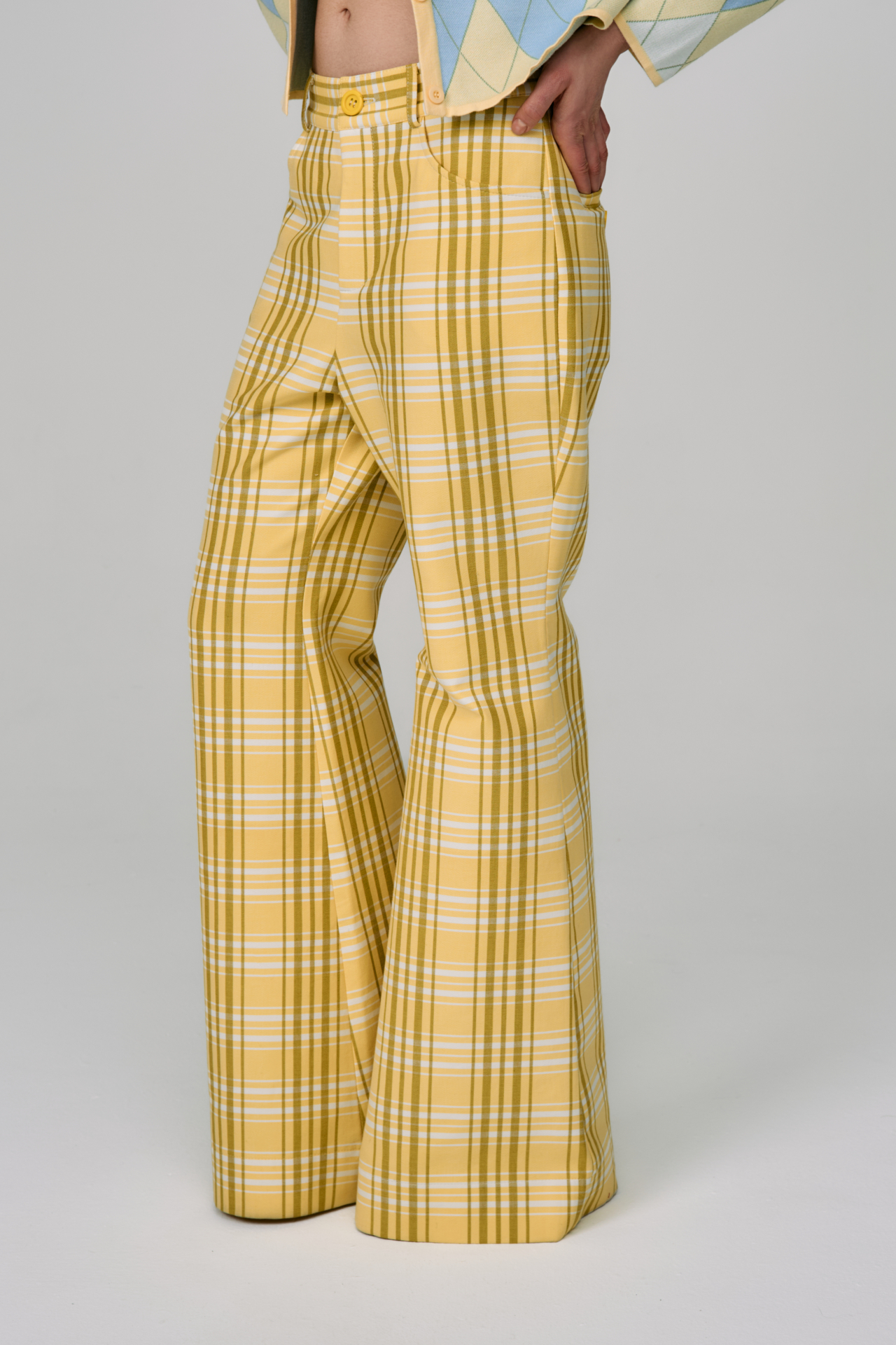Тёплый золотистый оттенок в сочетании с деликатной клеткой создаёт сдержанную, но выразительную графику. Расклёшенный силуэт формирует чёткую линию и добавляет образу лёгкую винтажную динамику.
