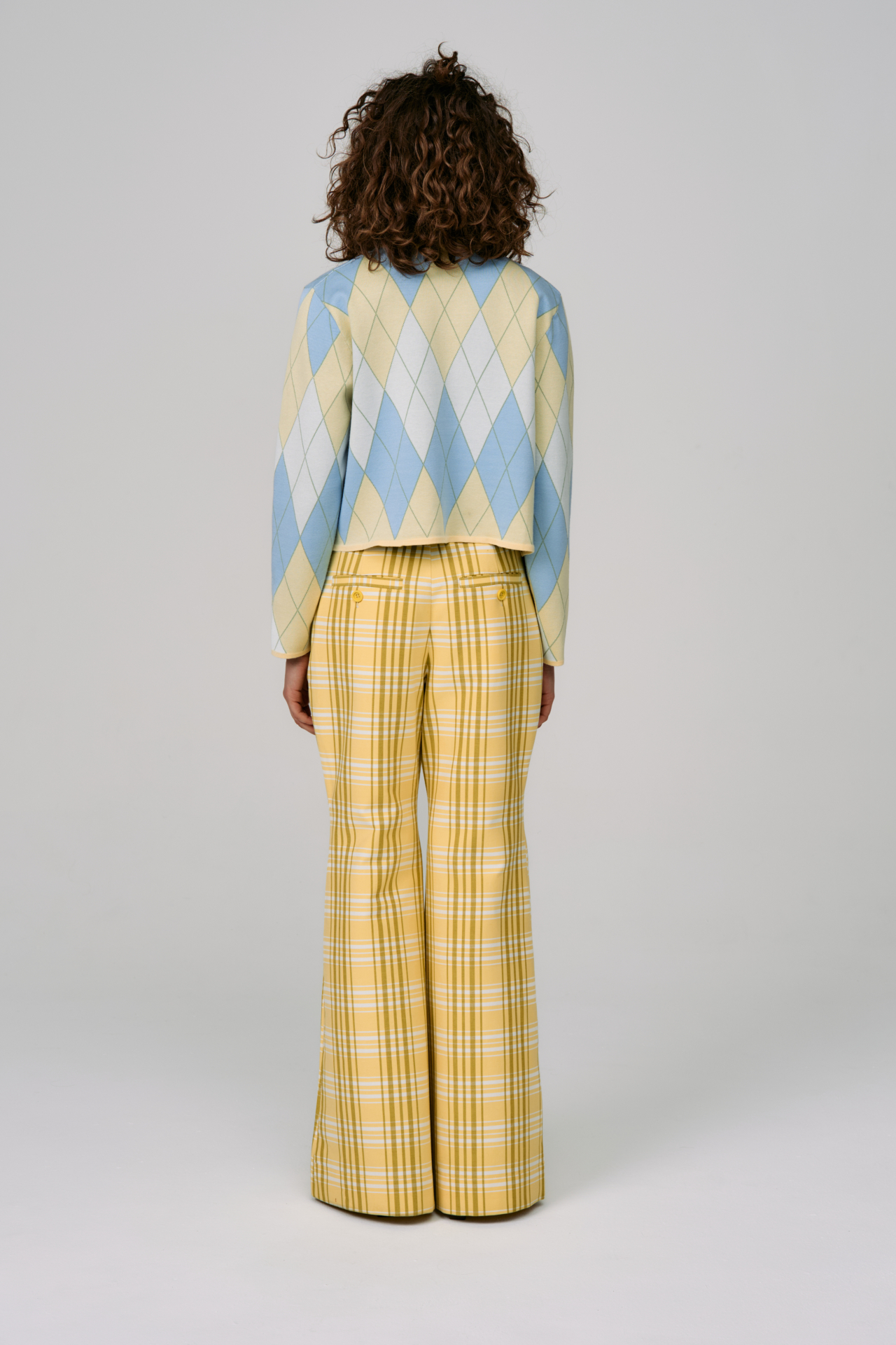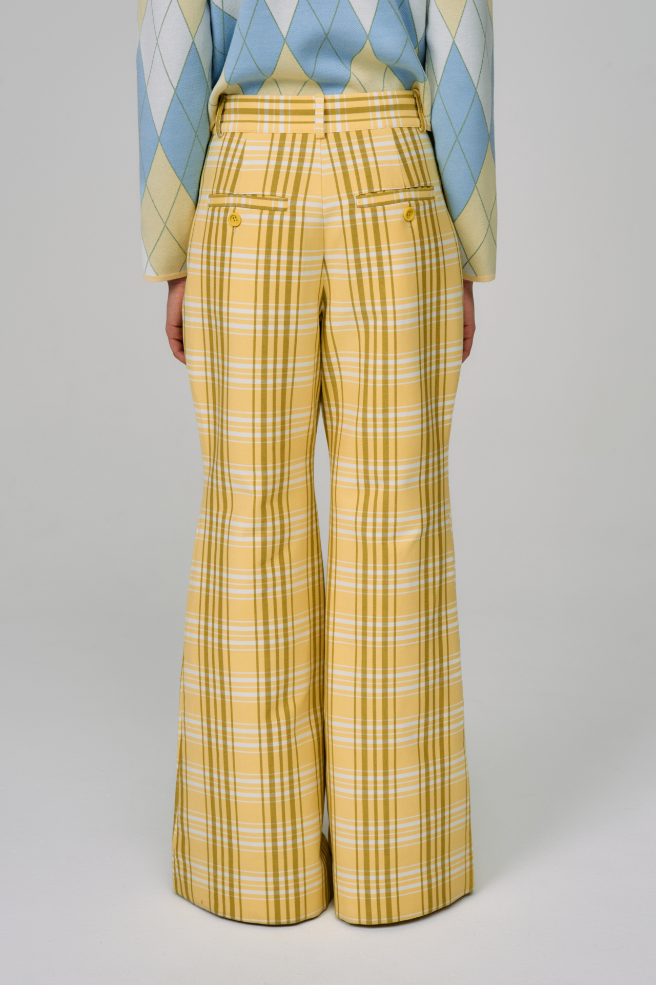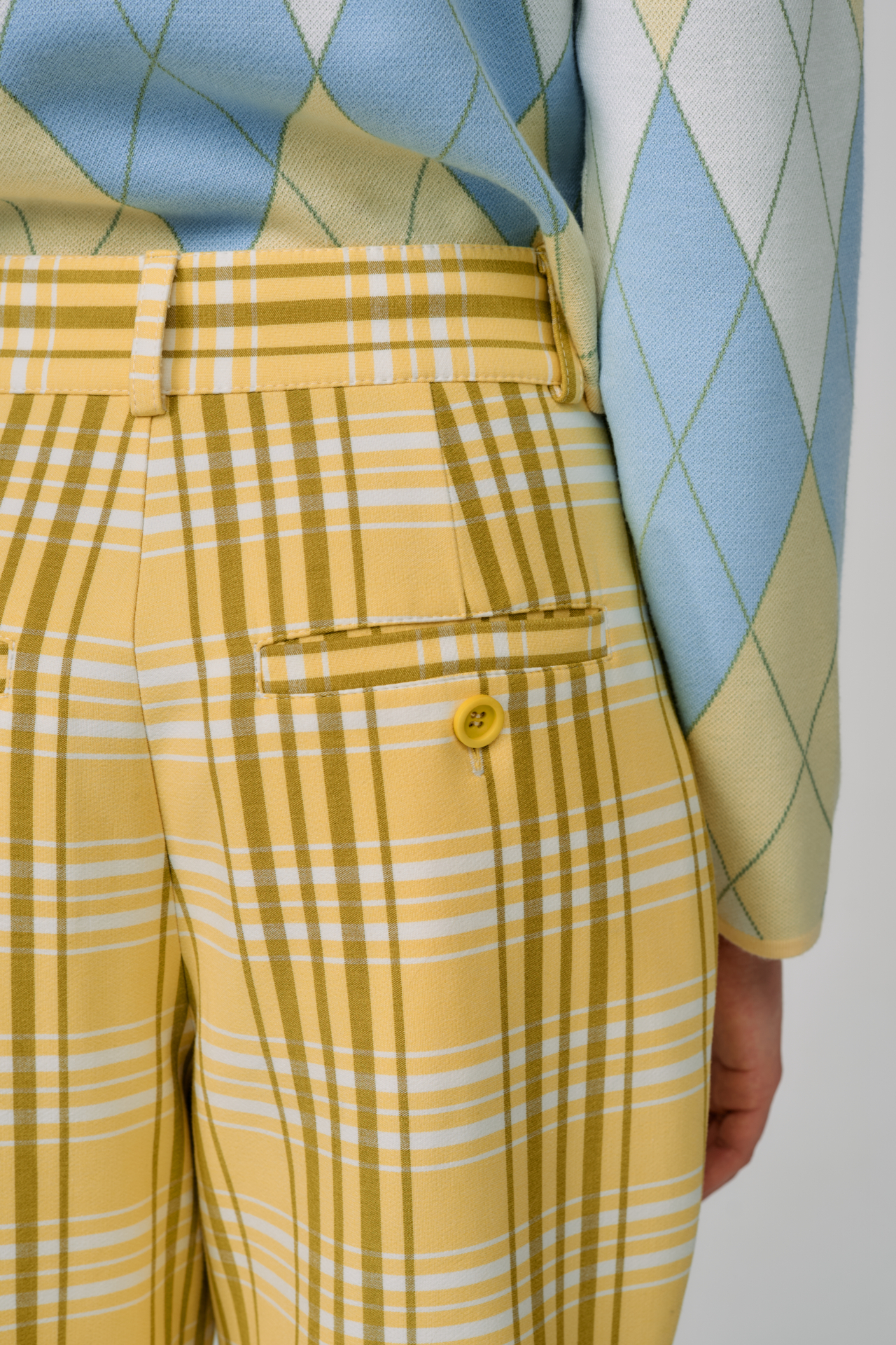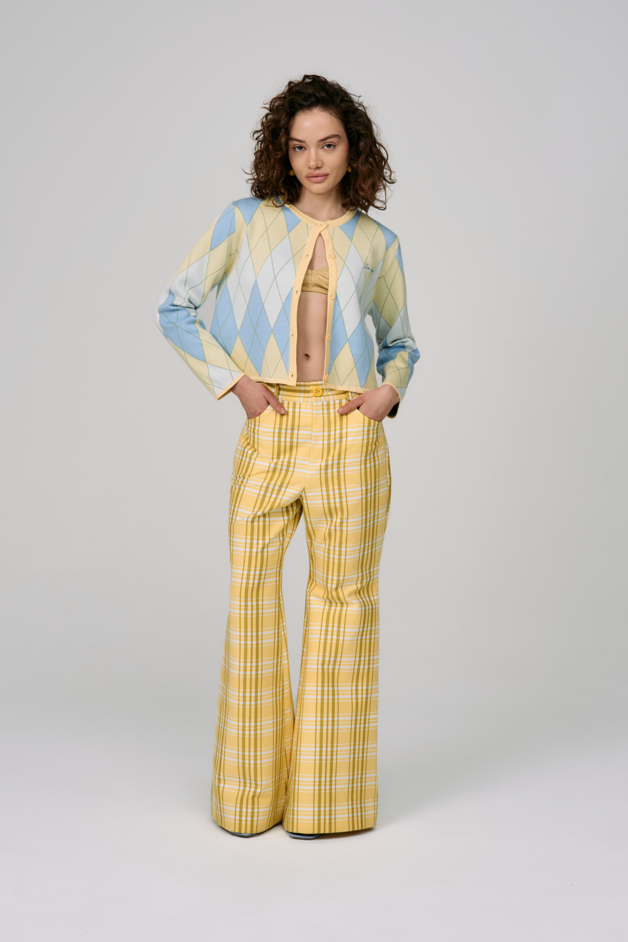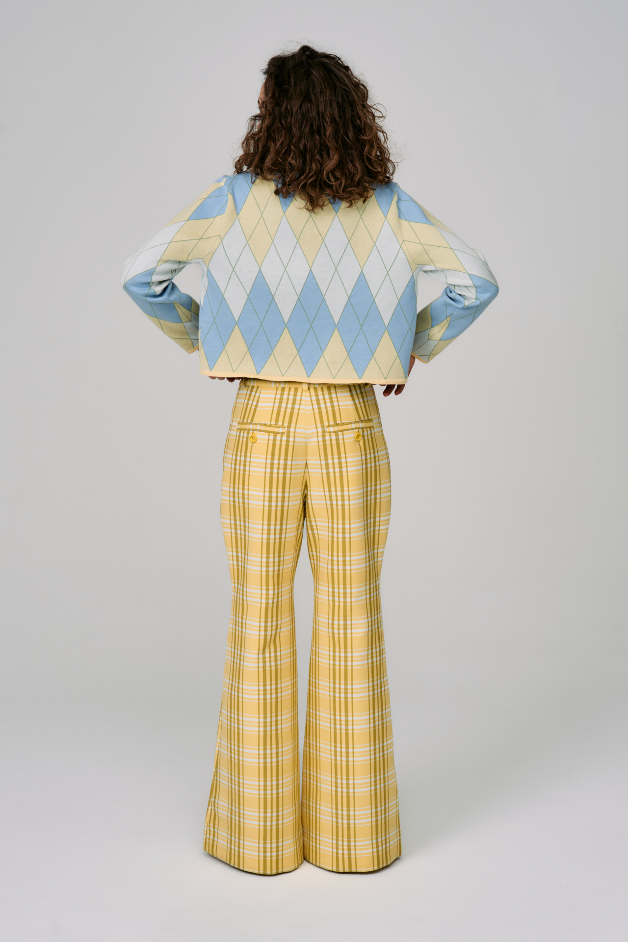 Тёплый золотистый оттенок в сочетании с деликатной клеткой создаёт сдержанную, но выразительную графику. Расклёшенный силуэт формирует чёткую линию и добавляет образу лёгкую винтажную динамику.