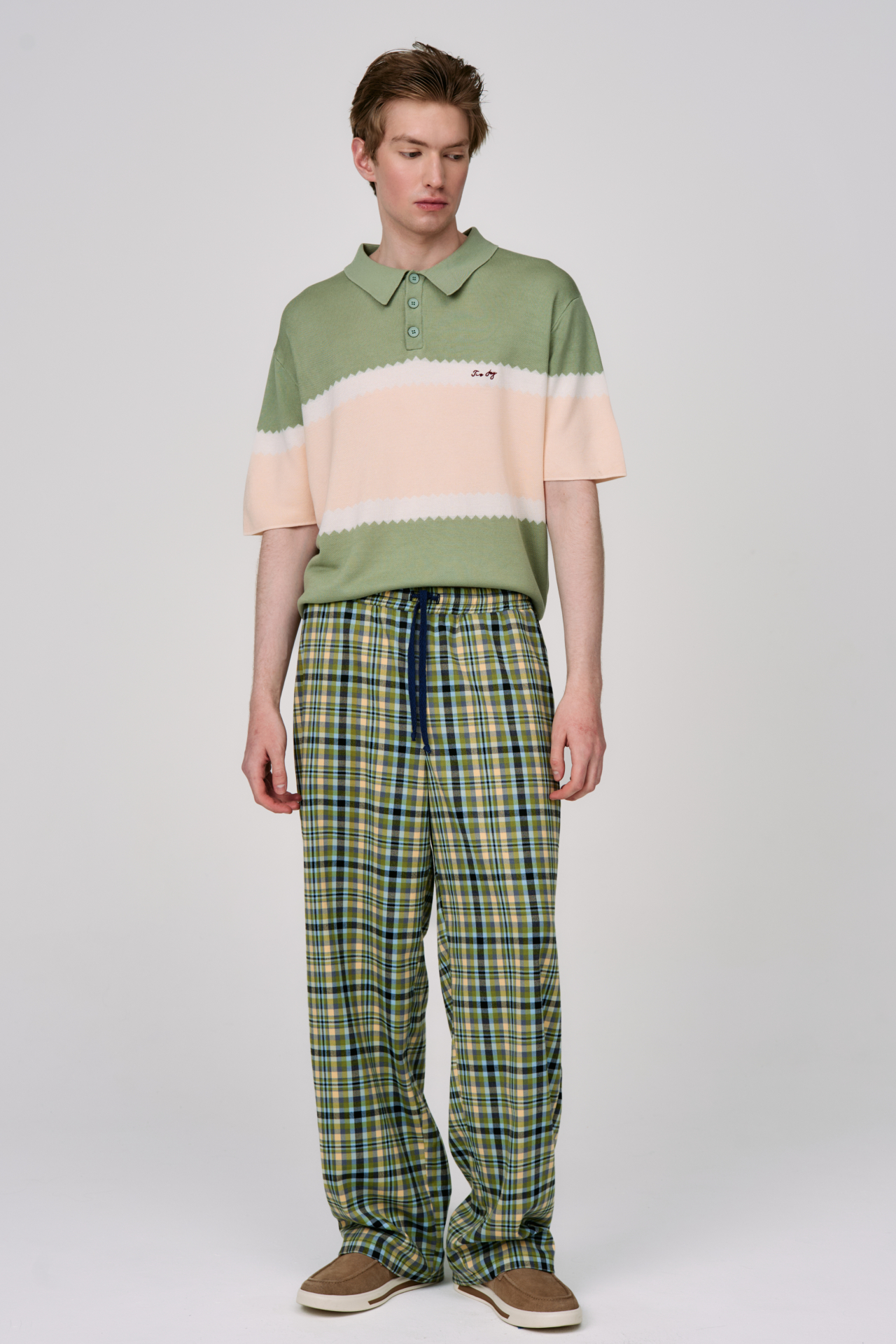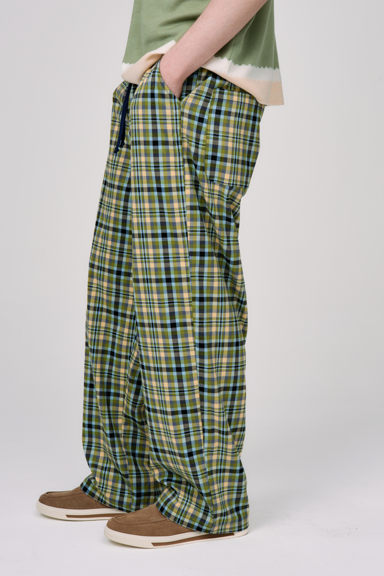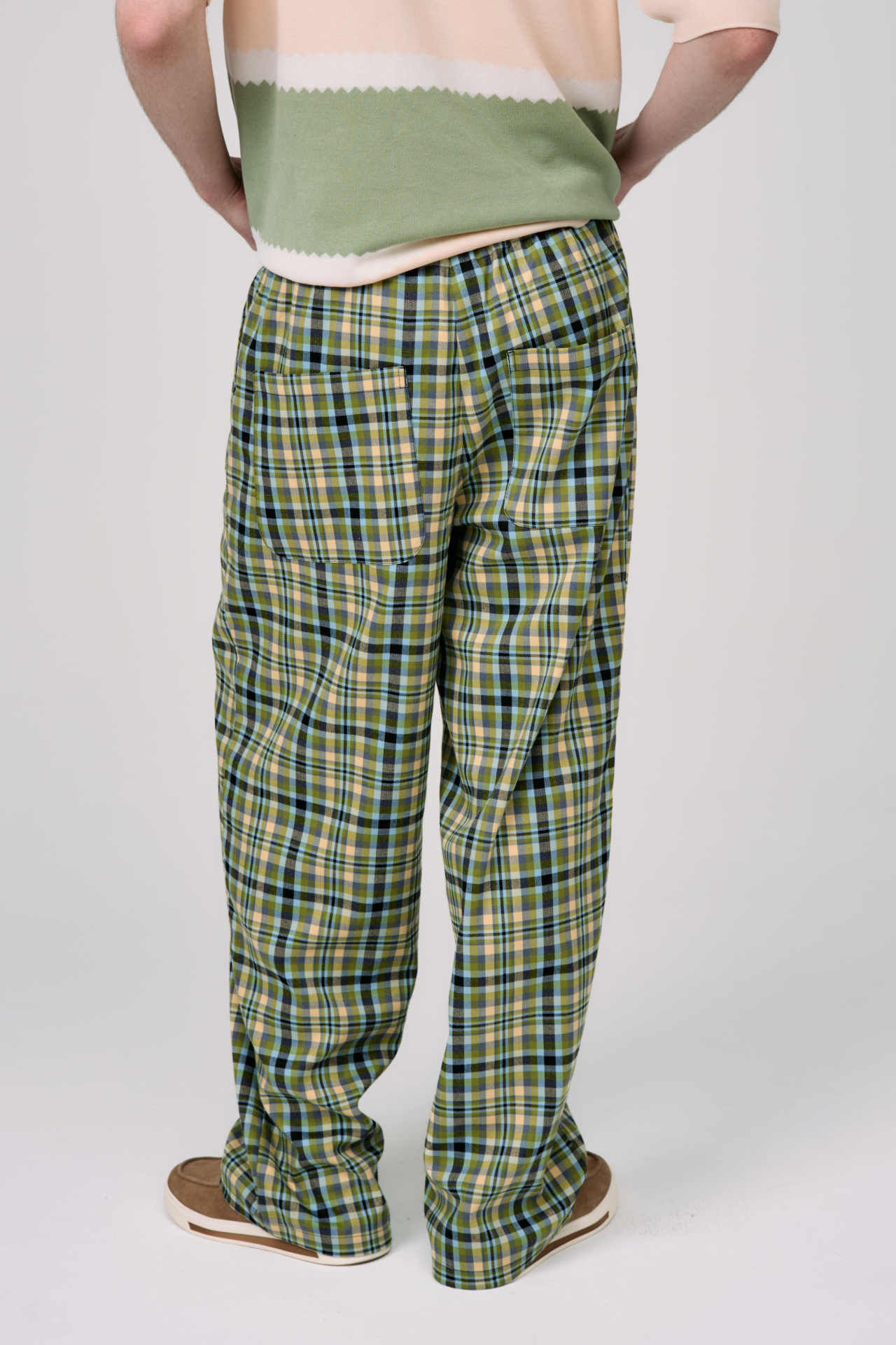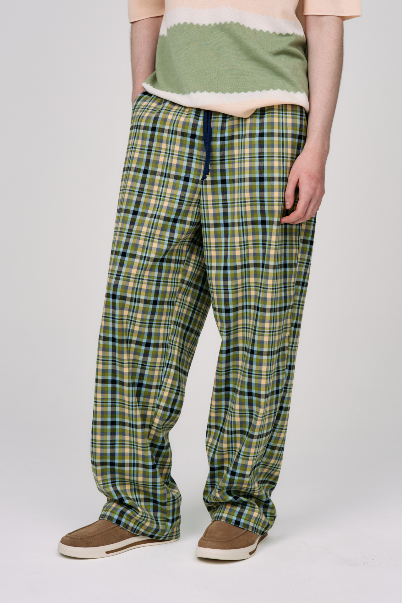 Клетка в мягких оттенках оливкового, голубого и кремового создаёт ощущение лёгкости и движения. Свободный силуэт и эластичный пояс с кулиской делают модель максимально комфортной — для города, поездок и состояний, где важна внутренняя свобода.