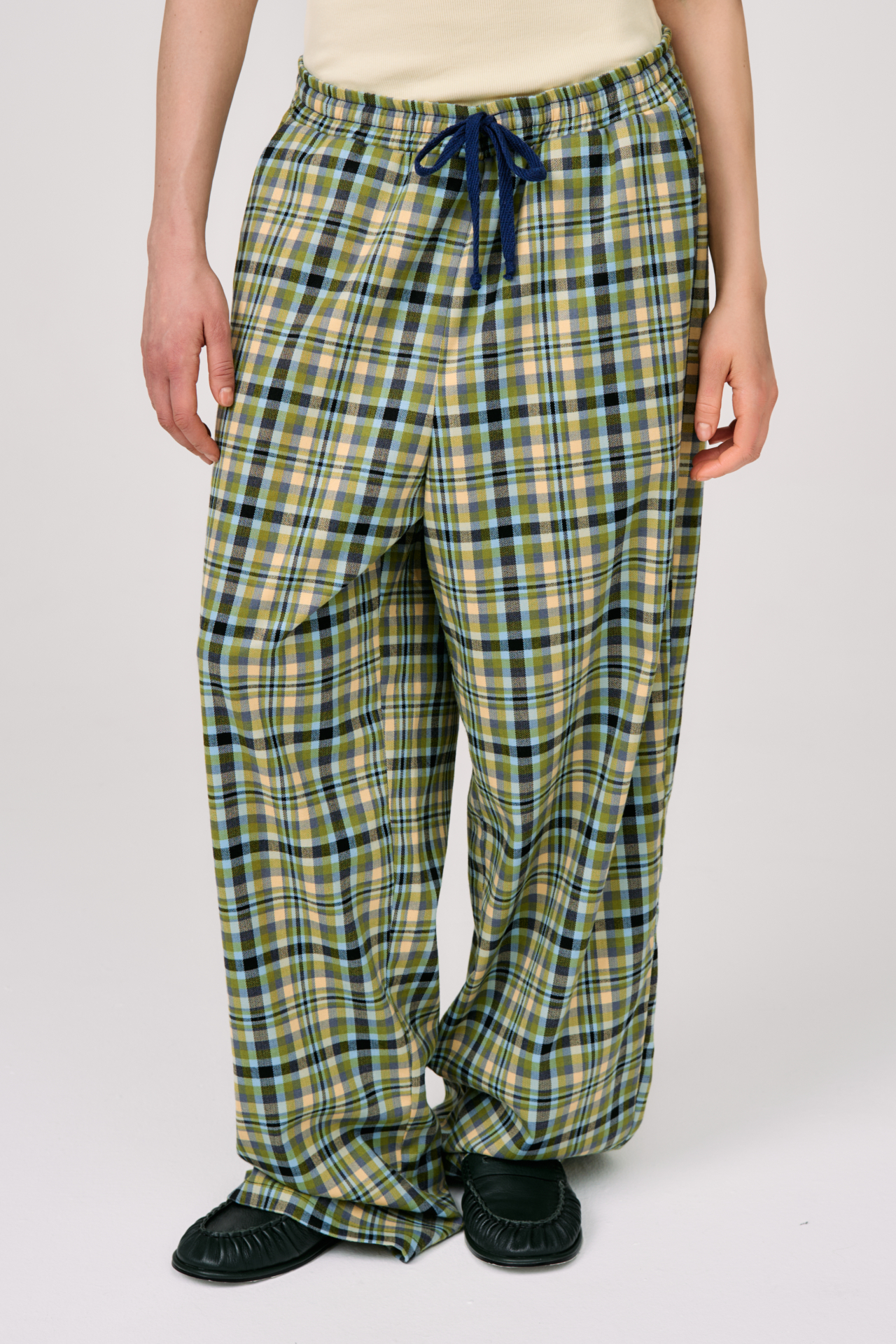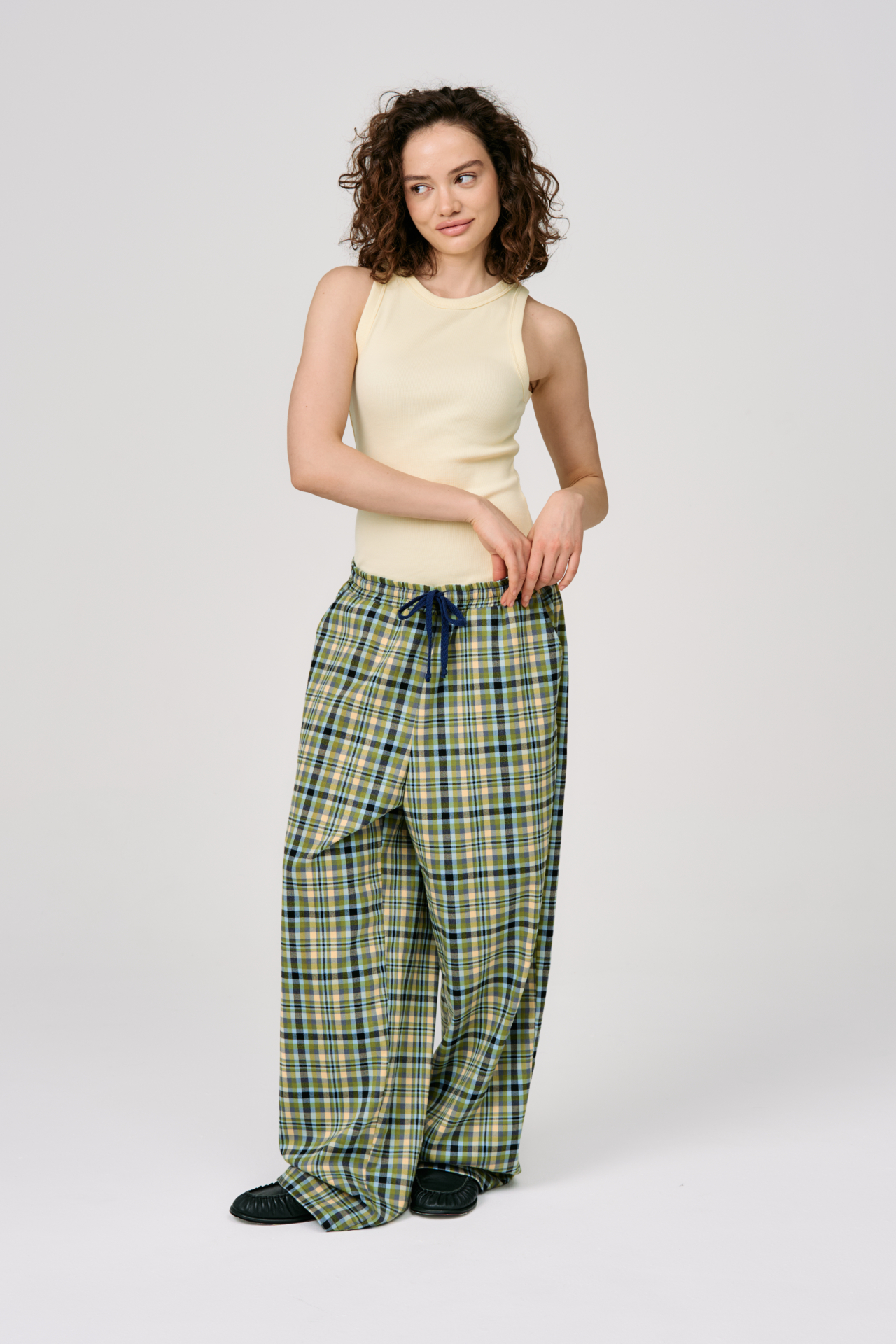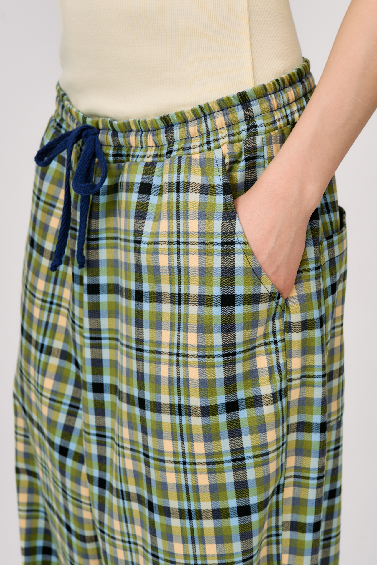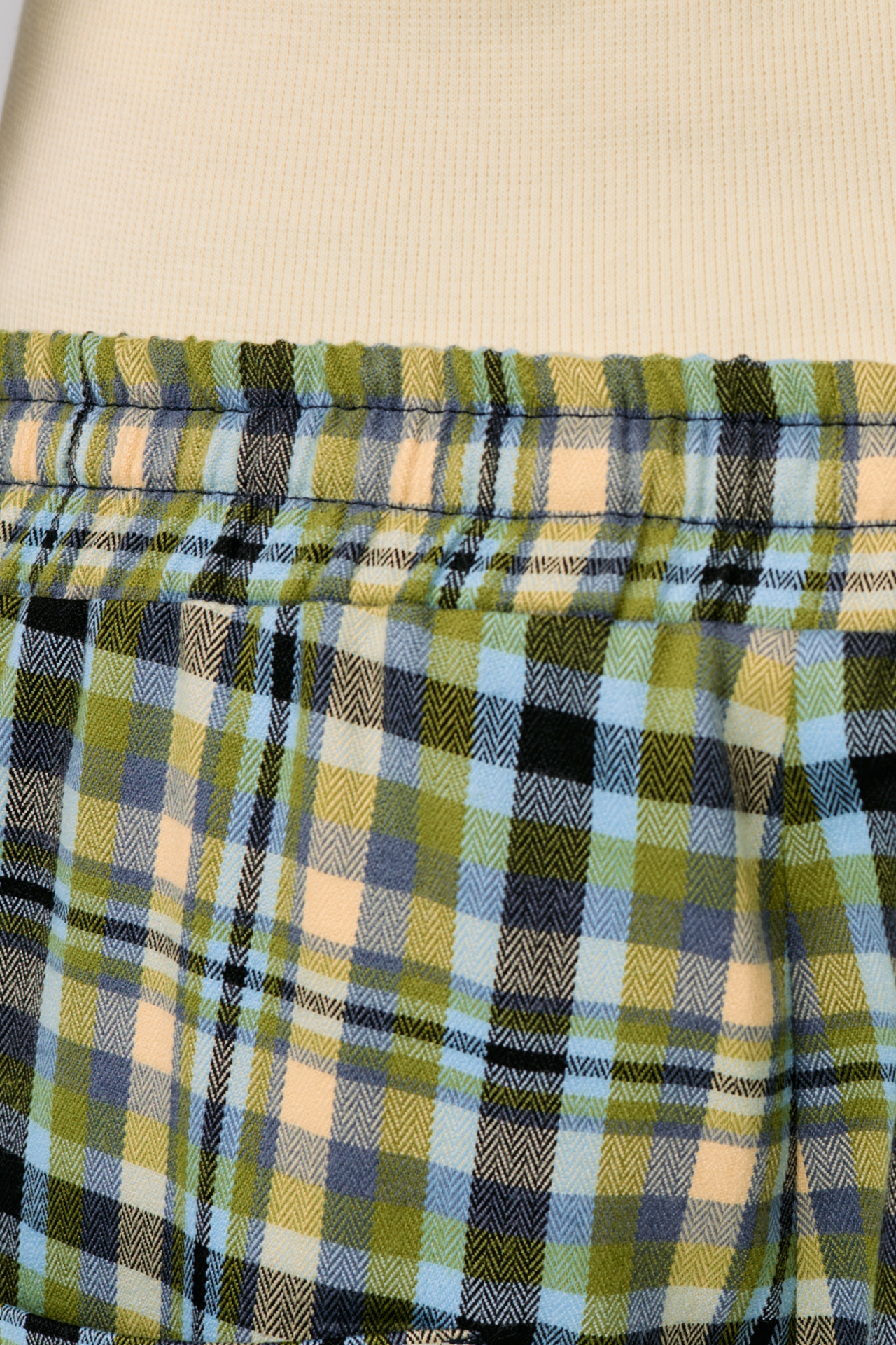 Клетка в мягких оттенках оливкового, голубого и кремового создаёт ощущение лёгкости и движения. Свободный силуэт и эластичный пояс с кулиской делают модель максимально комфортной — для города, поездок и состояний, где важна внутренняя свобода.