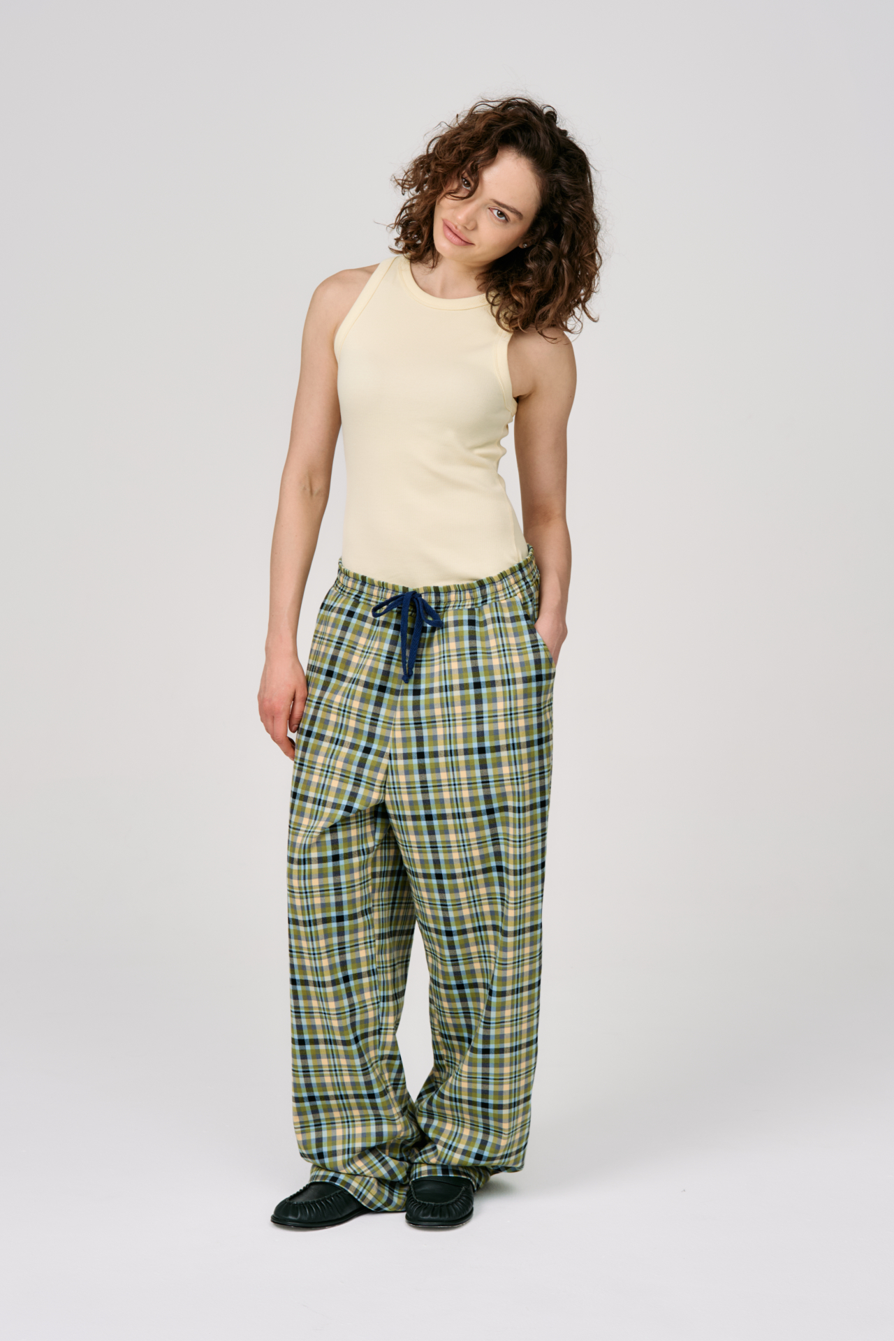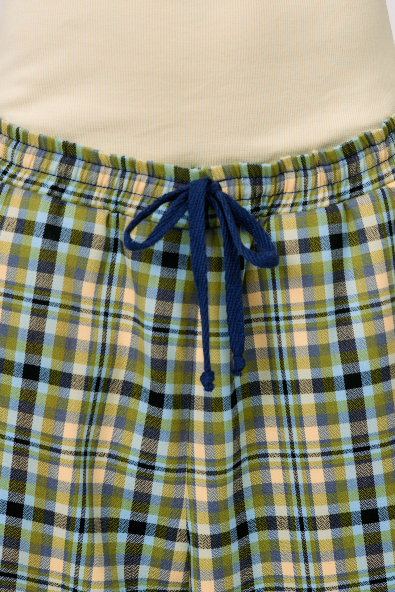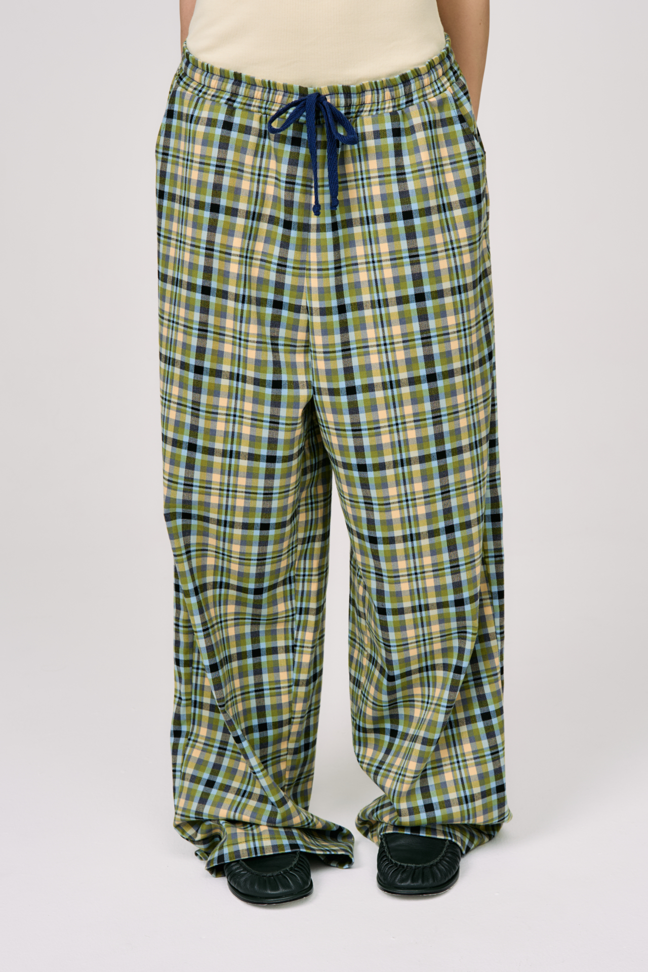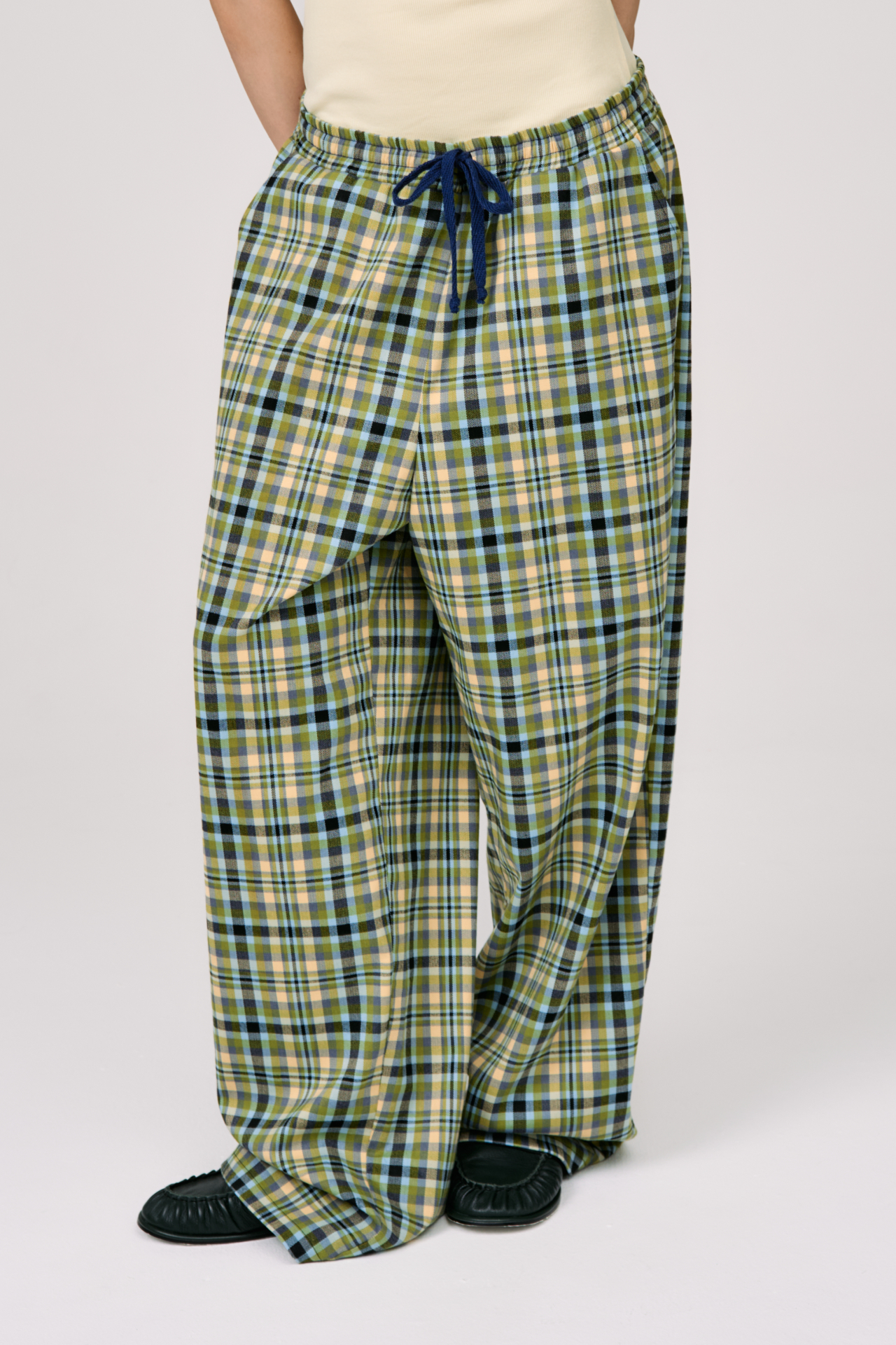 Клетка в мягких оттенках оливкового, голубого и кремового создаёт ощущение лёгкости и движения. Свободный силуэт и эластичный пояс с кулиской делают модель максимально комфортной — для города, поездок и состояний, где важна внутренняя свобода.