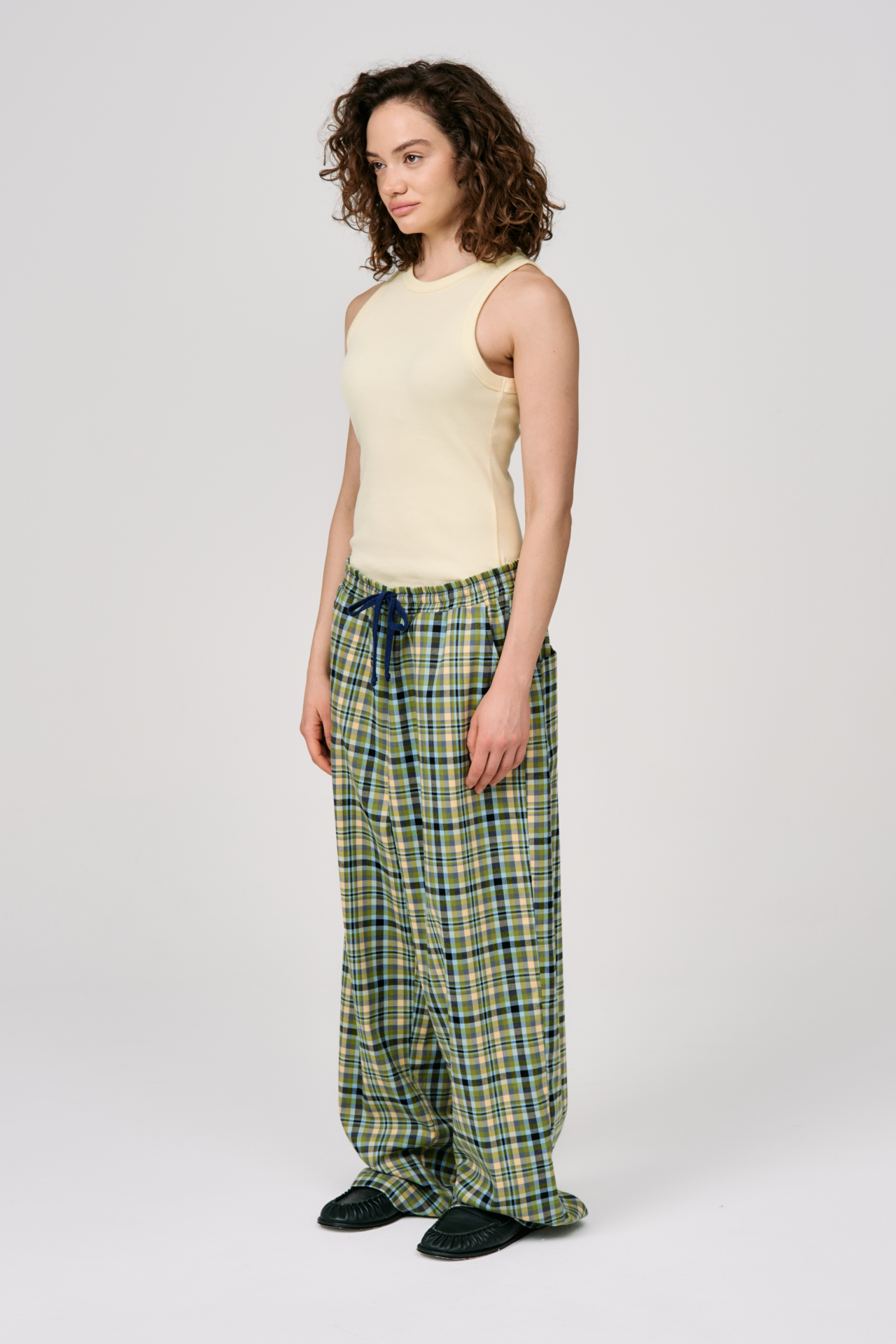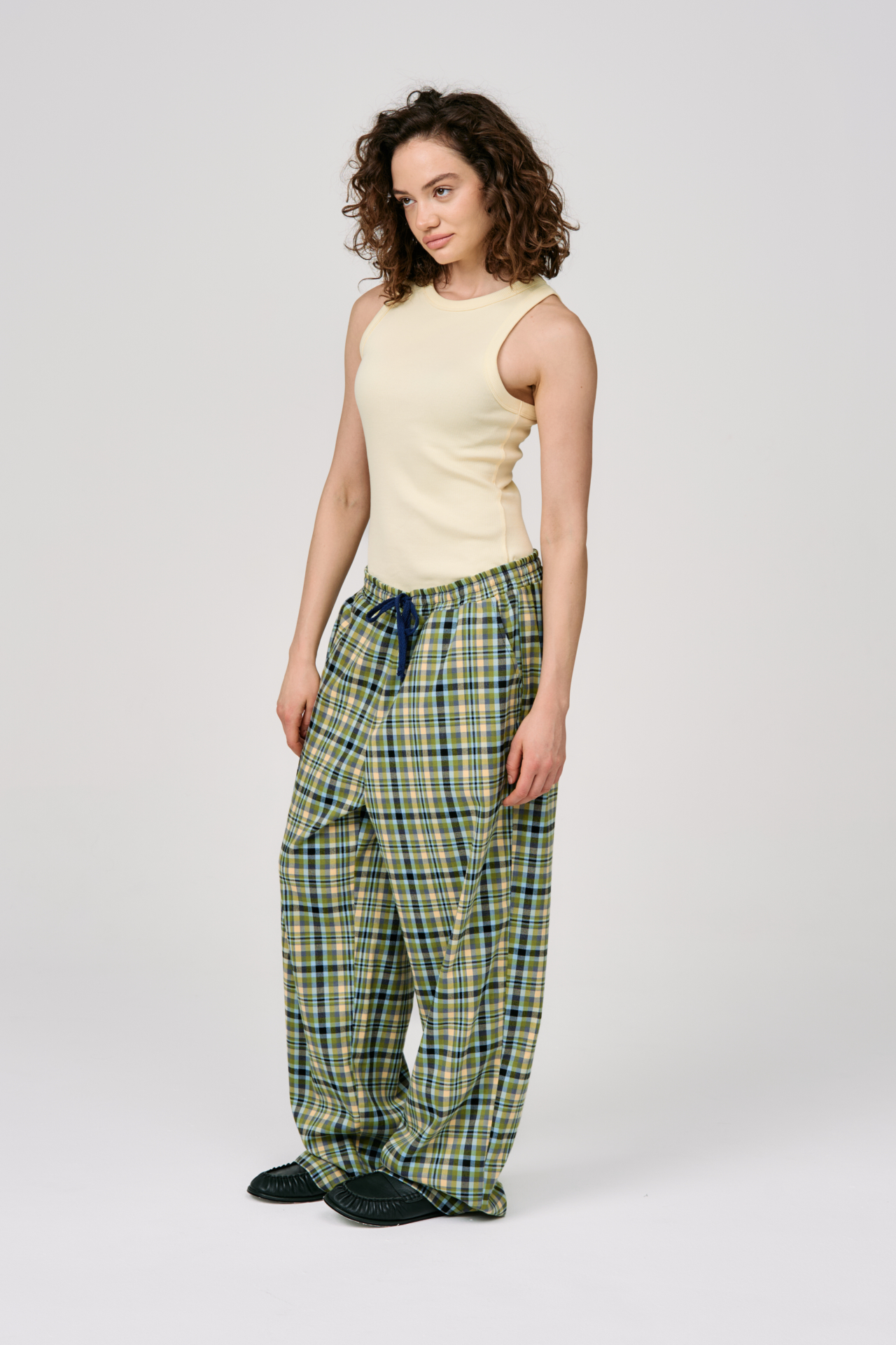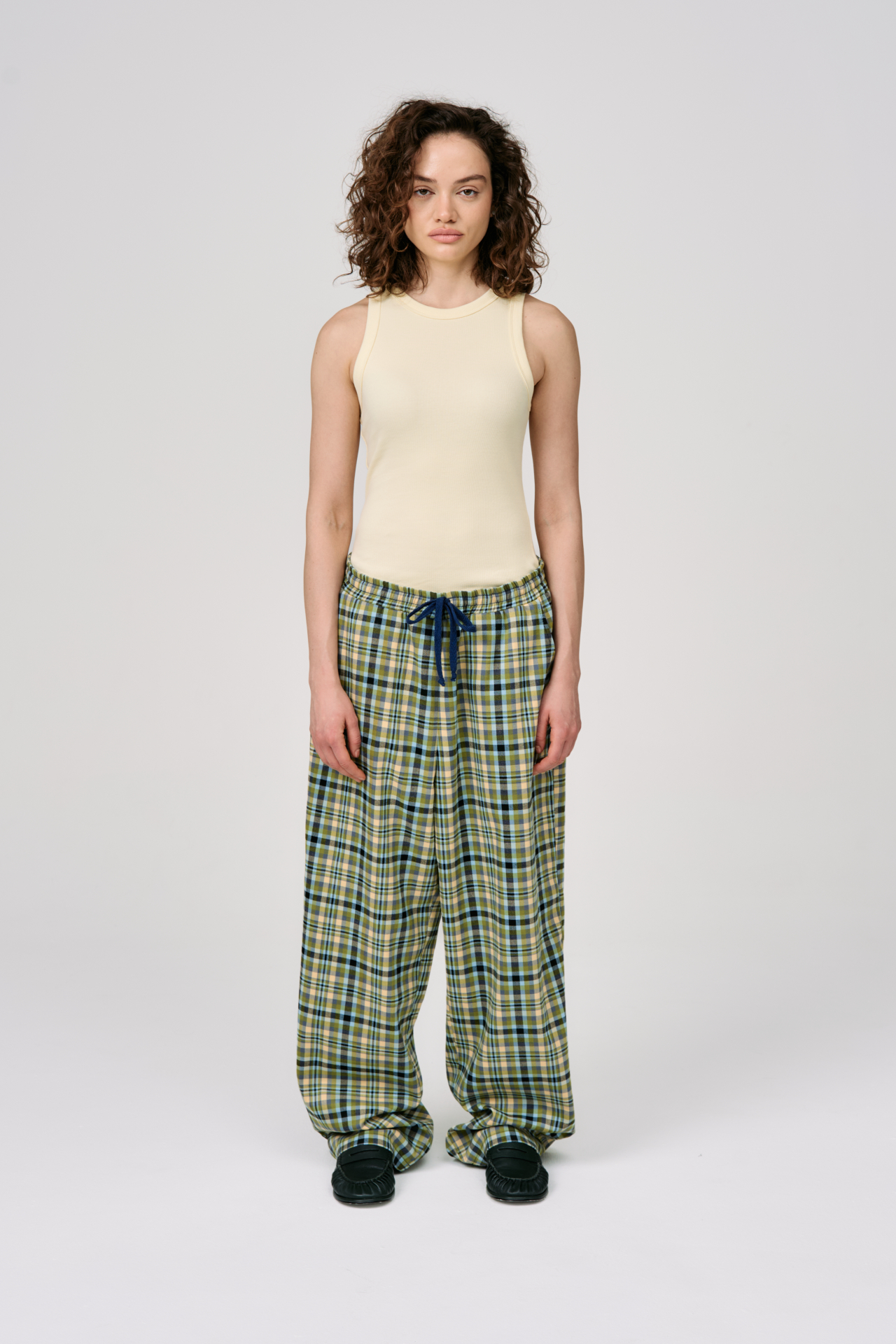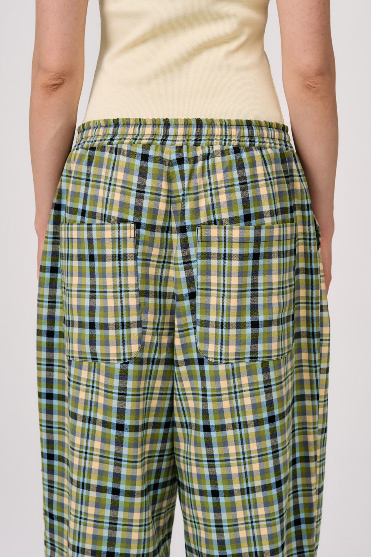 Клетка в мягких оттенках оливкового, голубого и кремового создаёт ощущение лёгкости и движения. Свободный силуэт и эластичный пояс с кулиской делают модель максимально комфортной — для города, поездок и состояний, где важна внутренняя свобода.