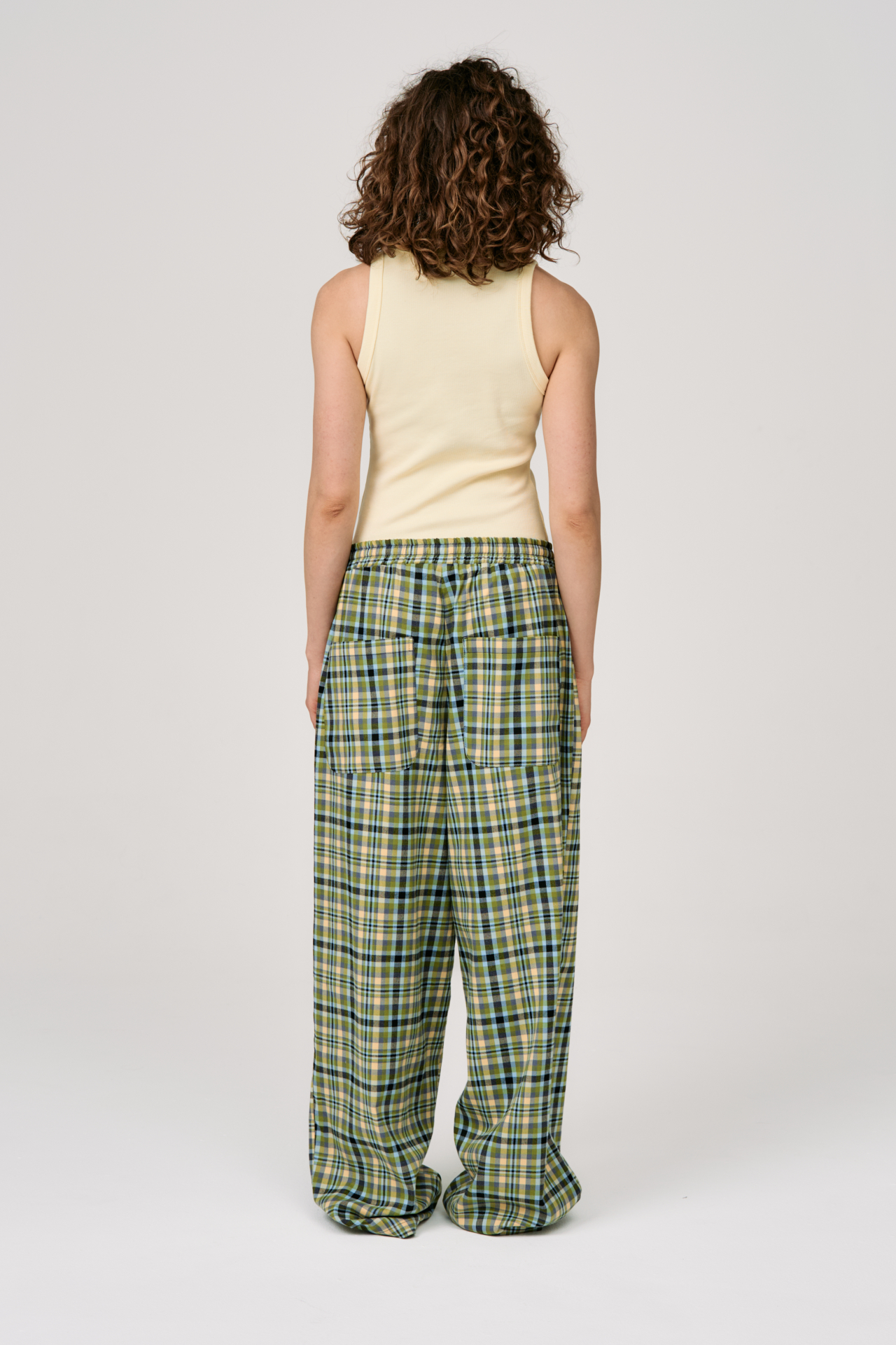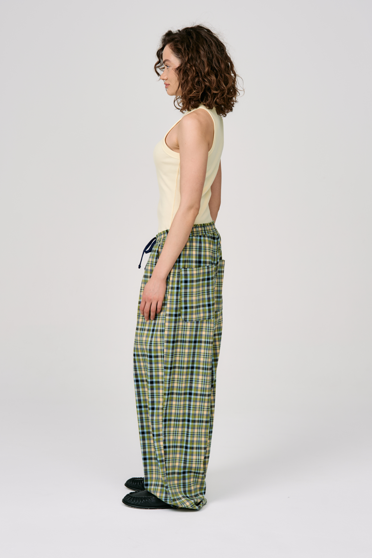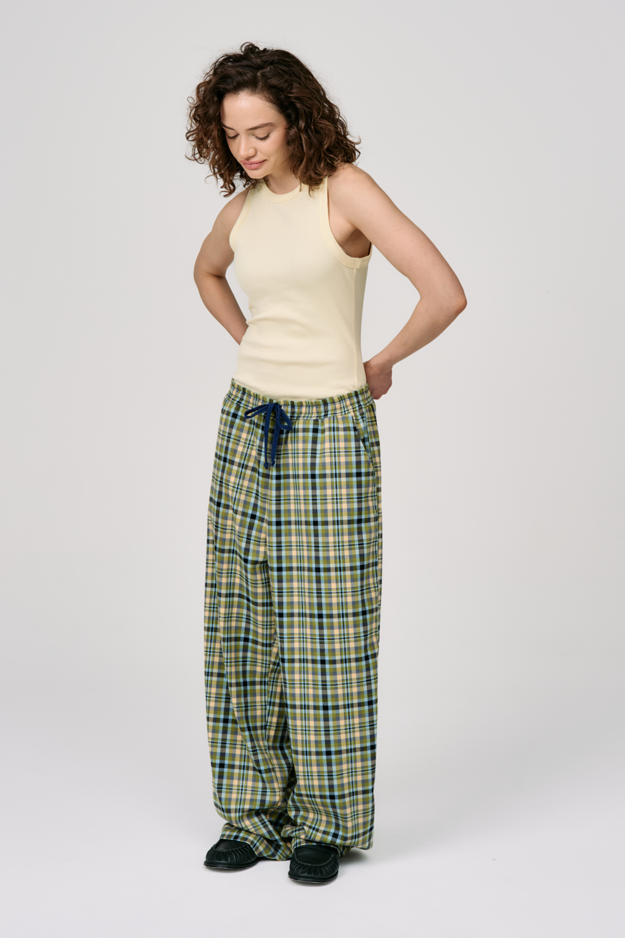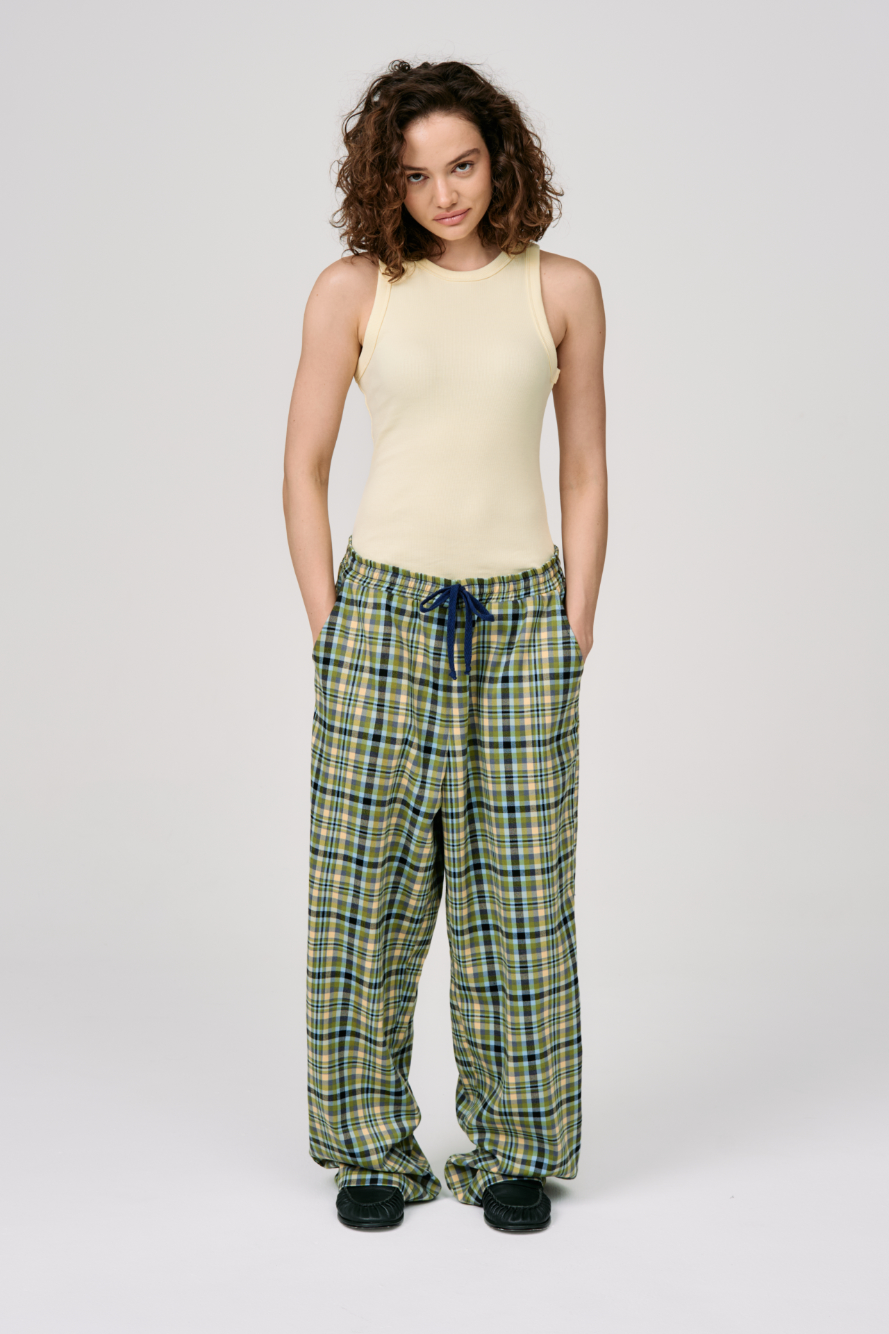 Клетка в мягких оттенках оливкового, голубого и кремового создаёт ощущение лёгкости и движения. Свободный силуэт и эластичный пояс с кулиской делают модель максимально комфортной — для города, поездок и состояний, где важна внутренняя свобода.