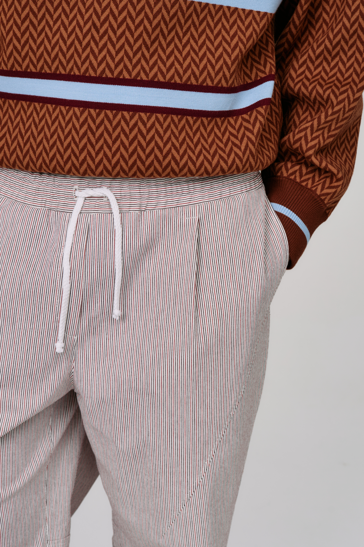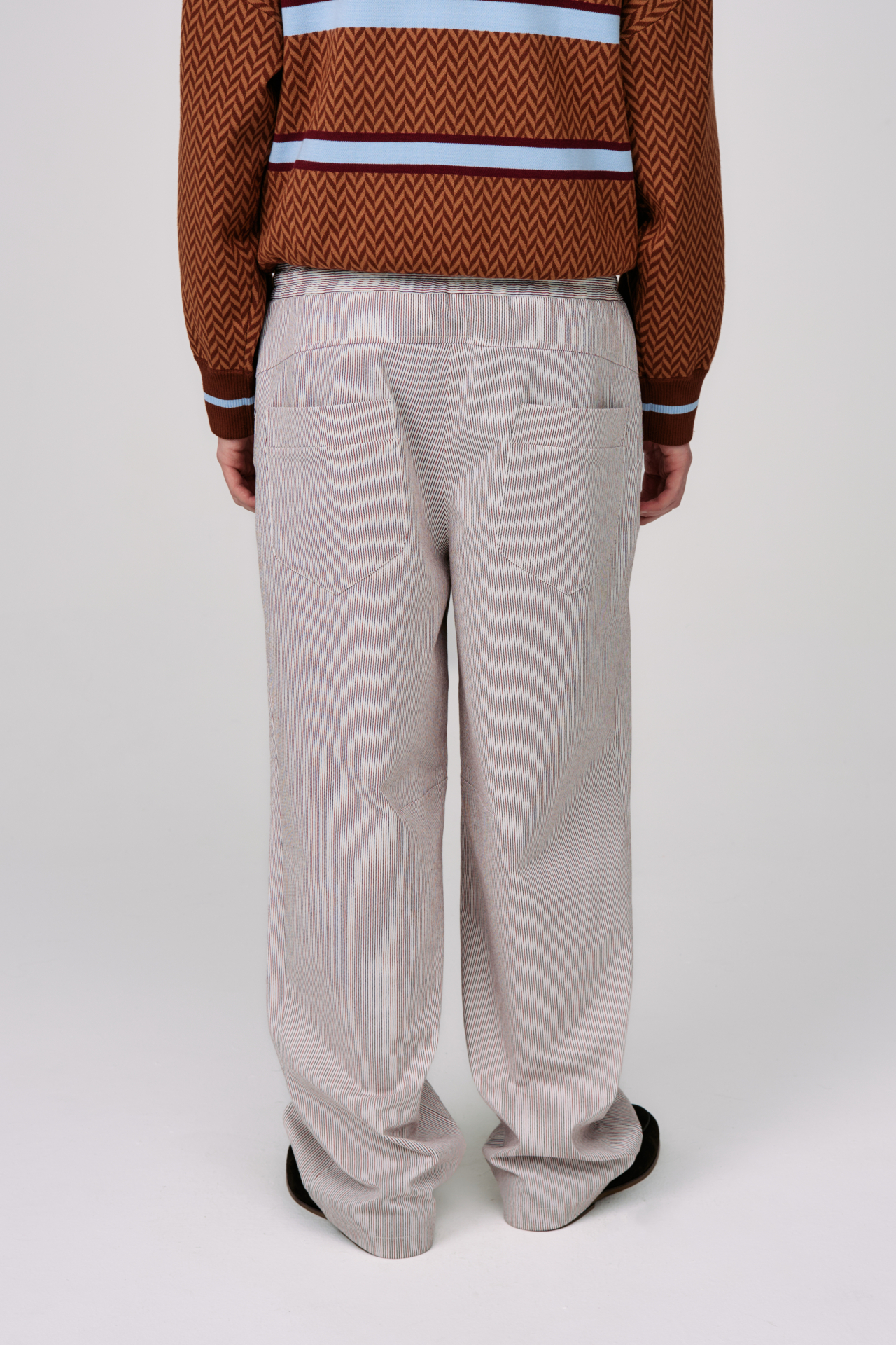 Тонкая вертикальная полоска визуально вытягивает силуэт, добавляя аккуратности и ритма. Хлопковая ткань с добавлением эластана сохраняет форму, оставаясь мягкой и комфортной в течение дня.