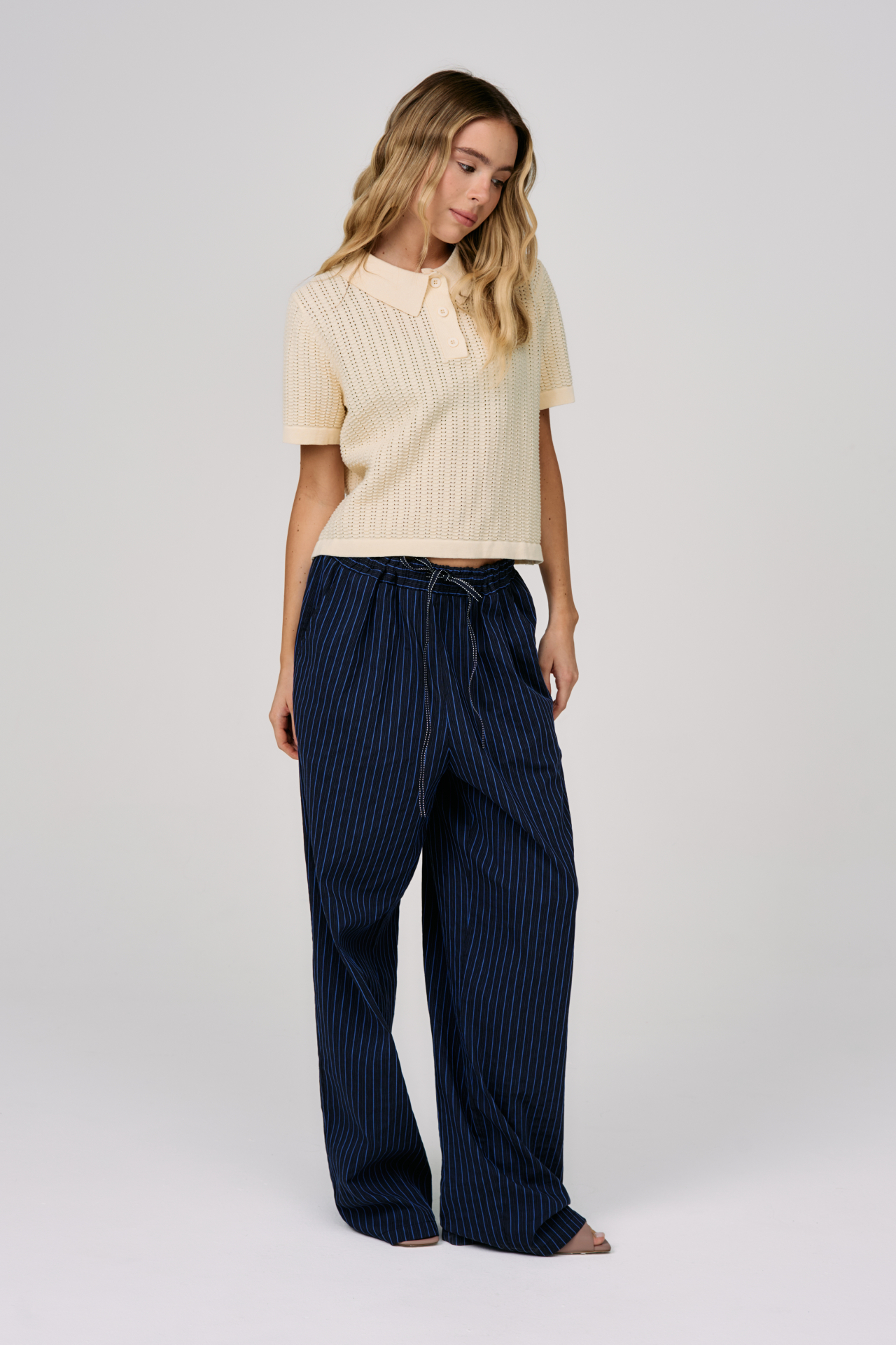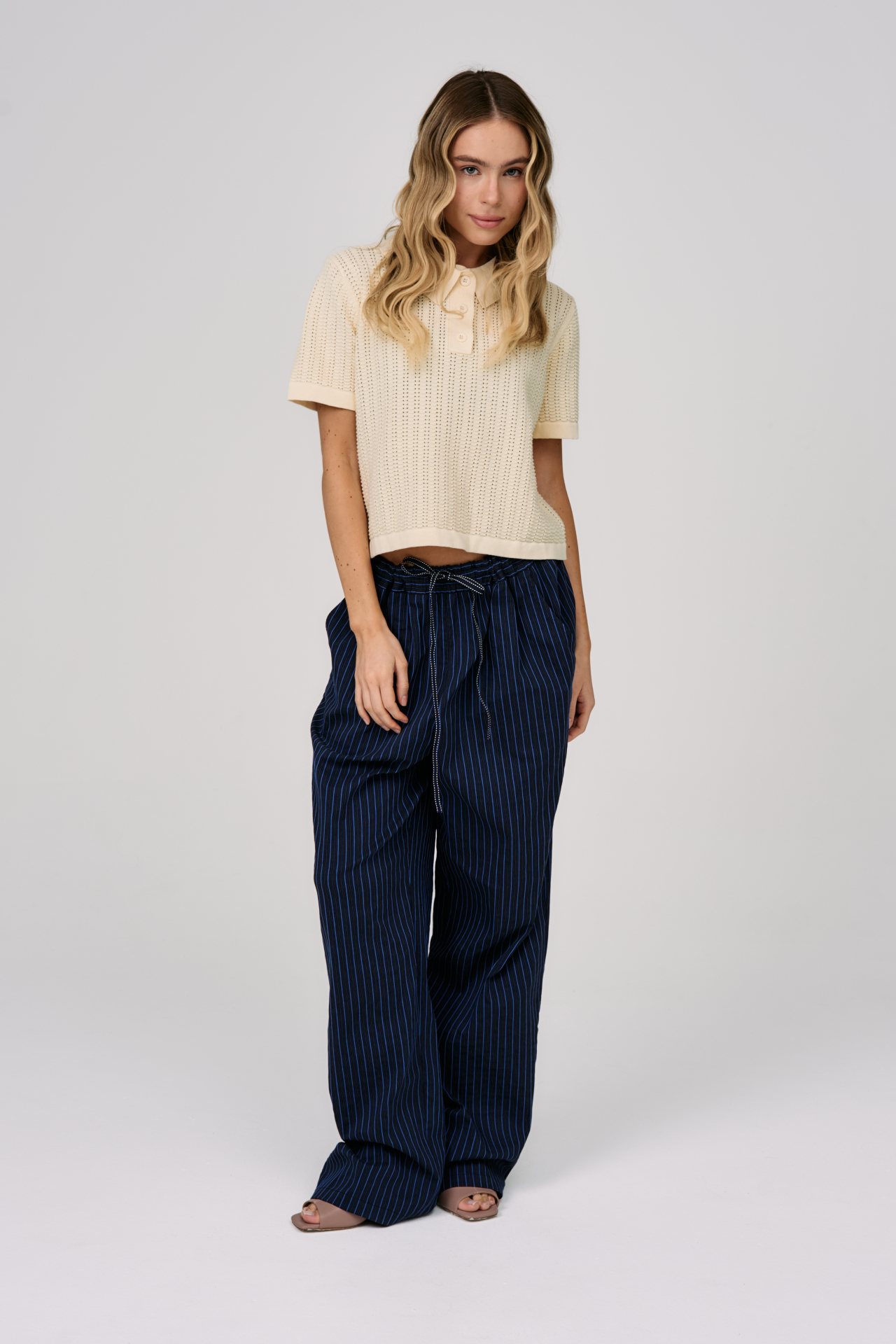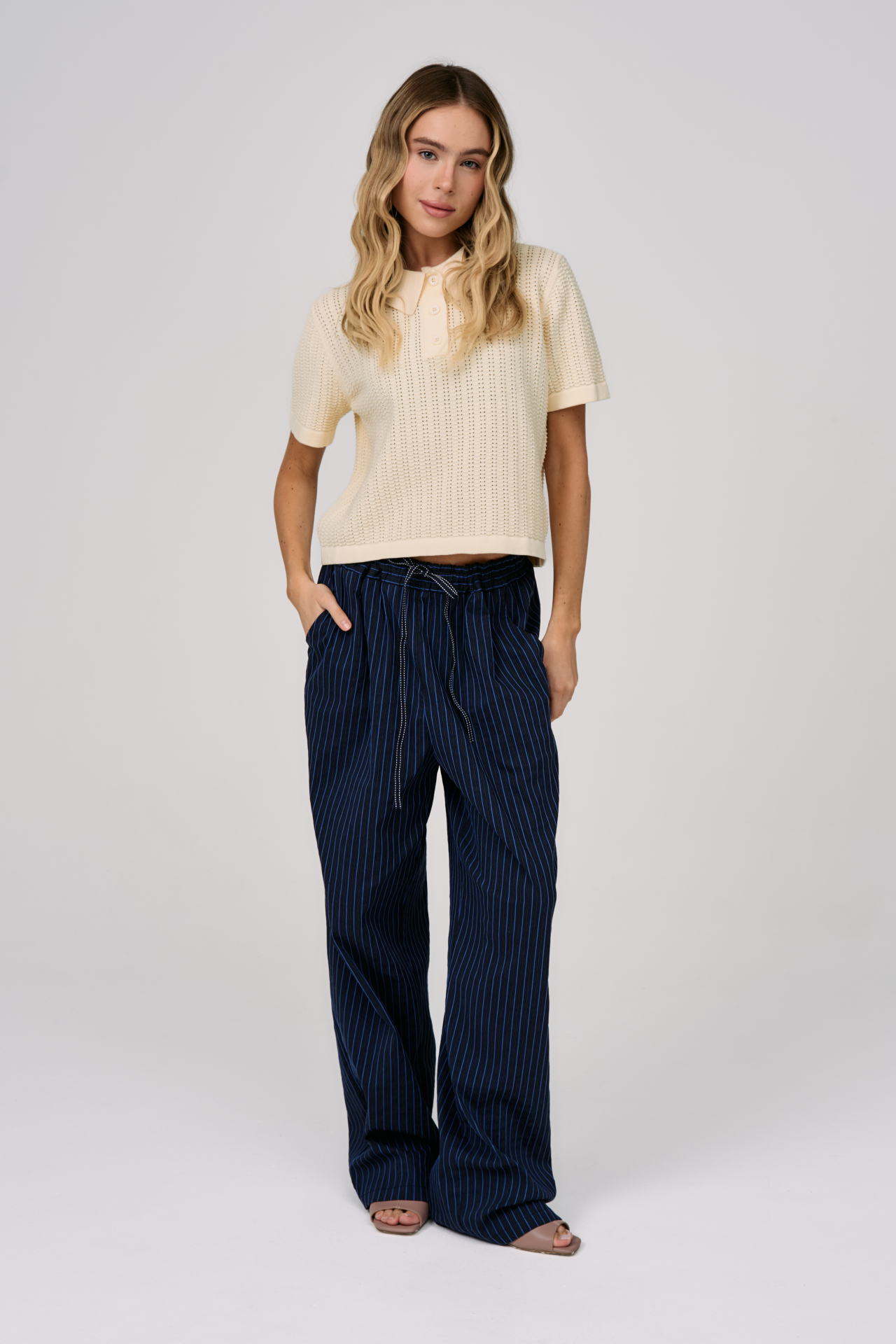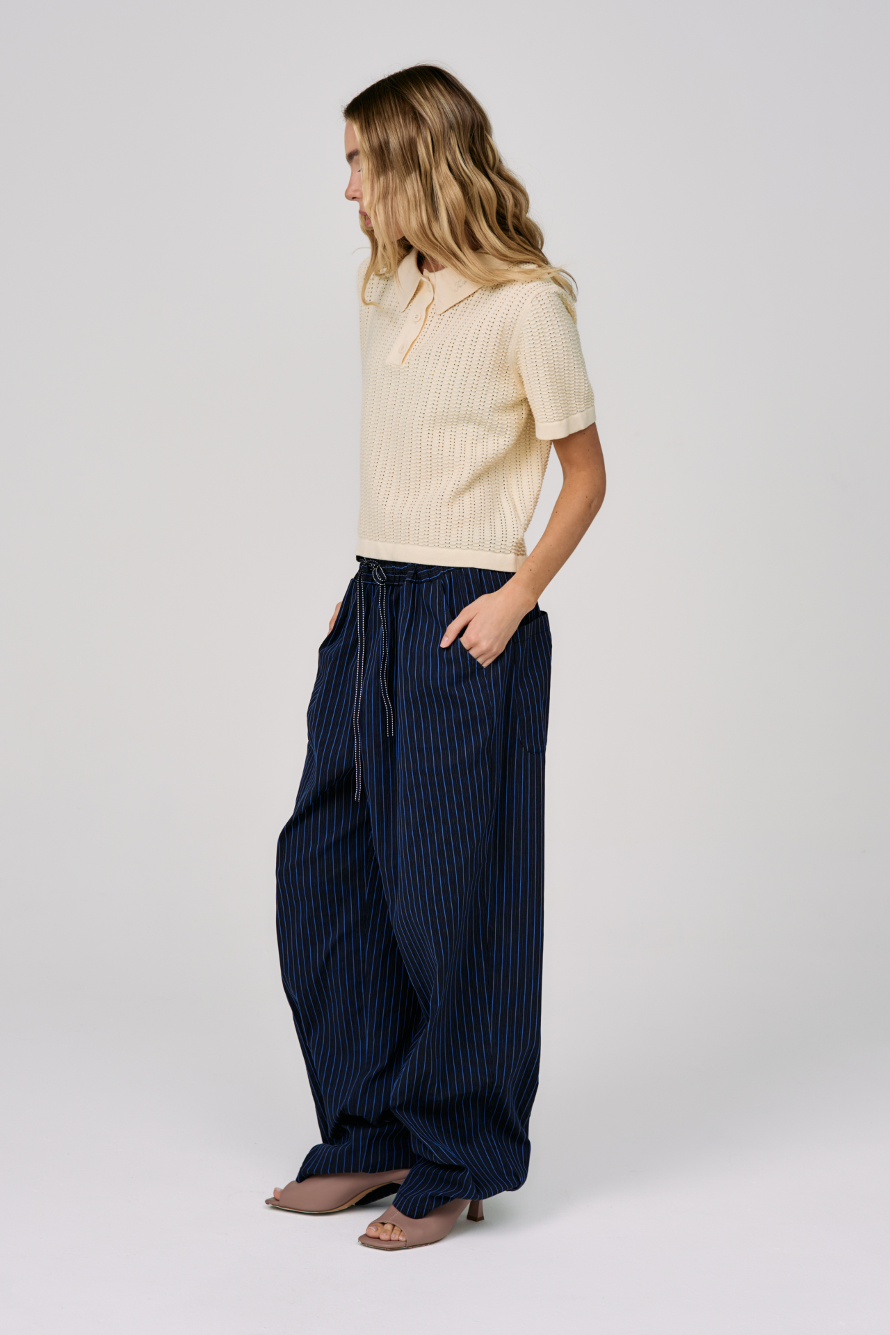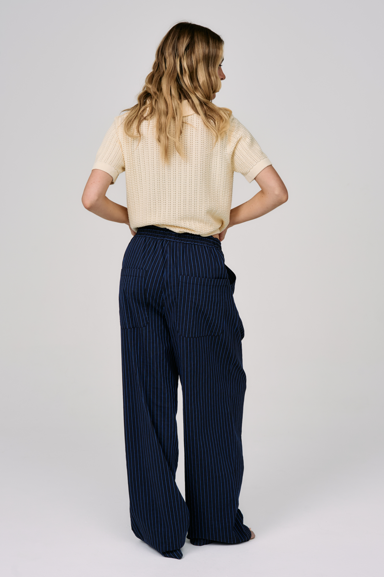 Вертикальная полоска визуально вытягивает силуэт и добавляет графичности, а глубокий тёмно-синий оттенок делает образ уверенным и сдержанным. Свободный крой и эластичный пояс с кулиской сохраняют комфорт, позволяя двигаться легко, оставаясь в аккуратной форме.