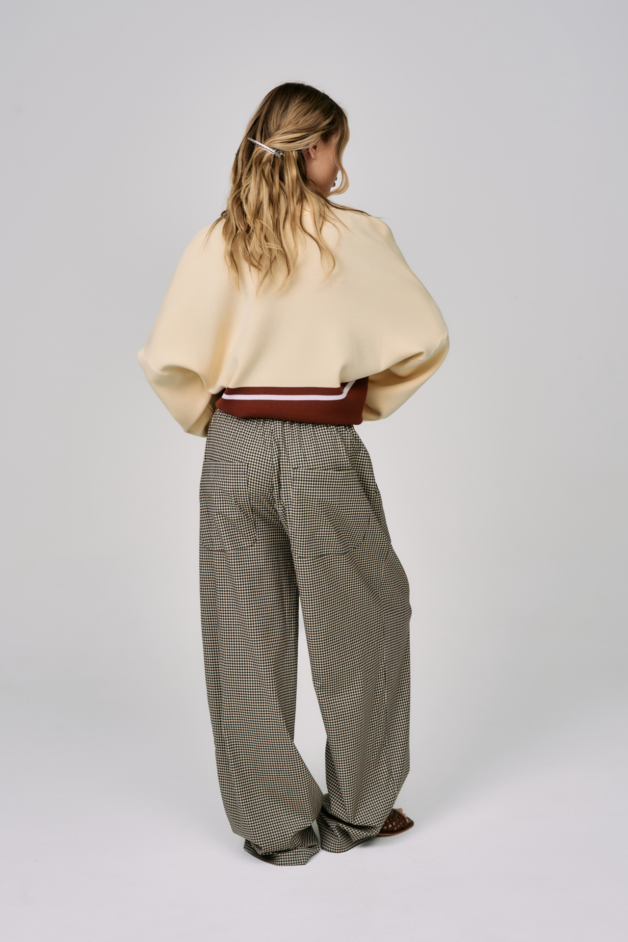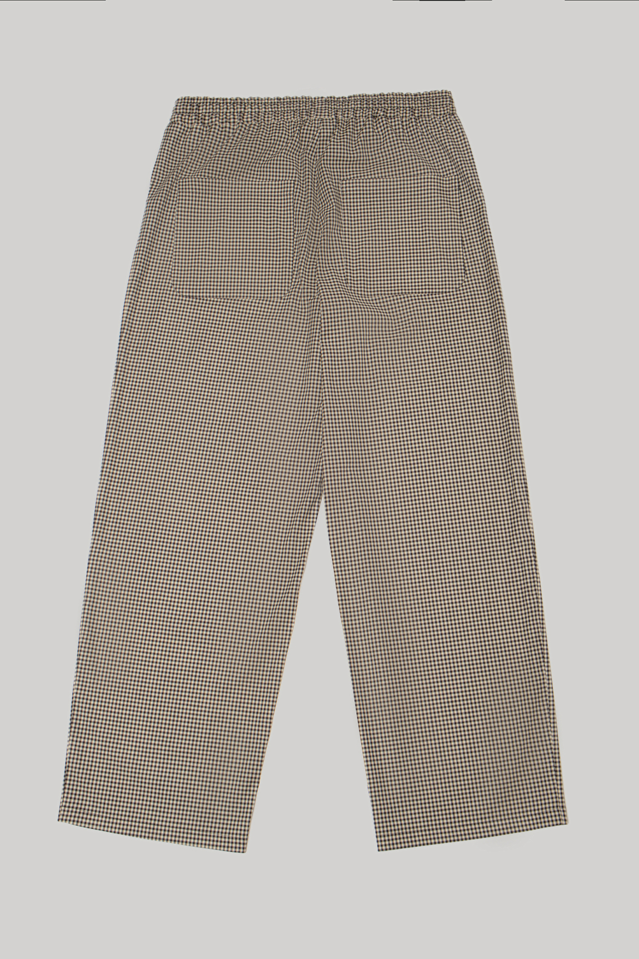 Мелкая клетка в тёплой, сдержанной палитре создаёт ощущение глубины и интеллигентной простоты. Свободный силуэт и эластичный пояс с кулиской дают естественную свободу движения, сохраняя аккуратную, собранную форму.