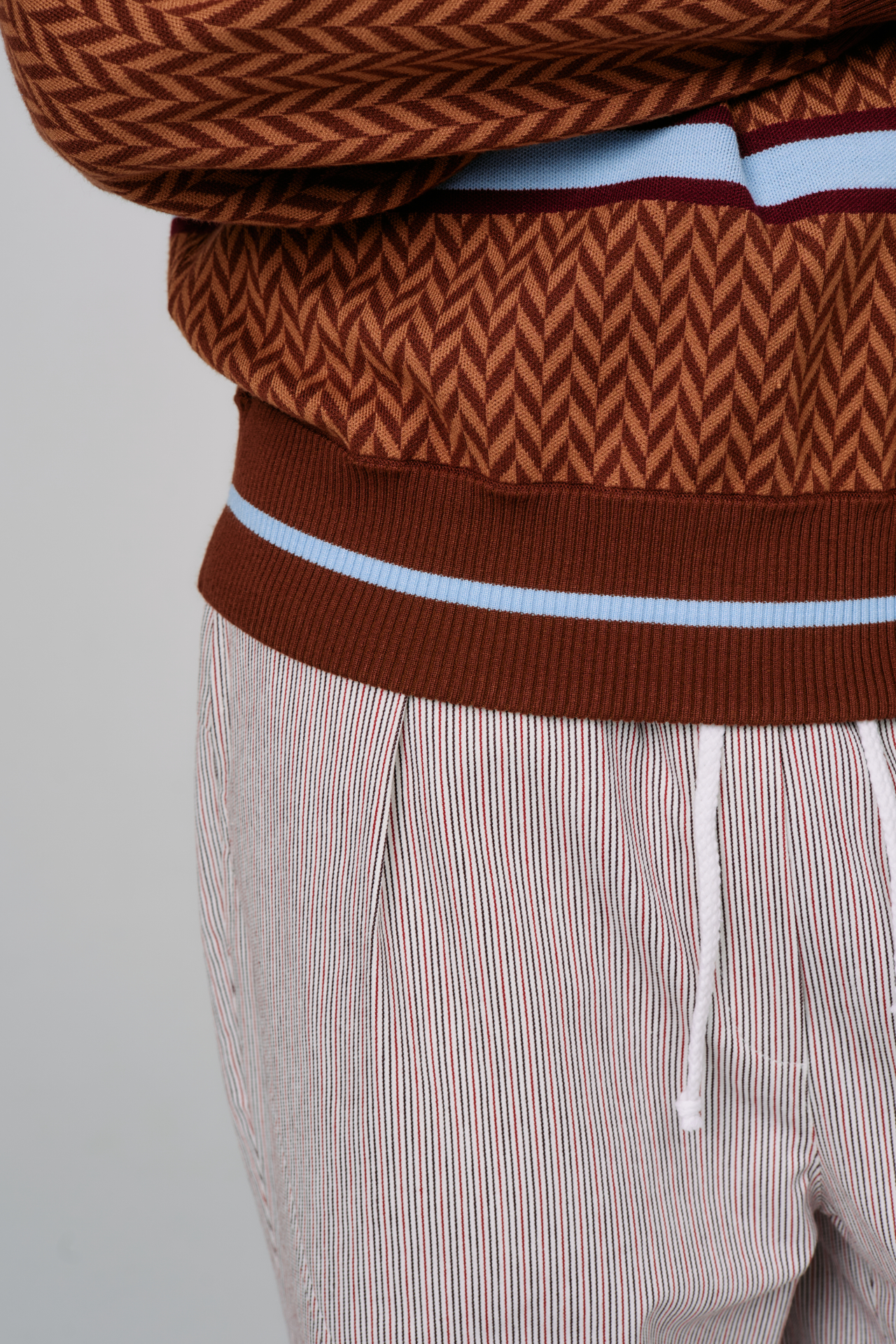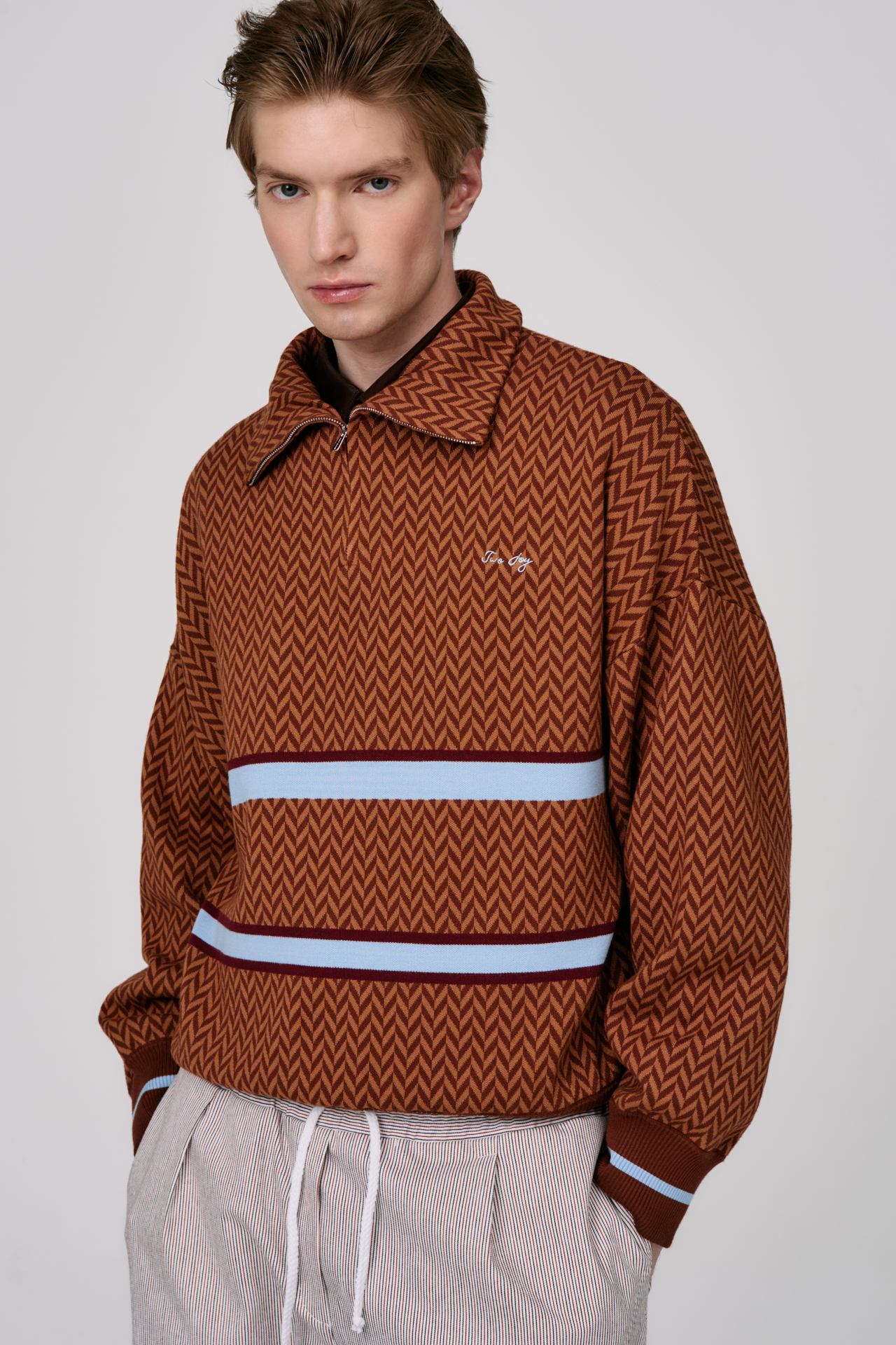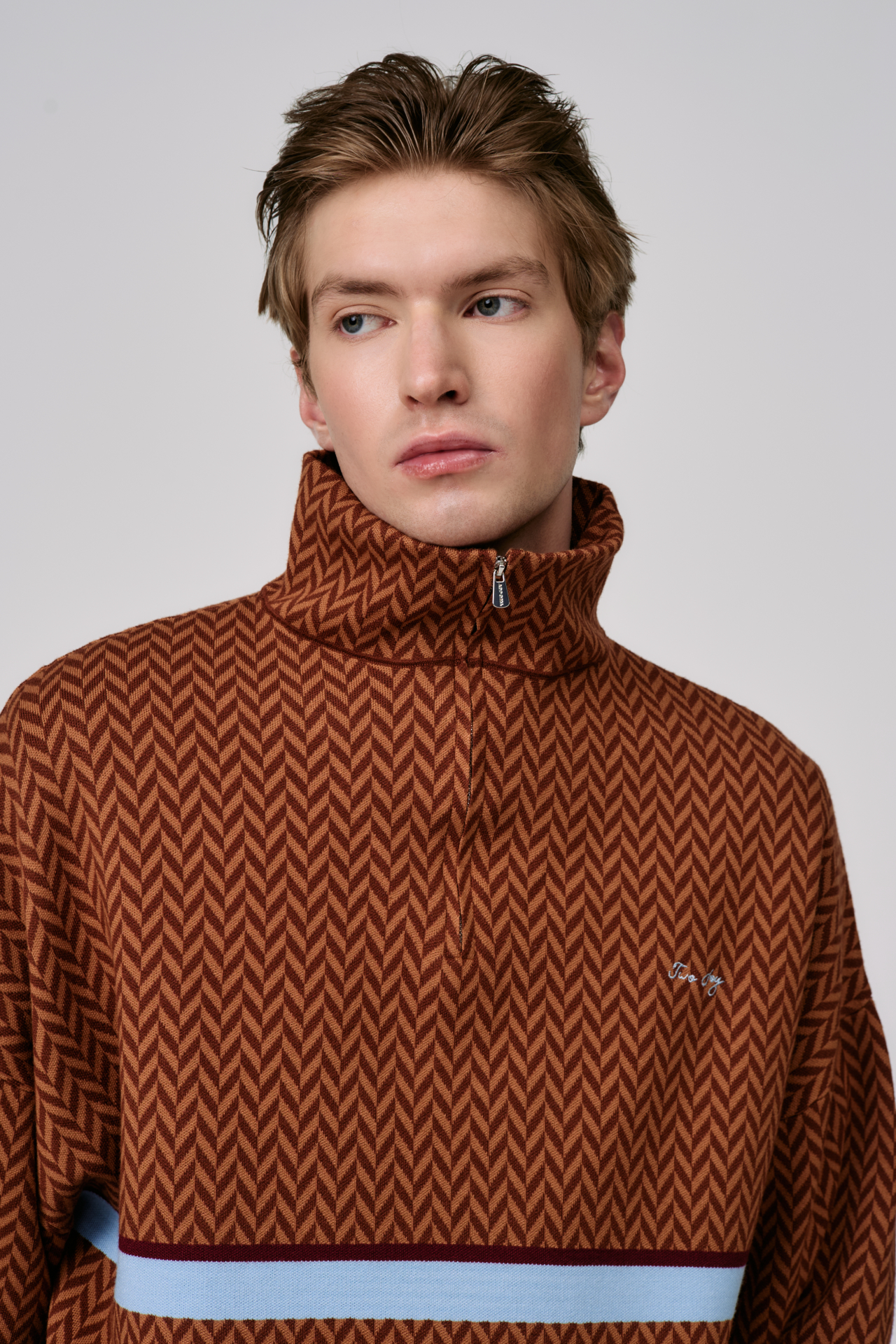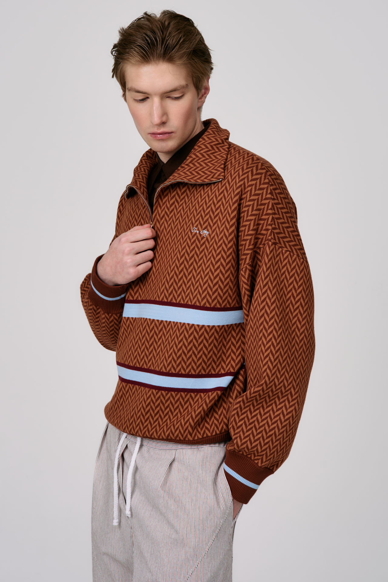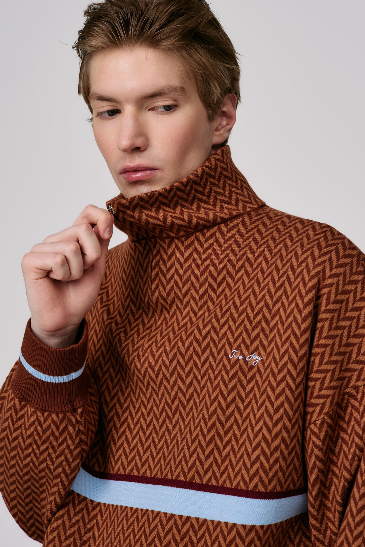Джемпер Chocolate Beat вдохновлён эстетикой винтажной спортивной одежды и университетского стиля 70–80-х годов. Фактурный узор «ёлочка» формирует выразительный графический ритм, а контрастные полосы добавляют динамику и характер.