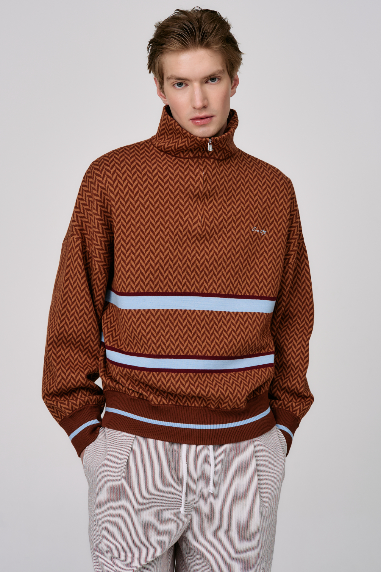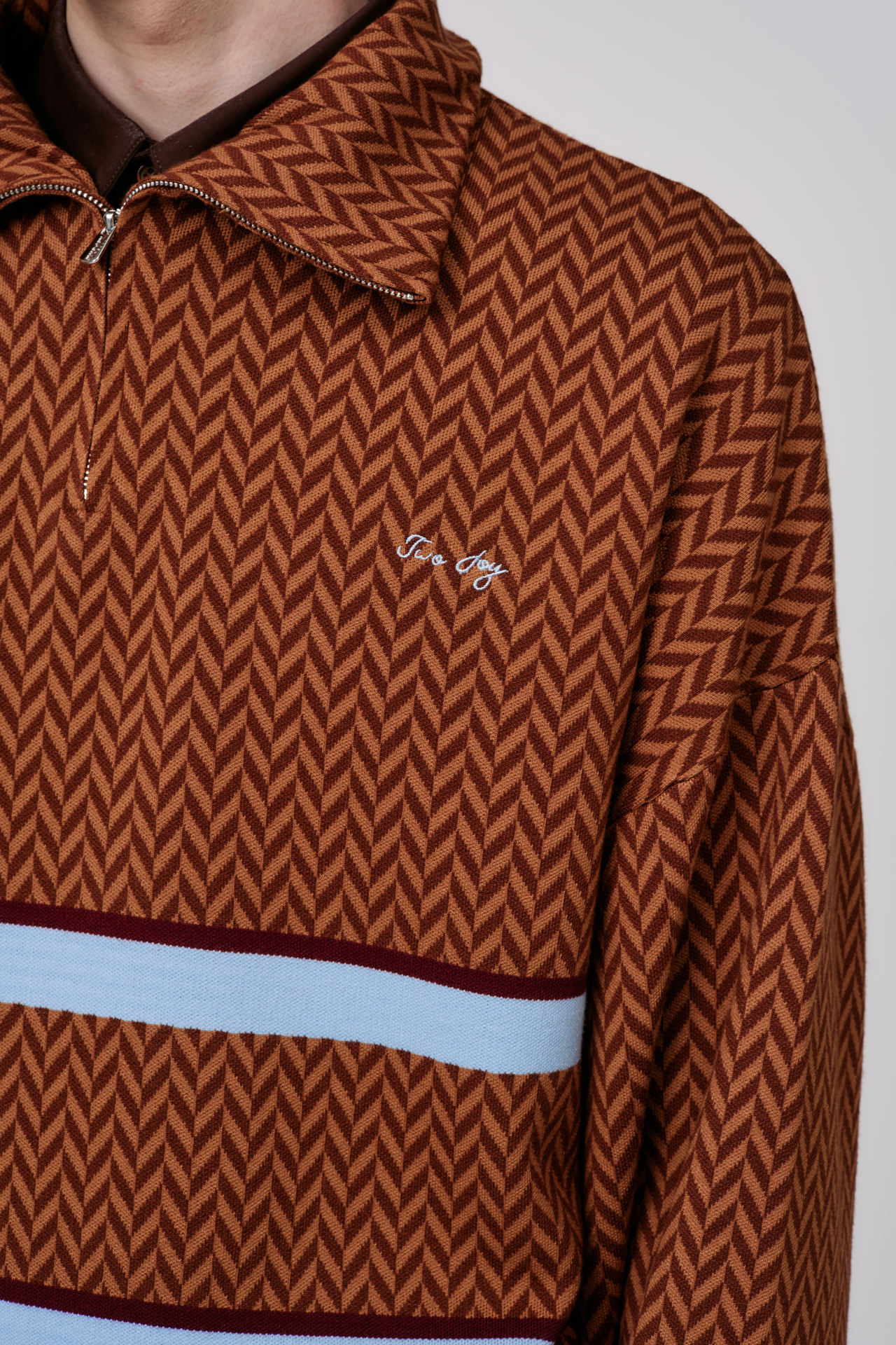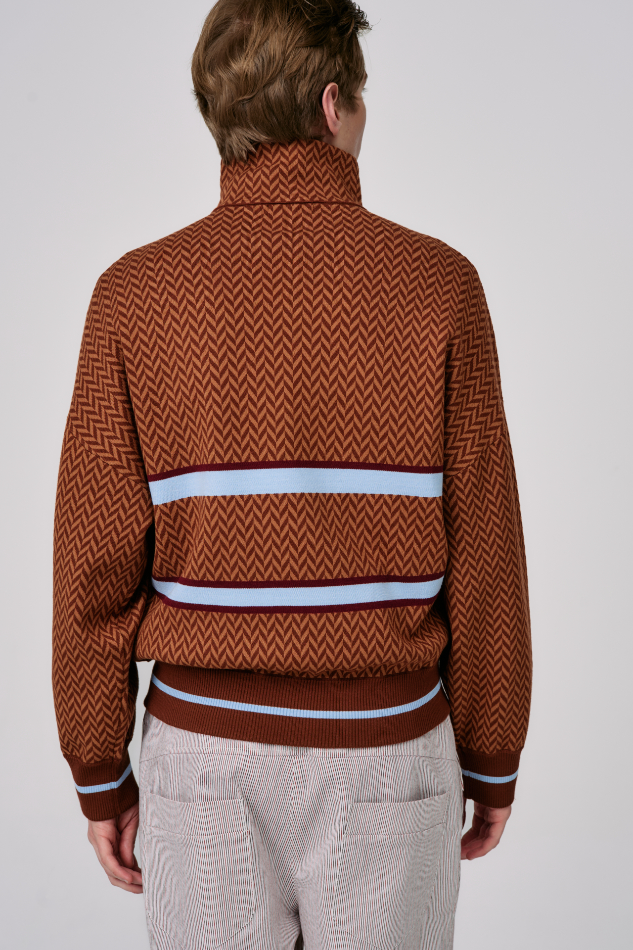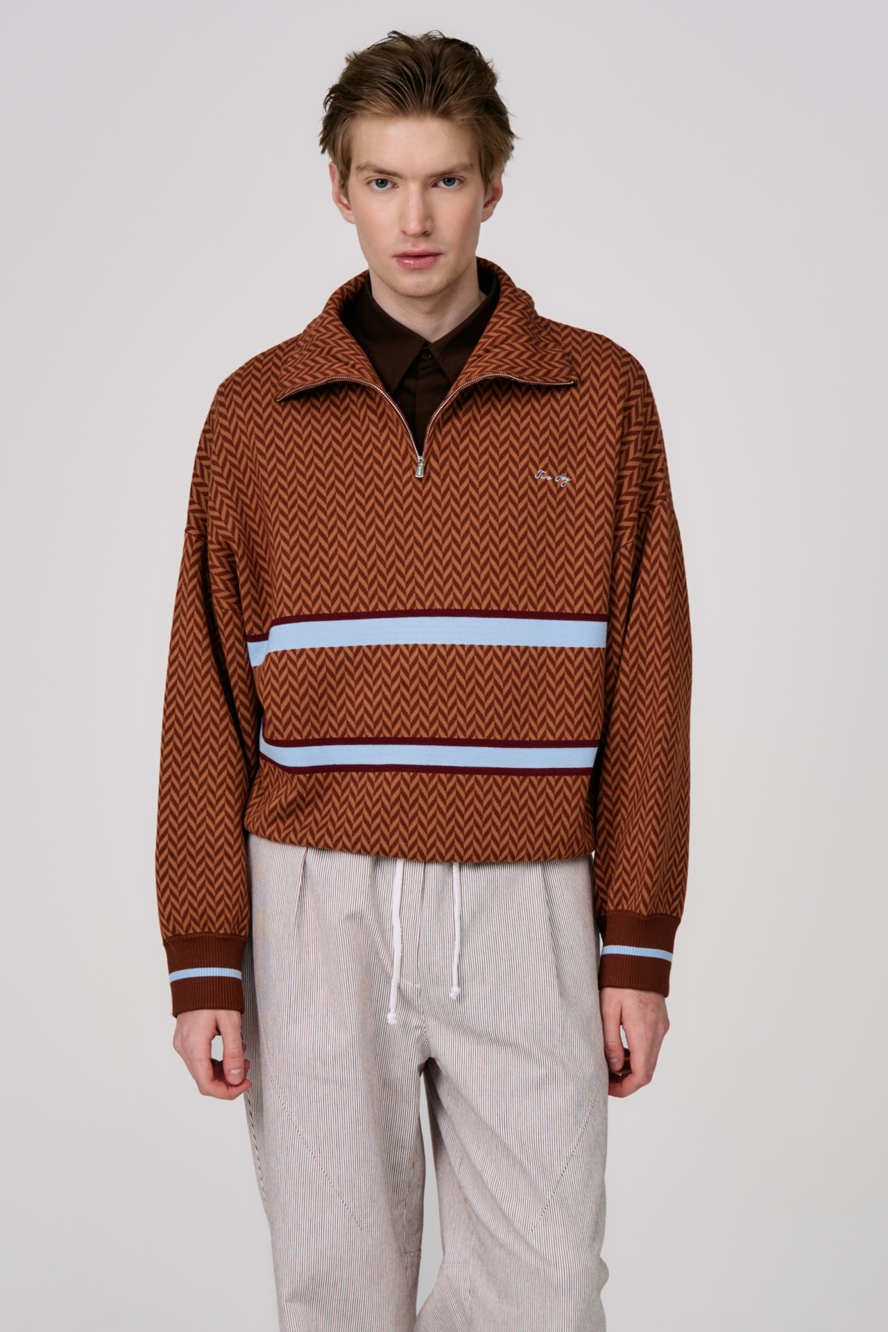Джемпер Chocolate Beat вдохновлён эстетикой винтажной спортивной одежды и университетского стиля 70–80-х годов. Фактурный узор «ёлочка» формирует выразительный графический ритм, а контрастные полосы добавляют динамику и характер.