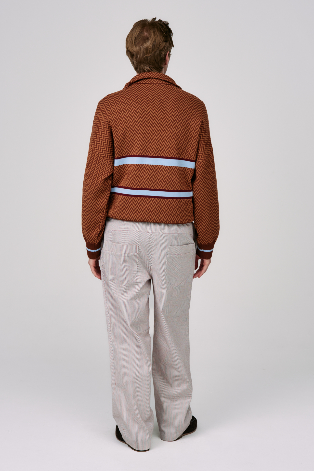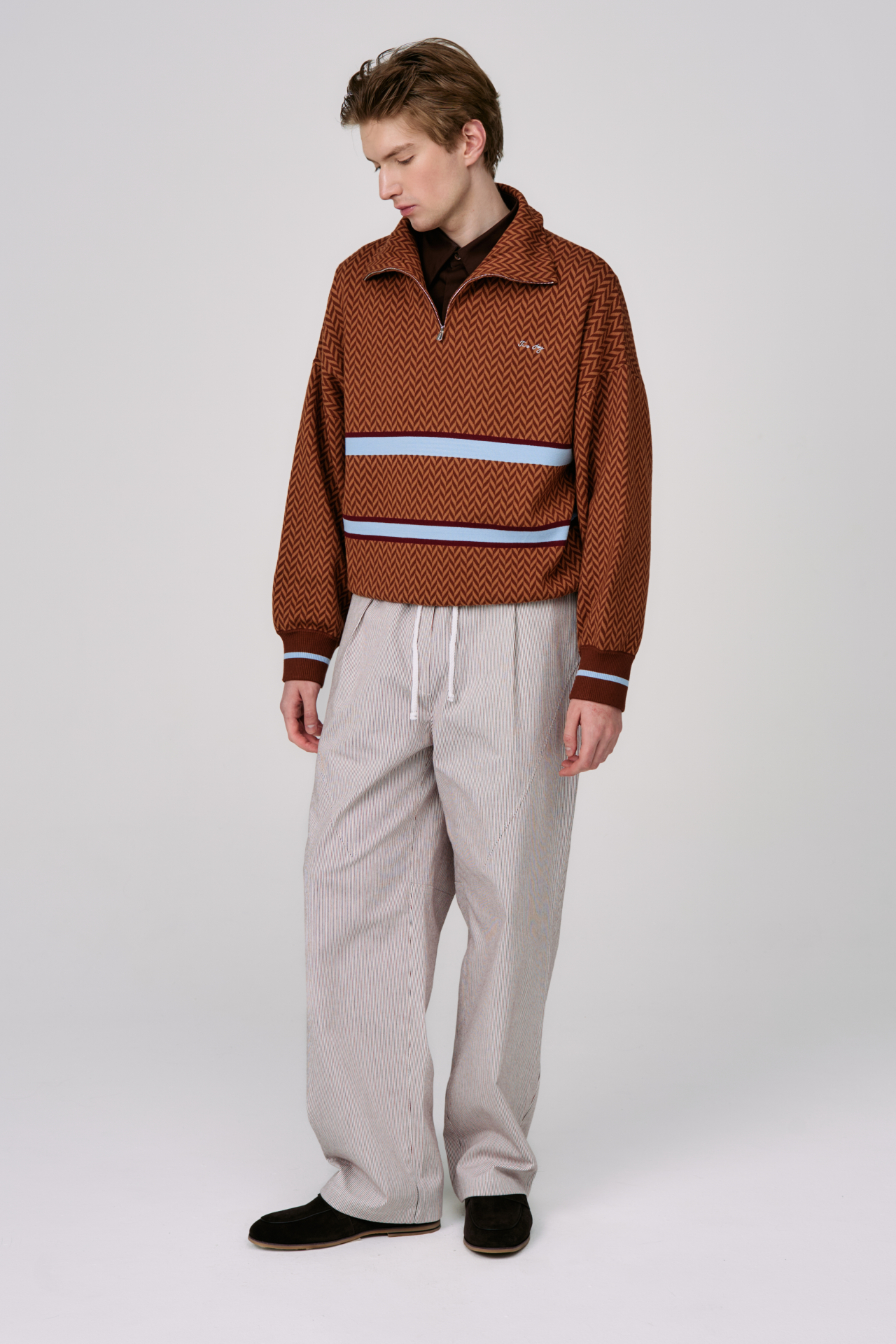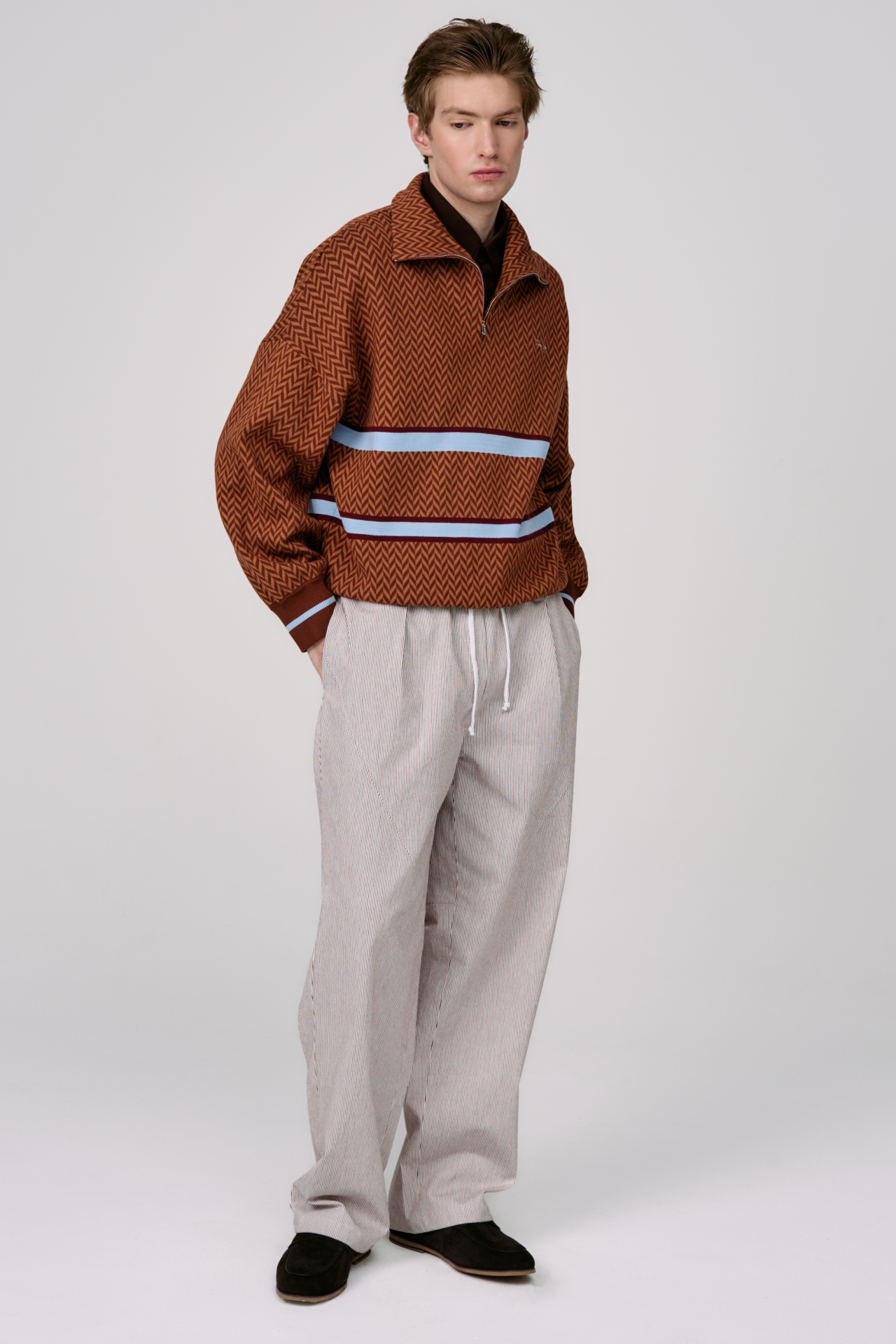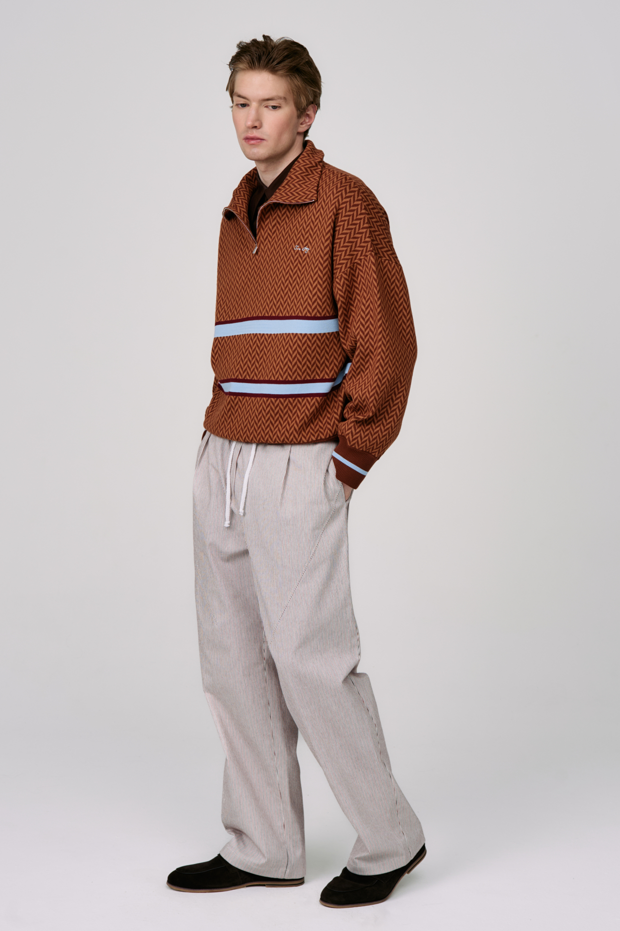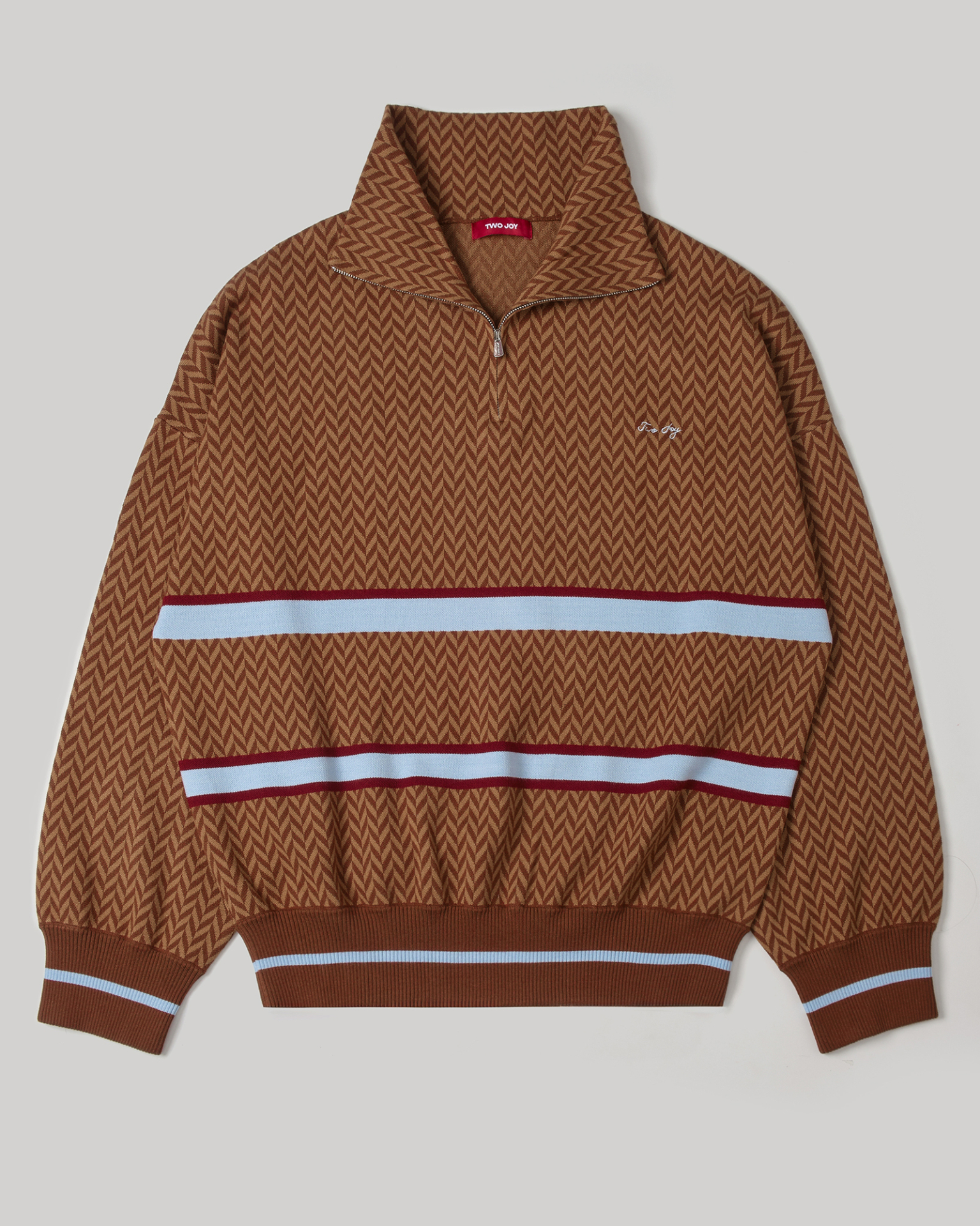 Джемпер Chocolate Beat вдохновлён эстетикой винтажной спортивной одежды и университетского стиля 70–80-х годов. Фактурный узор «ёлочка» формирует выразительный графический ритм, а контрастные полосы добавляют динамику и характер.