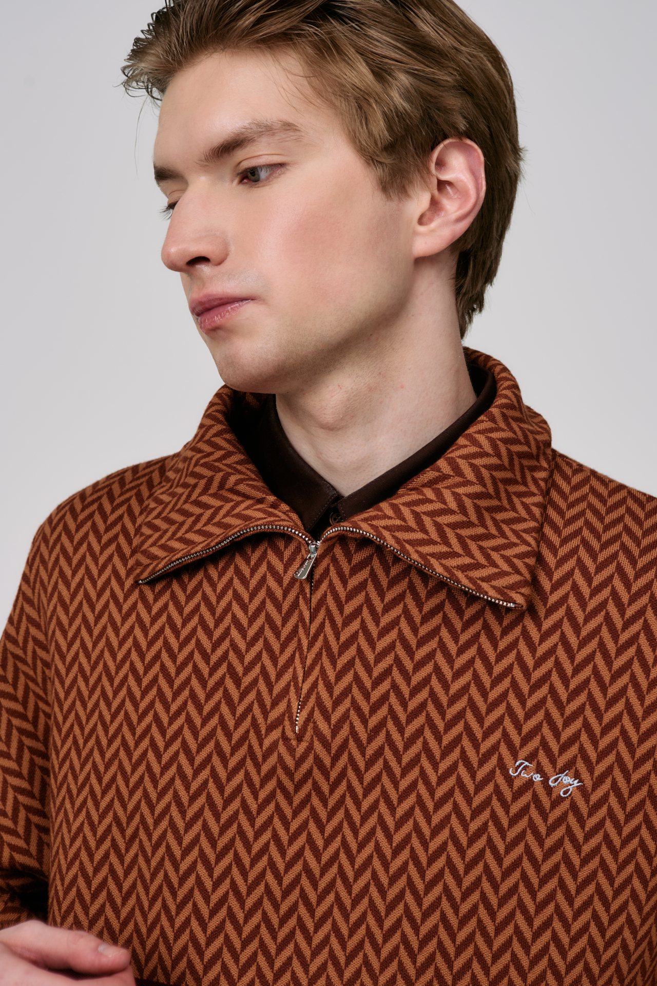 Свободный силуэт и воротник на молнии создают ощущение комфорта и лёгкой непринуждённости. Насыщенный шоколадный оттенок придаёт модели тёплый и глубокий характер, делая джемпер выразительным элементом гардероба.