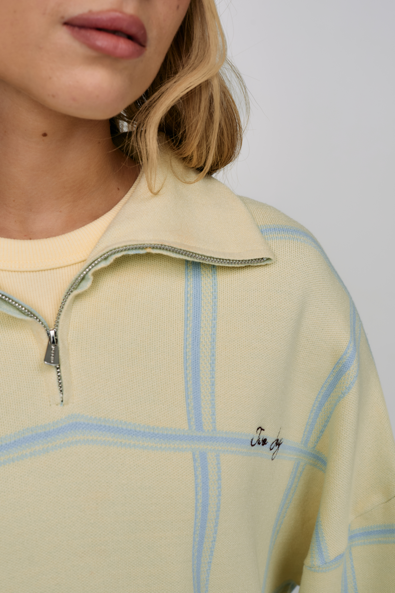 Свободный силуэт, мягкая линия плеча и воротник на молнии добавляют образу непринуждённости и современного преппи-настроения.