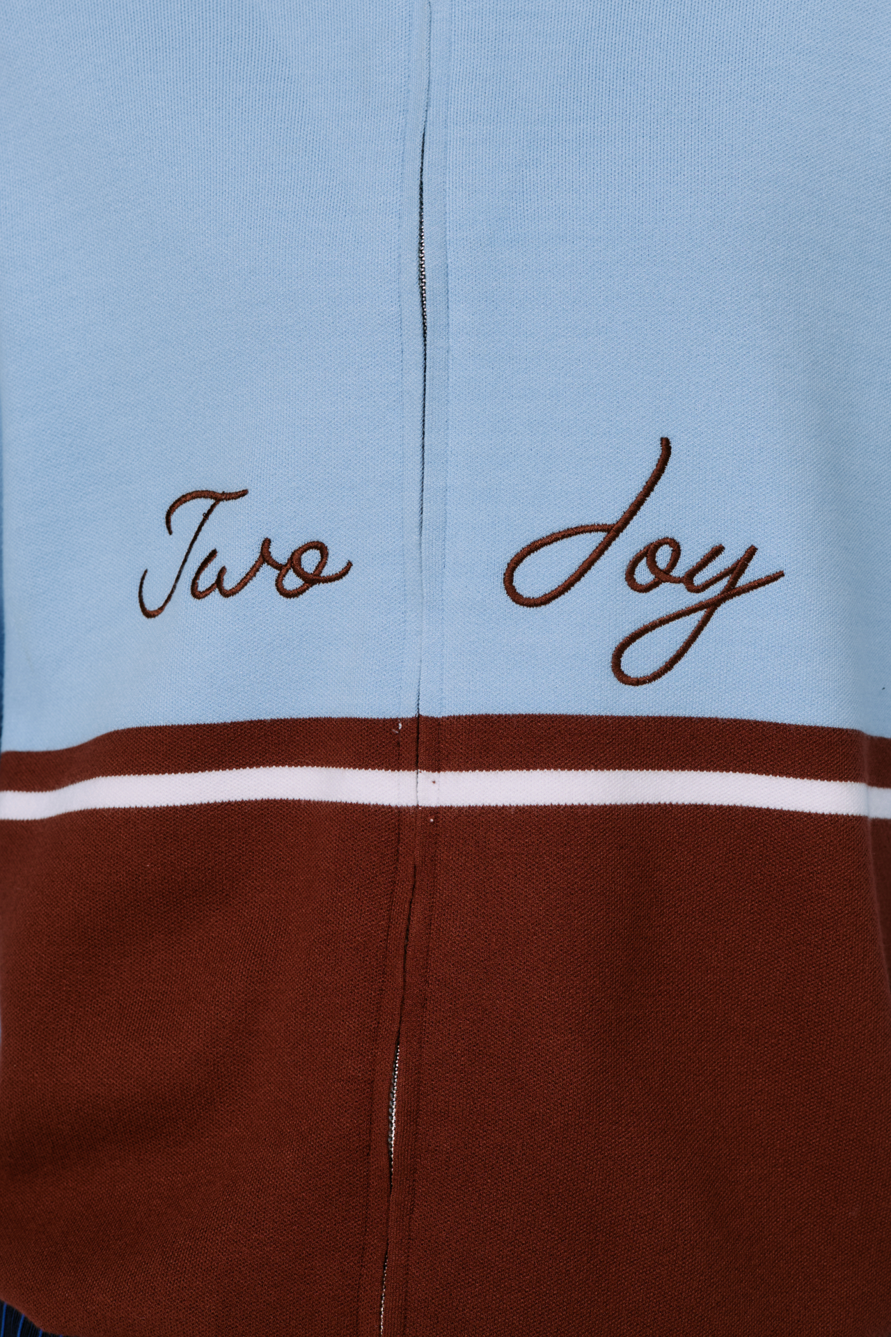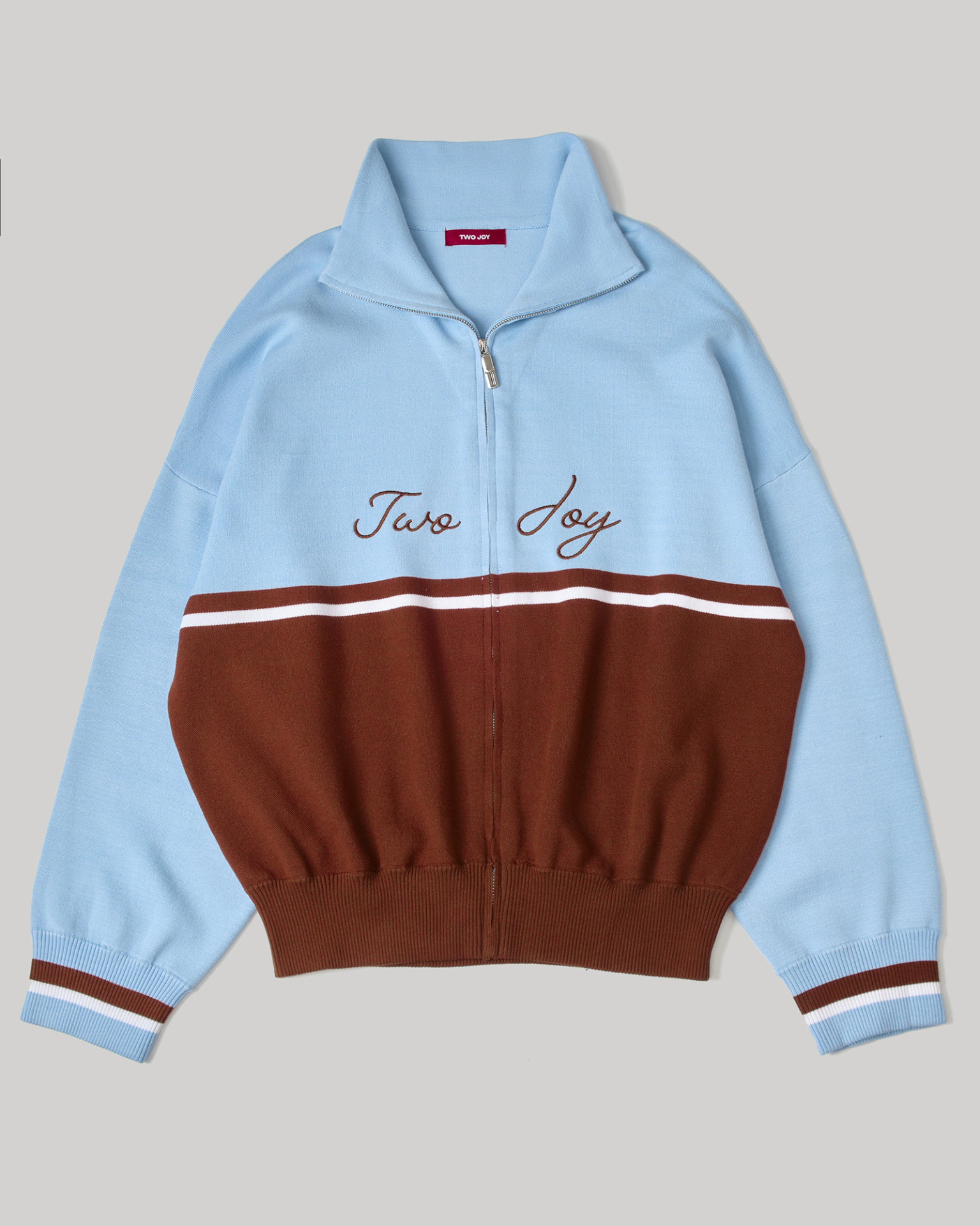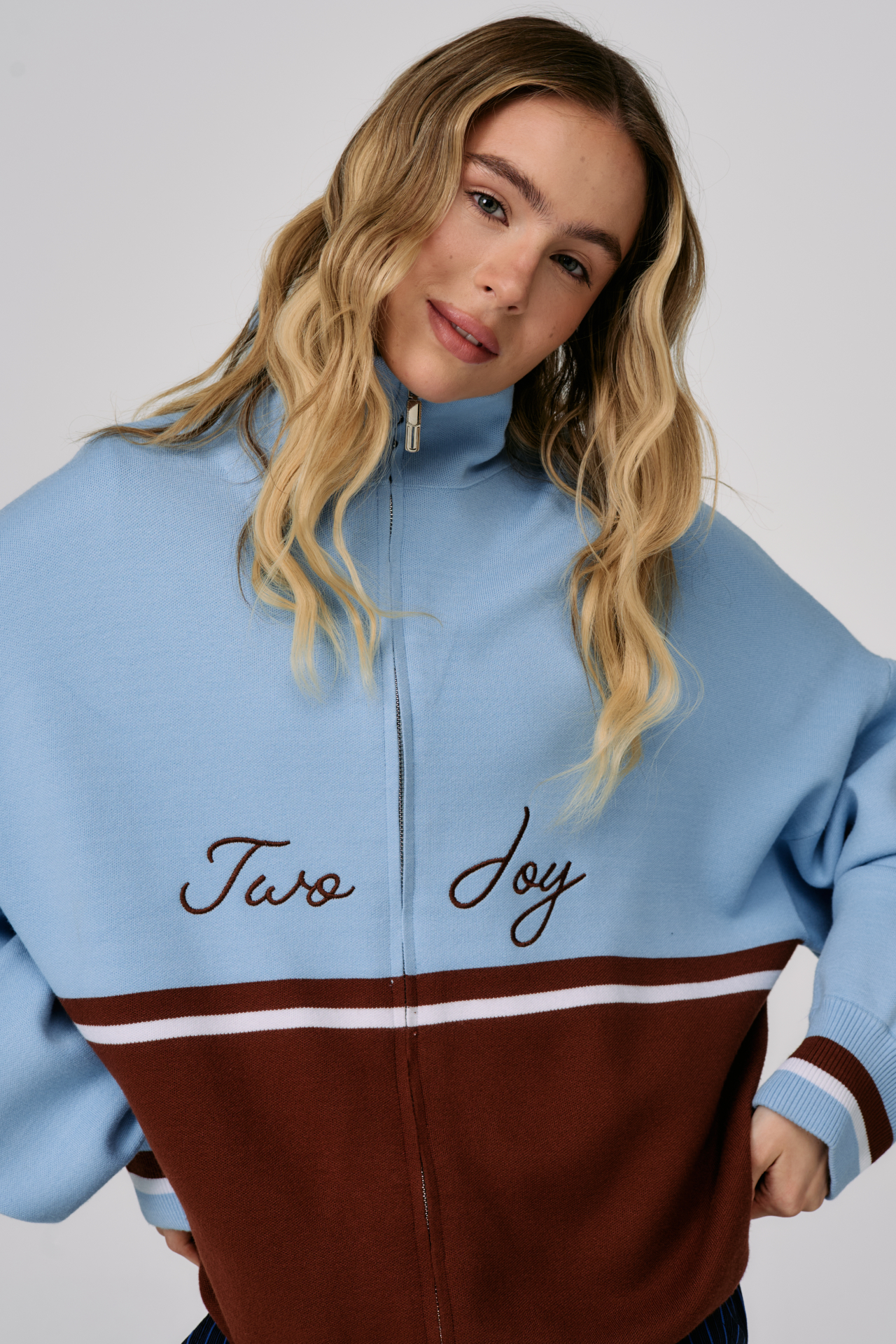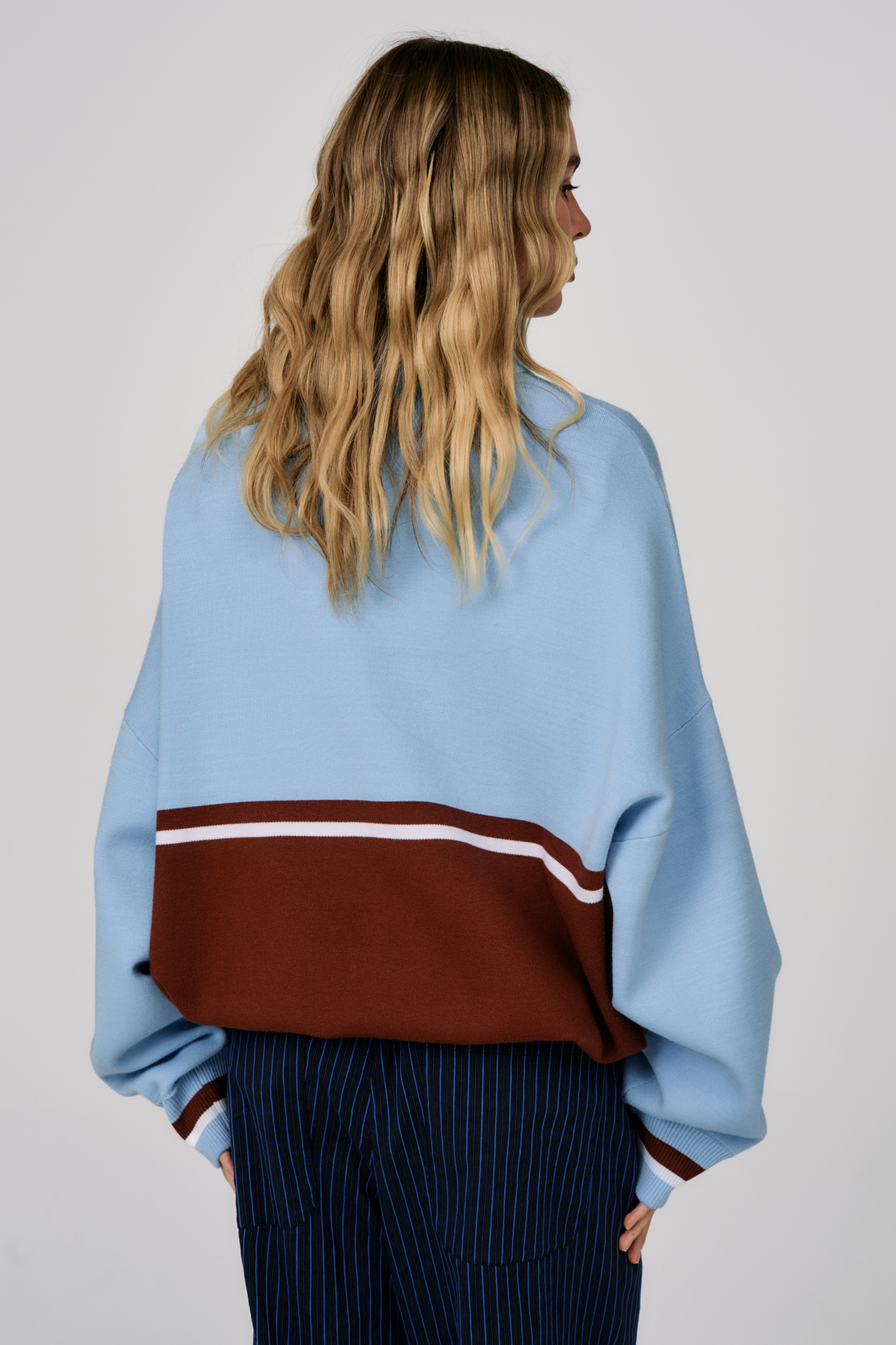 Джемпер на молнии Sky Line вдохновлён эстетикой университетской культуры и спокойной уверенностью зрелого преппи-стиля. Контрастное сочетание небесно-голубого и шоколадного оттенков создаёт выразительную графику, а горизонтальная линия на груди формирует чёткий и узнаваемый силуэт.