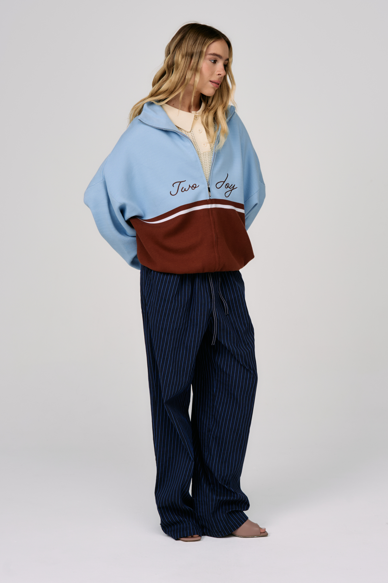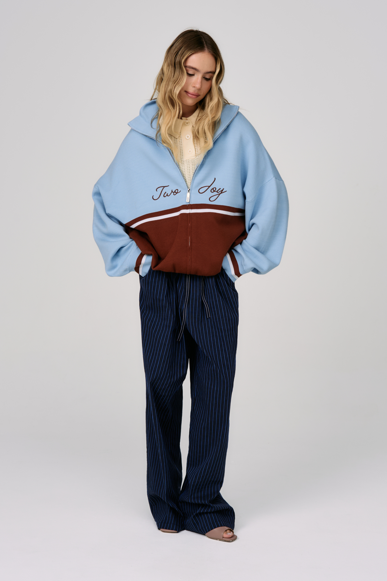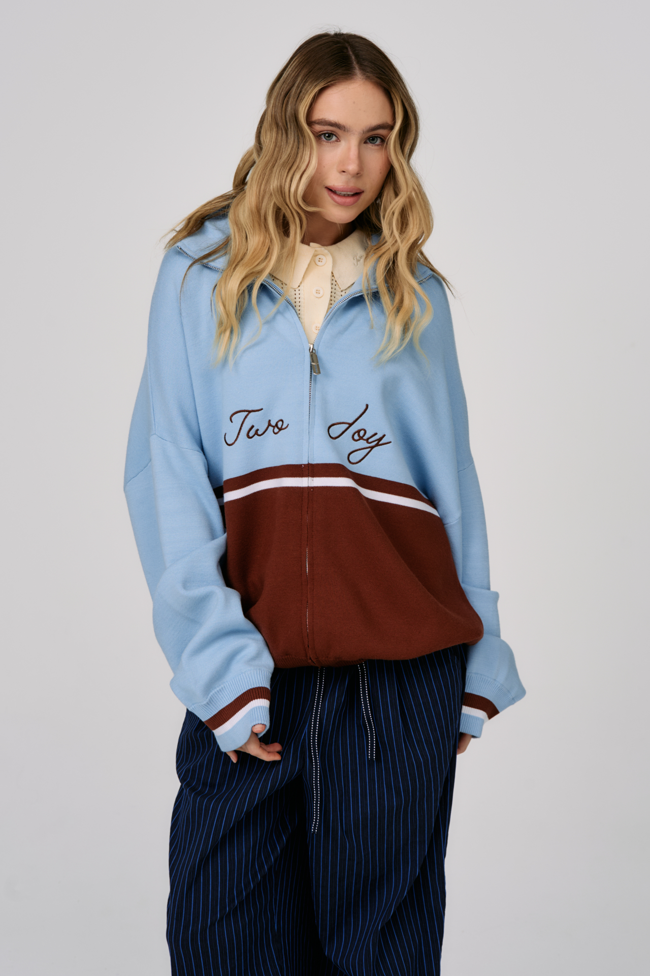 Джемпер на молнии Sky Line вдохновлён эстетикой университетской культуры и спокойной уверенностью зрелого преппи-стиля. Контрастное сочетание небесно-голубого и шоколадного оттенков создаёт выразительную графику, а горизонтальная линия на груди формирует чёткий и узнаваемый силуэт.