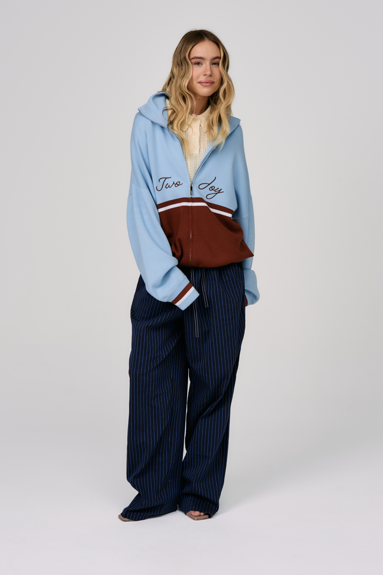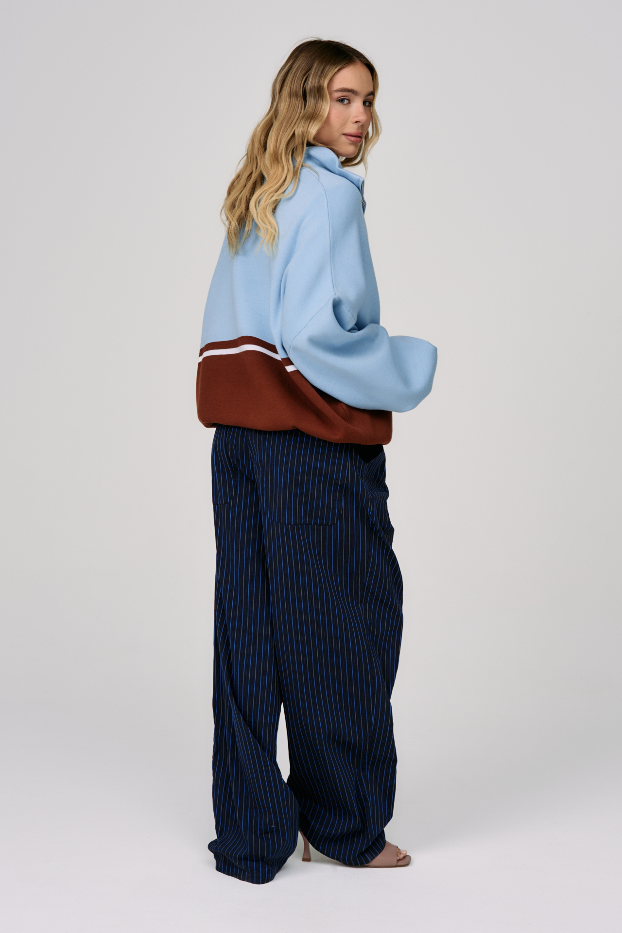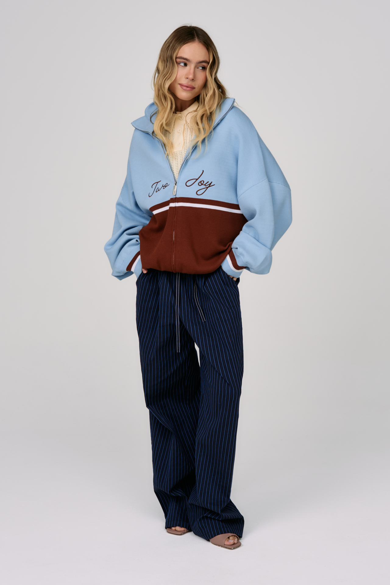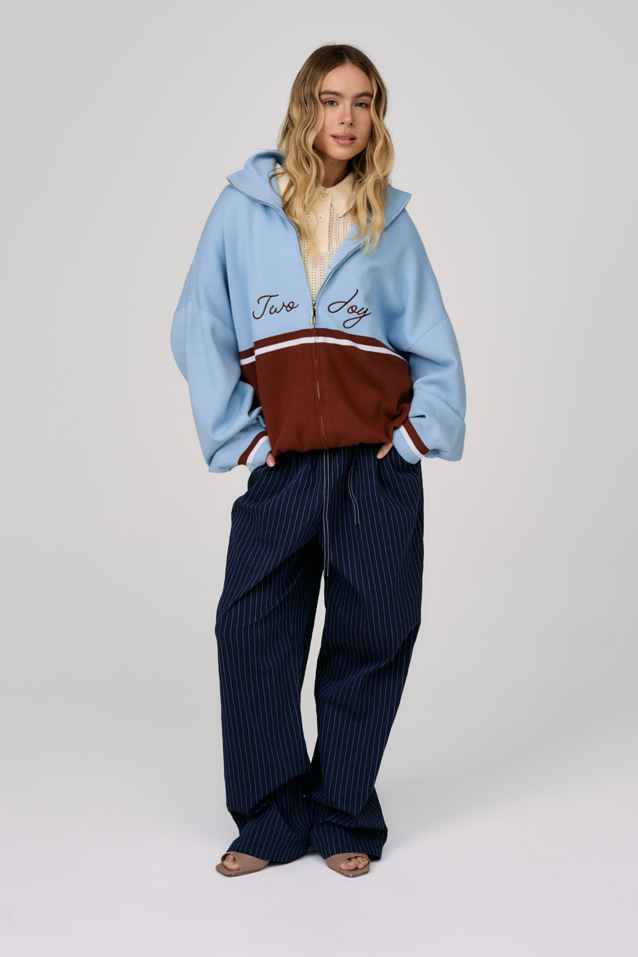 Джемпер на молнии Sky Line вдохновлён эстетикой университетской культуры и спокойной уверенностью зрелого преппи-стиля. Контрастное сочетание небесно-голубого и шоколадного оттенков создаёт выразительную графику, а горизонтальная линия на груди формирует чёткий и узнаваемый силуэт.