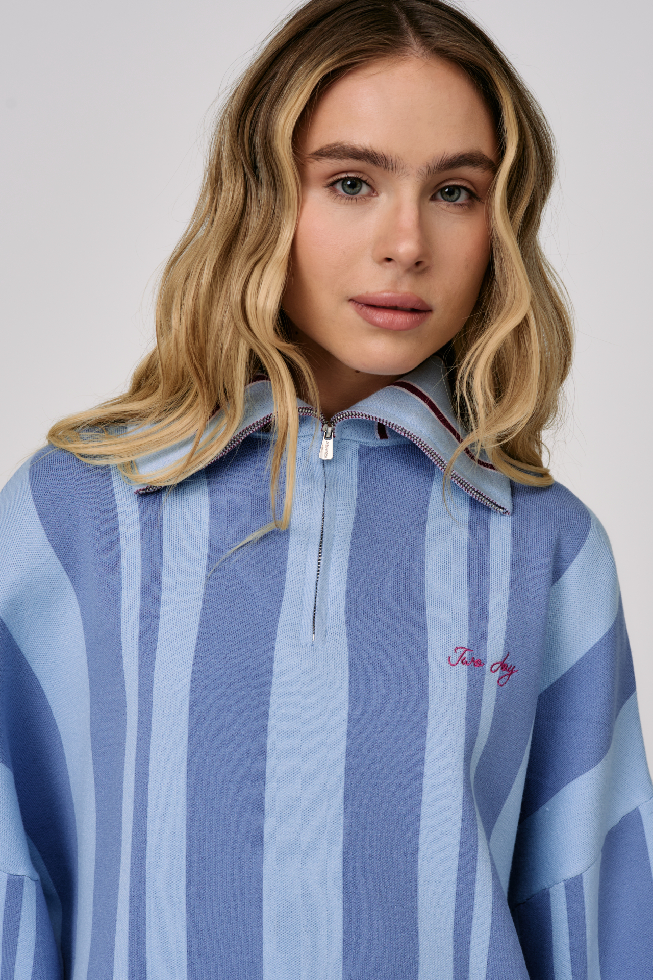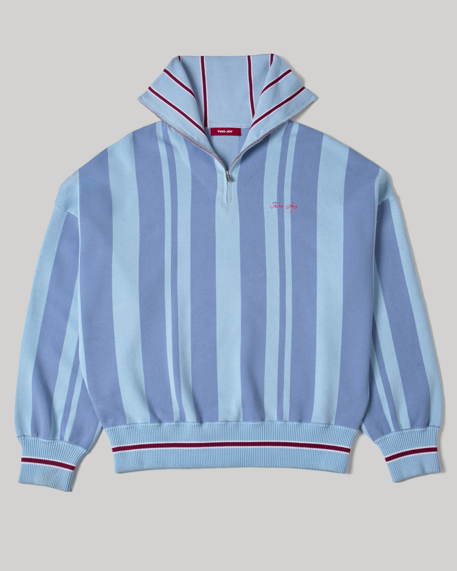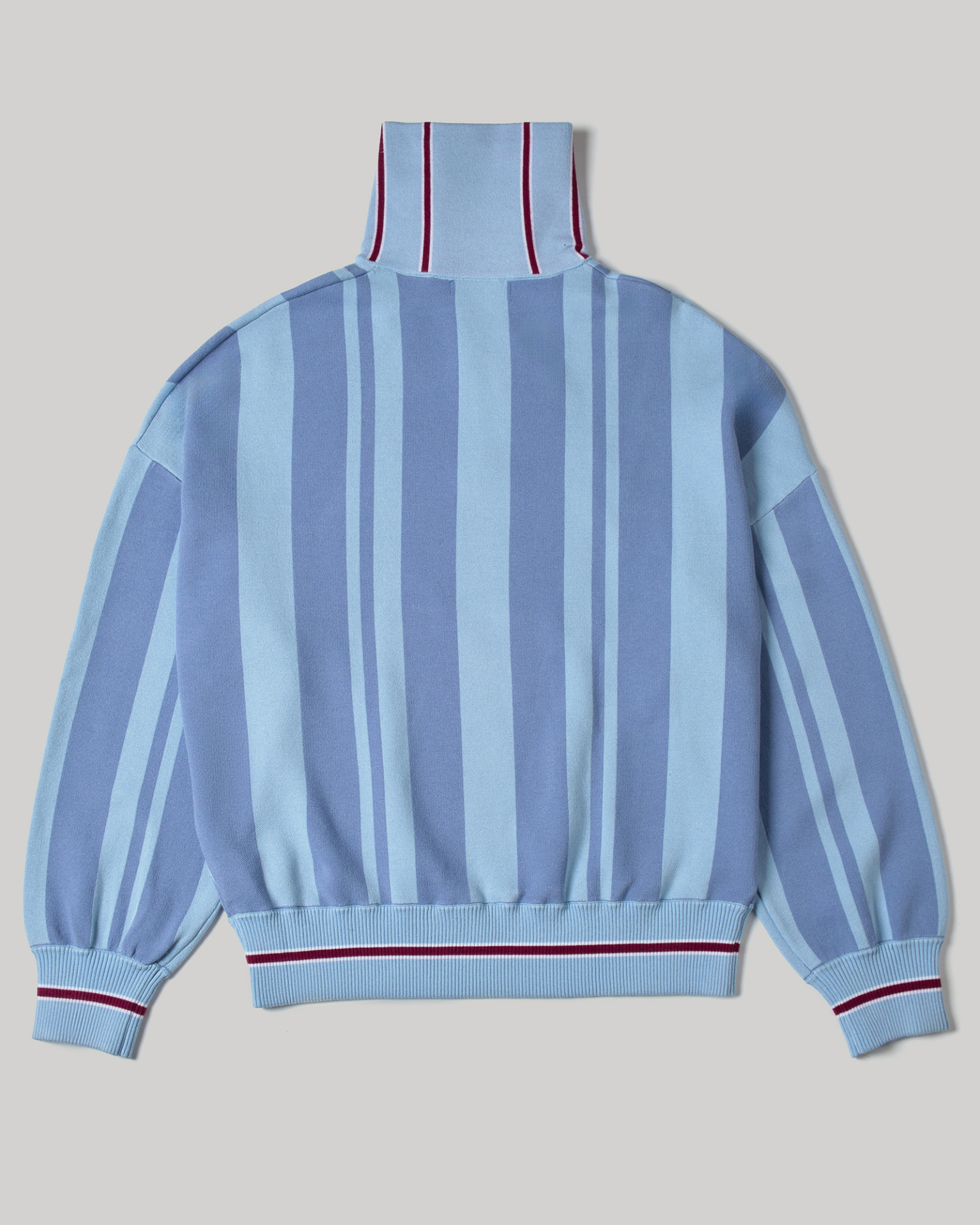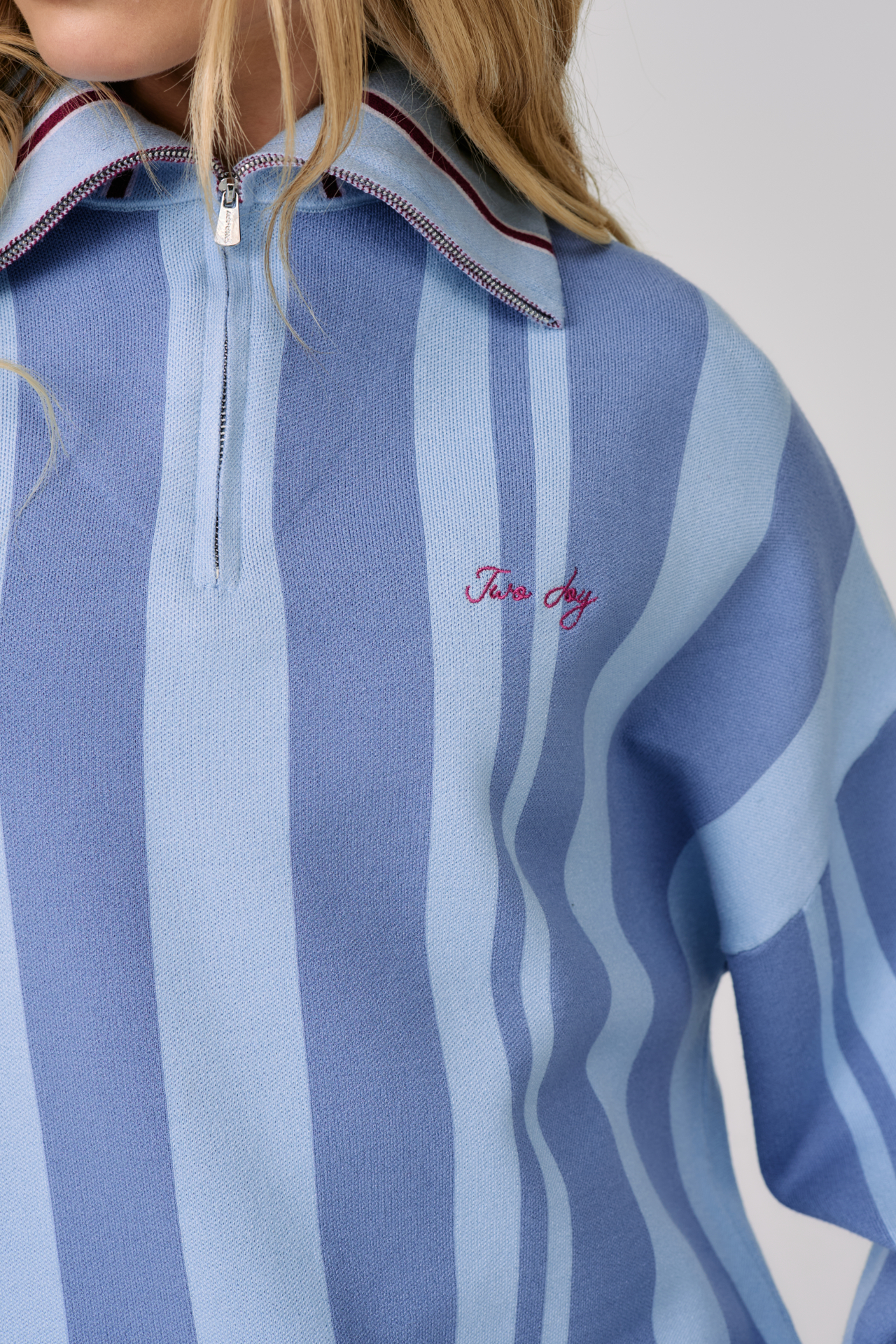 Sky Tempo — лёгкий трикотажный джемпер с вертикальным графичным рисунком, создающим ритм движения и визуально вытягивающим силуэт. Высокий ворот на молнии добавляет образу спортивную динамику, а мягкая смесь вискозы и хлопка обеспечивает комфорт и лёгкость в течение всего дня.