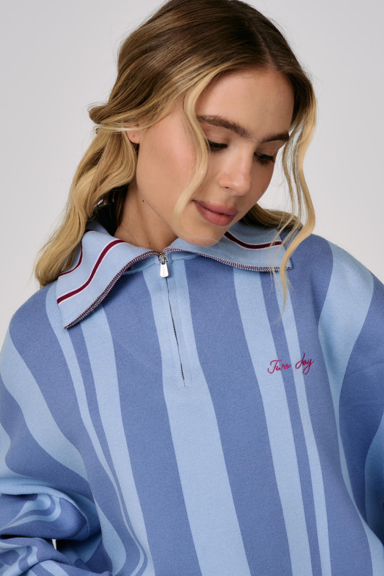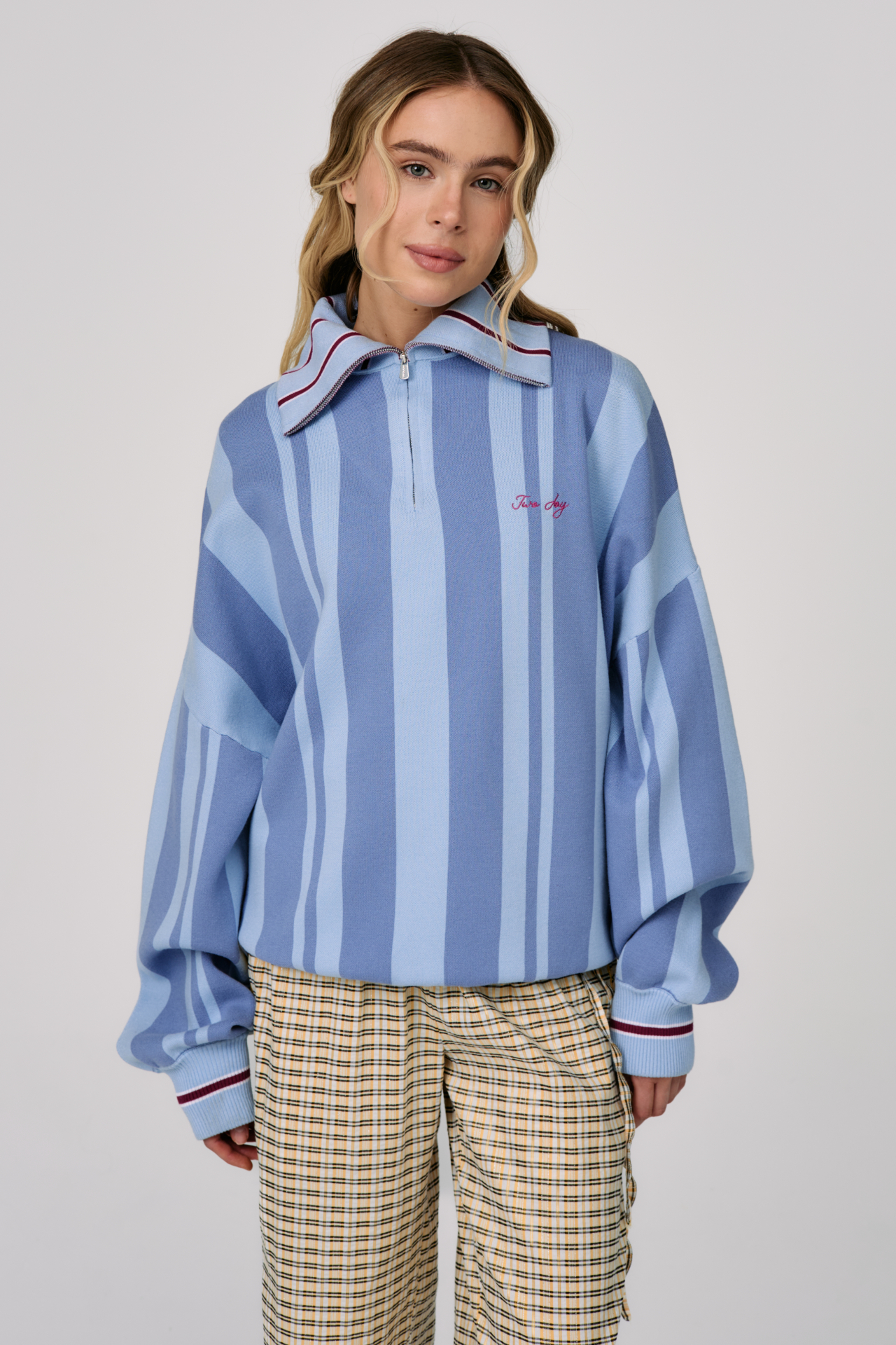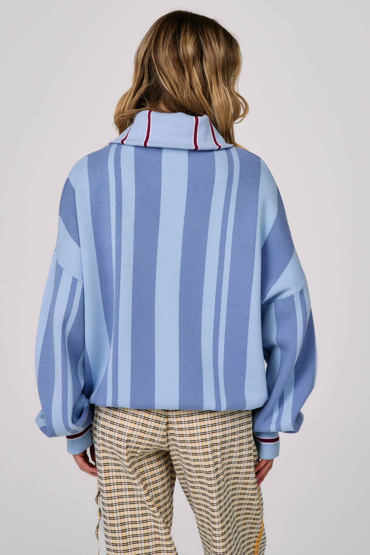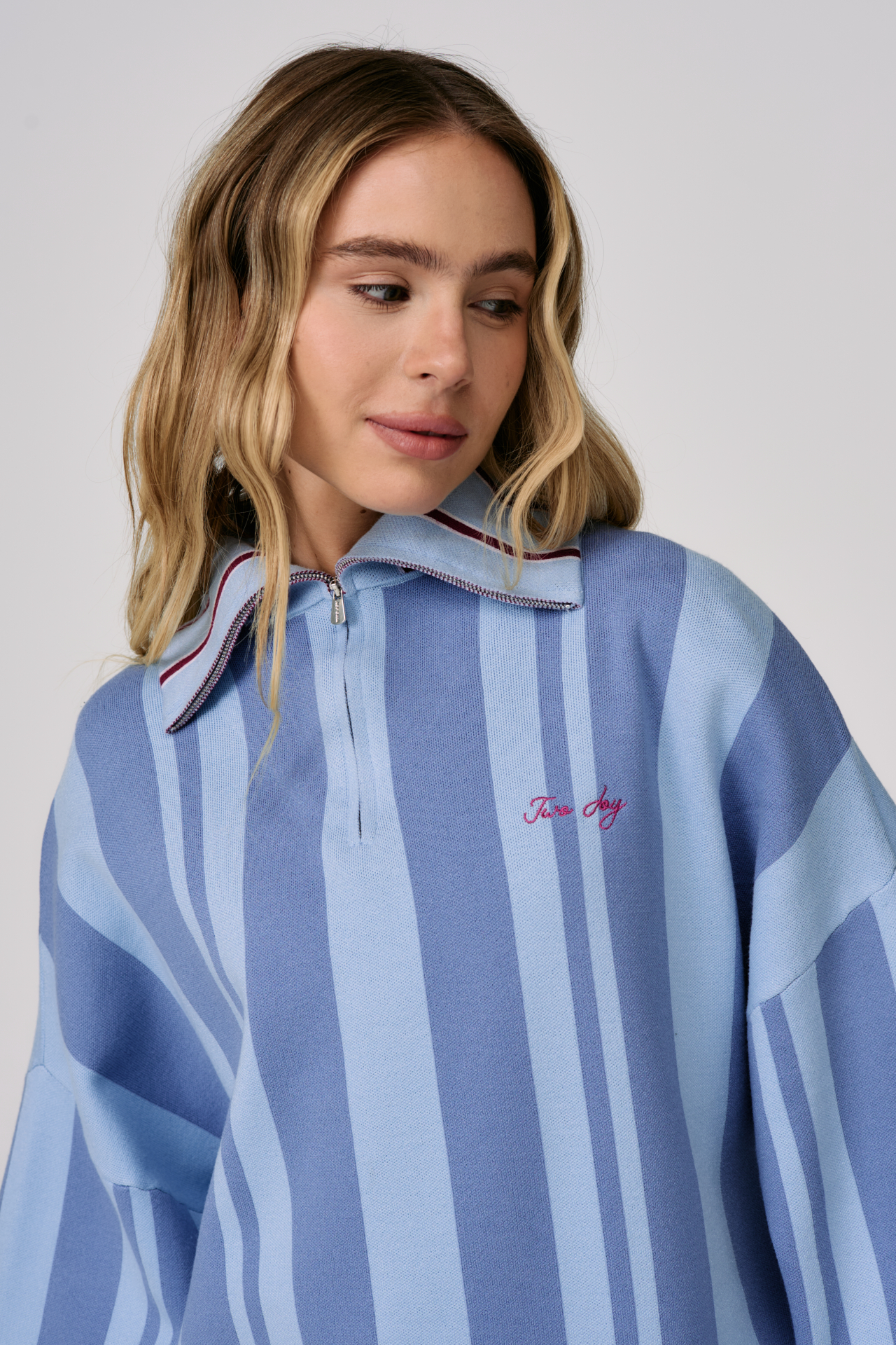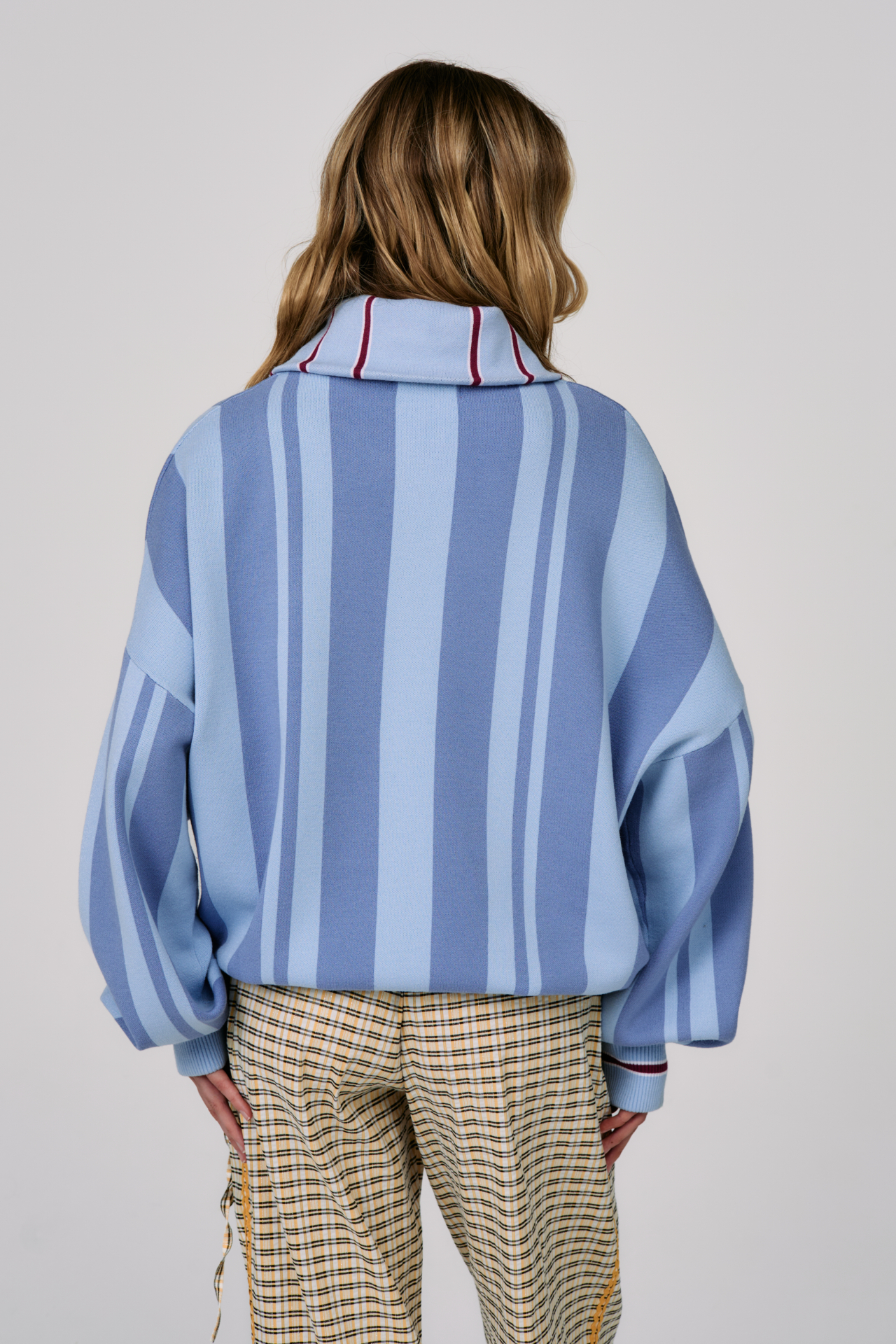 Sky Tempo — лёгкий трикотажный джемпер с вертикальным графичным рисунком, создающим ритм движения и визуально вытягивающим силуэт. Высокий ворот на молнии добавляет образу спортивную динамику, а мягкая смесь вискозы и хлопка обеспечивает комфорт и лёгкость в течение всего дня.