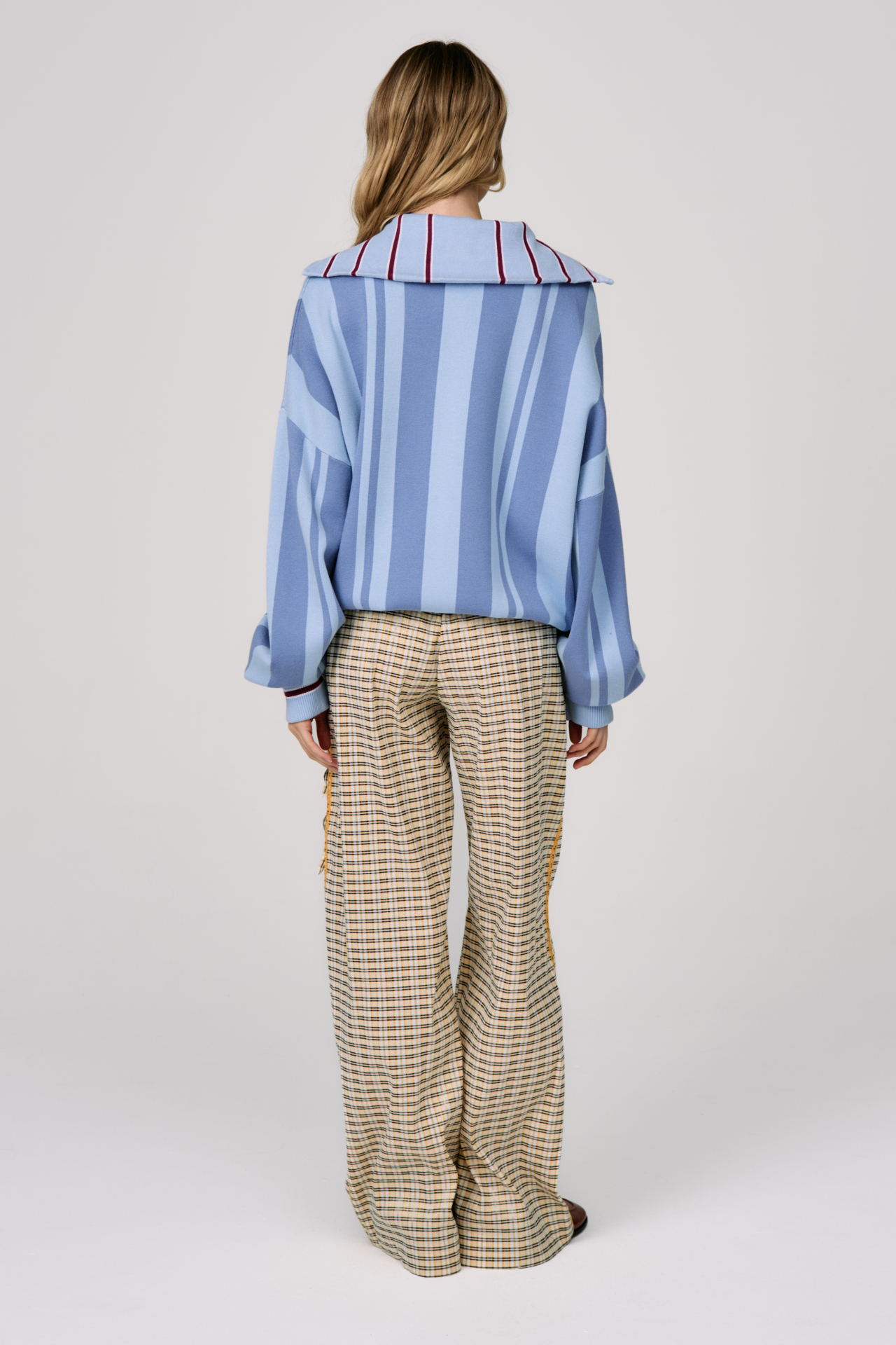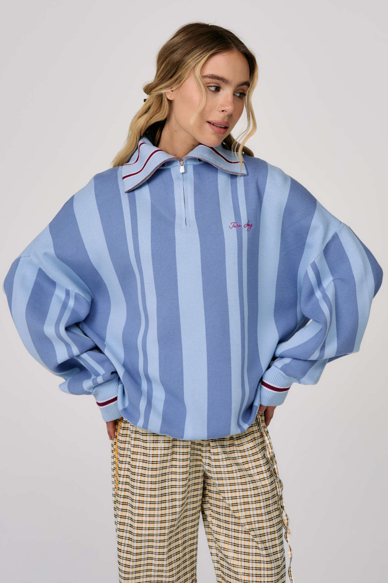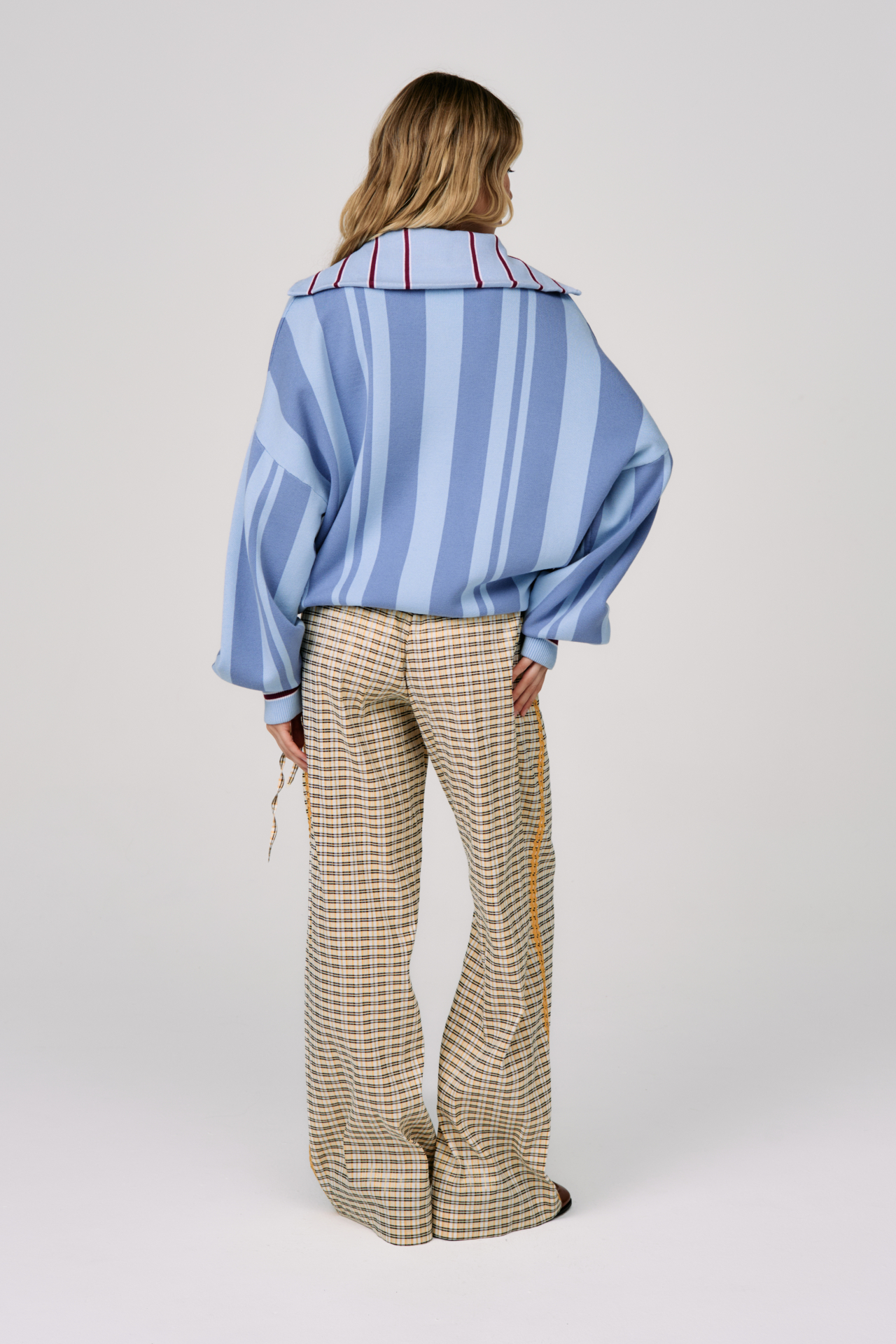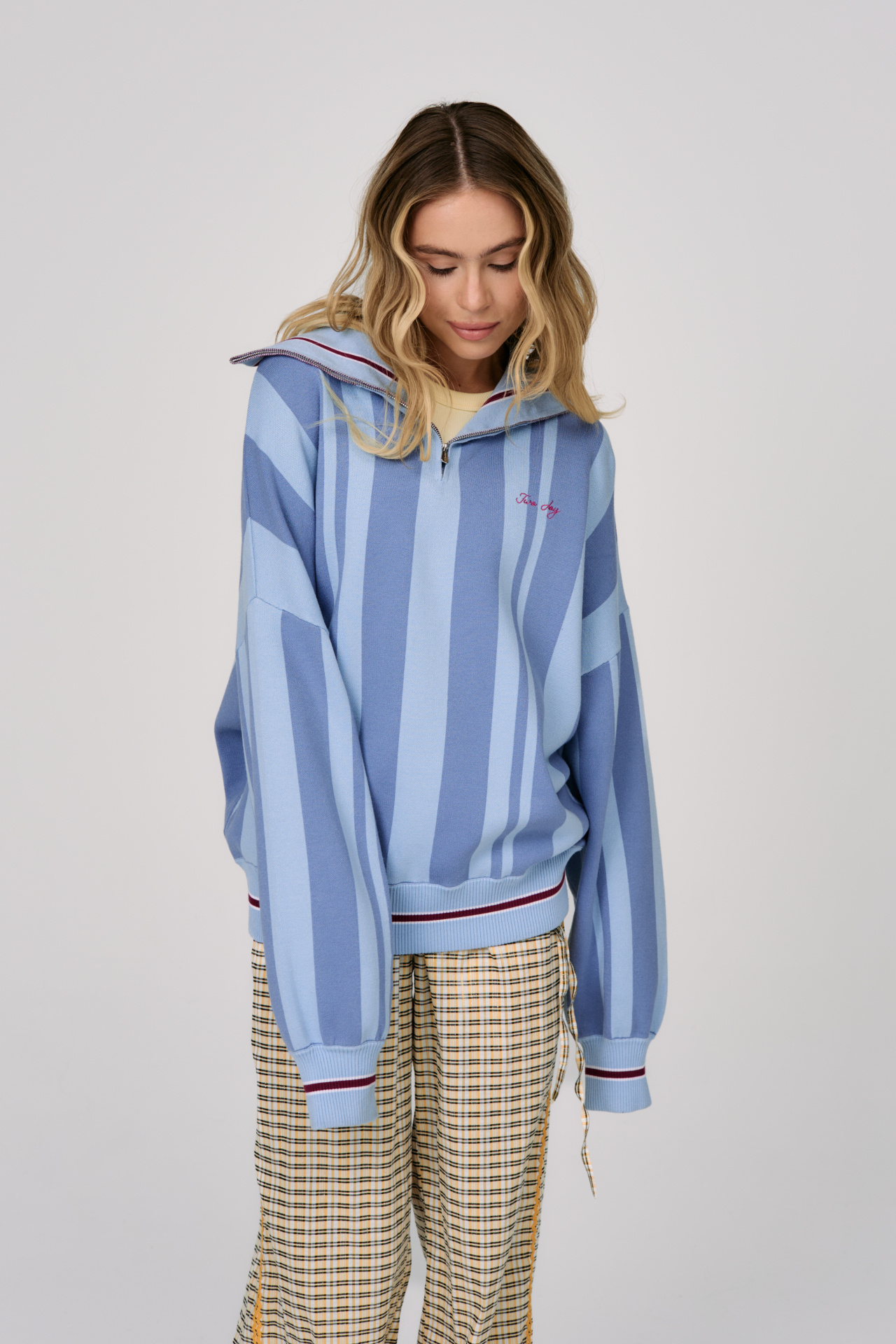 Sky Tempo — лёгкий трикотажный джемпер с вертикальным графичным рисунком, создающим ритм движения и визуально вытягивающим силуэт. Высокий ворот на молнии добавляет образу спортивную динамику, а мягкая смесь вискозы и хлопка обеспечивает комфорт и лёгкость в течение всего дня.