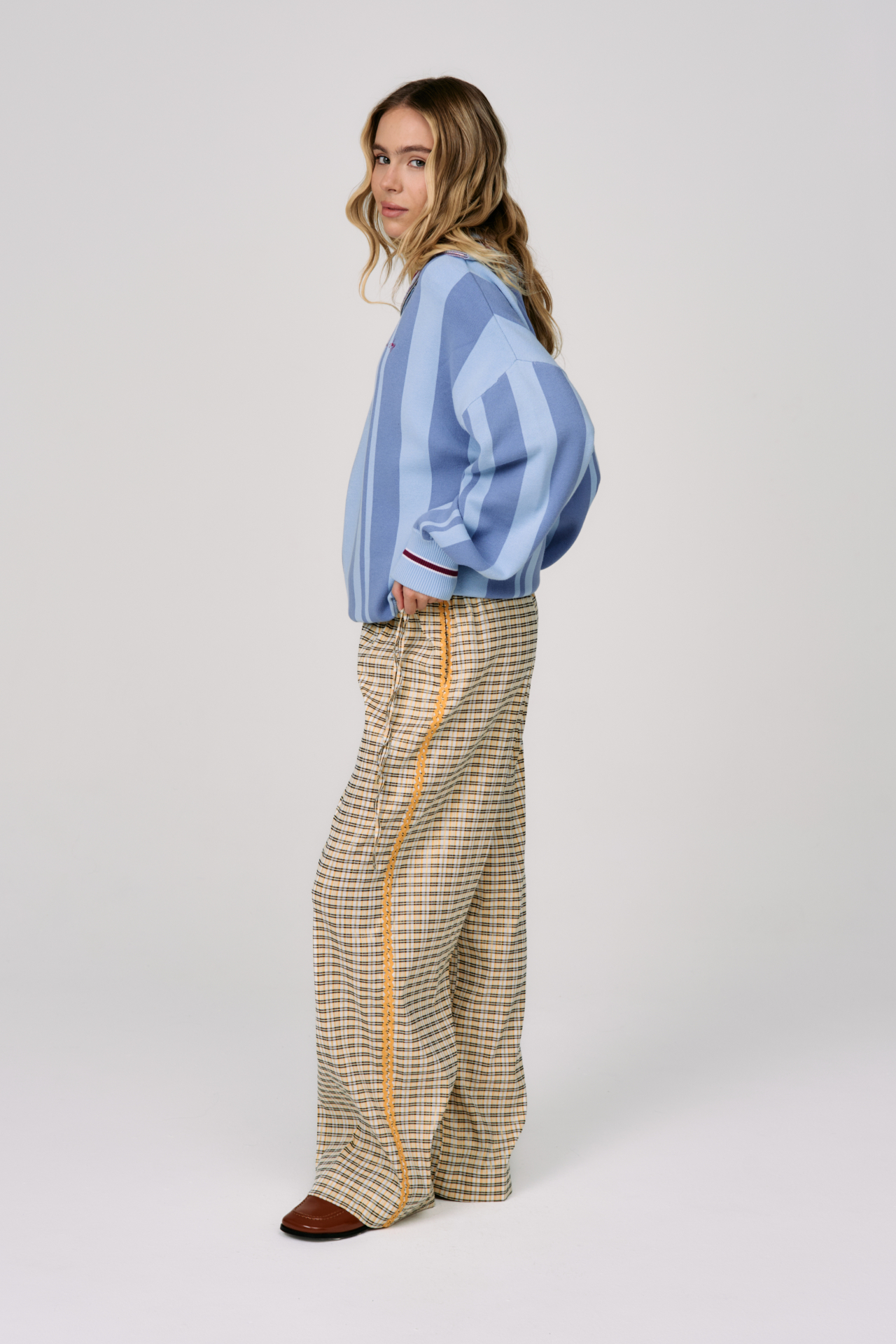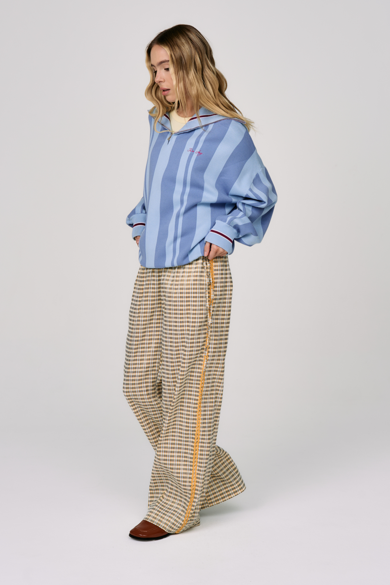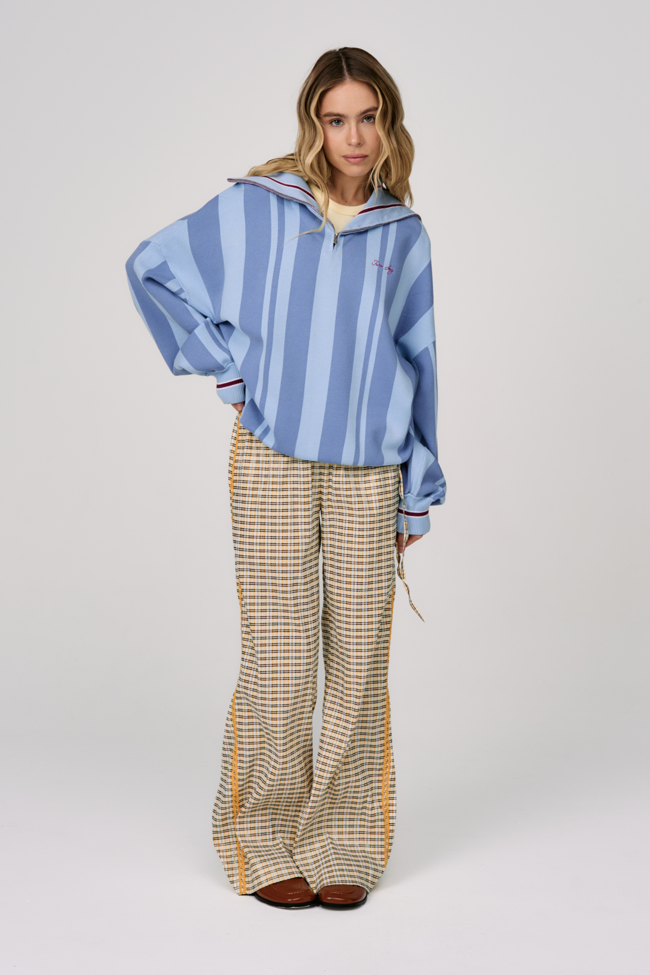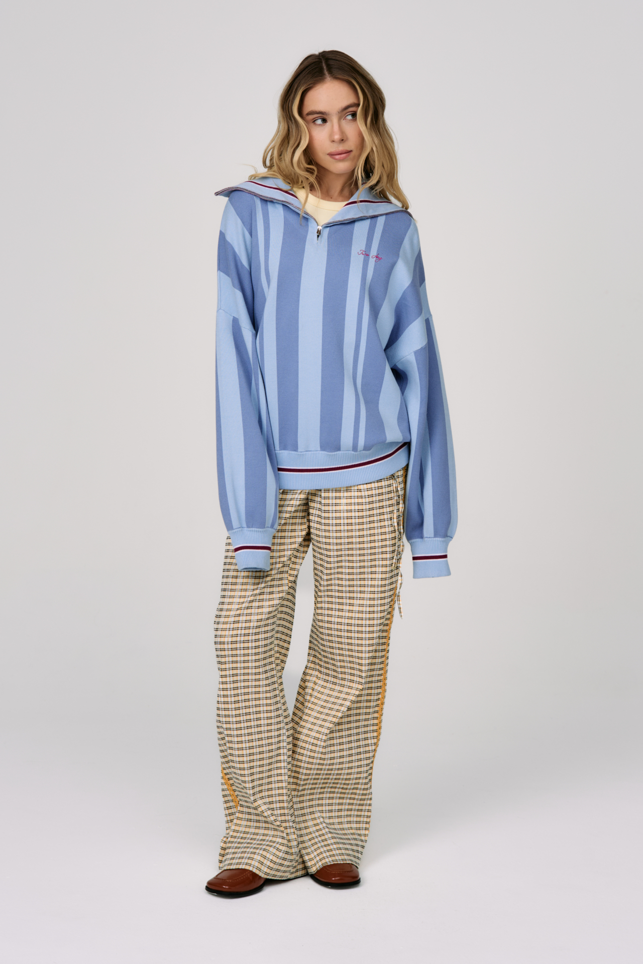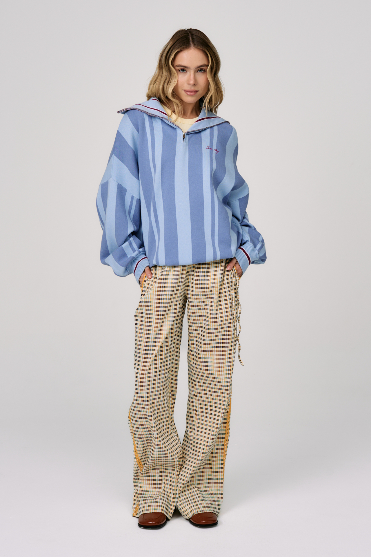 Sky Tempo — лёгкий трикотажный джемпер с вертикальным графичным рисунком, создающим ритм движения и визуально вытягивающим силуэт. Высокий ворот на молнии добавляет образу спортивную динамику, а мягкая смесь вискозы и хлопка обеспечивает комфорт и лёгкость в течение всего дня.