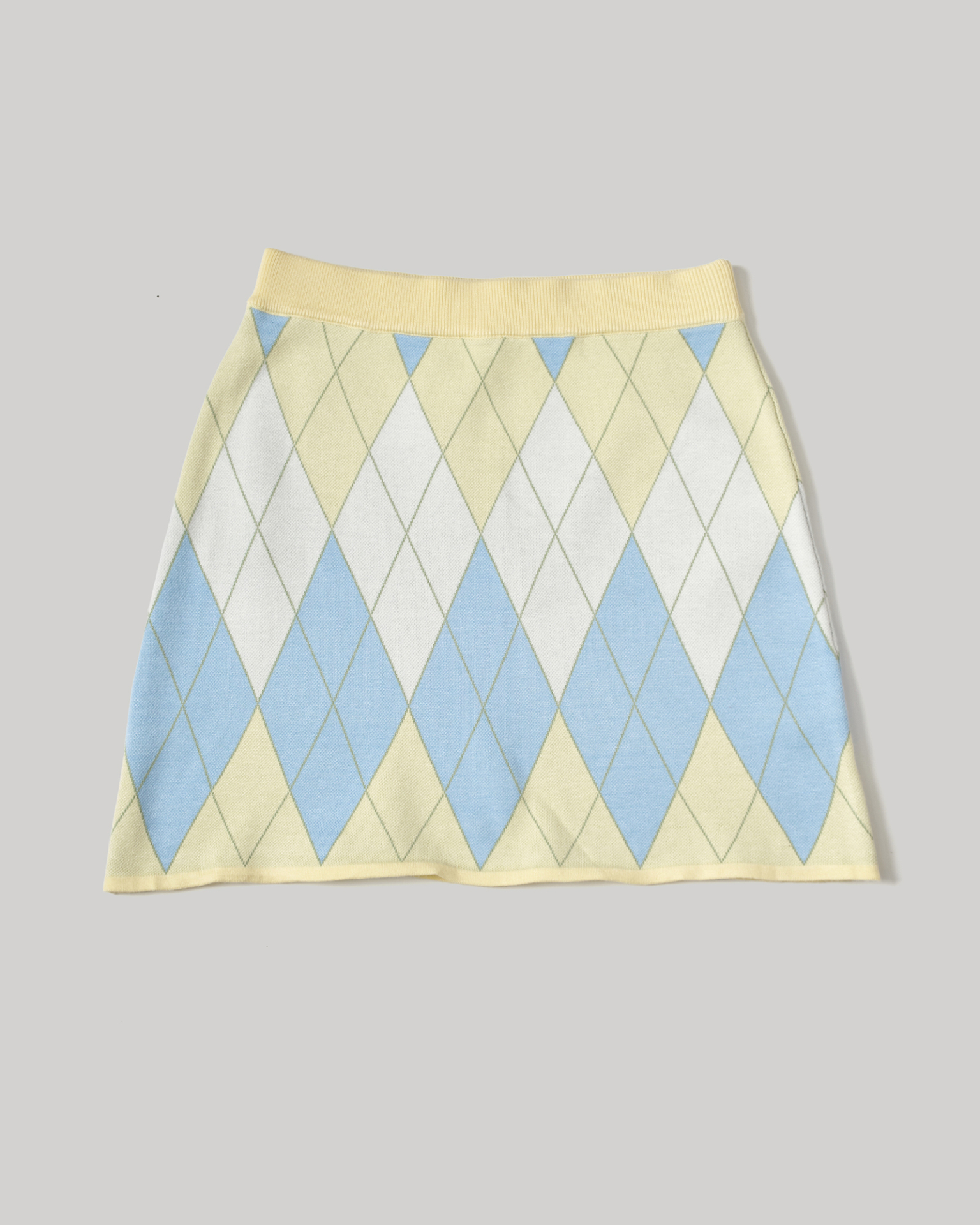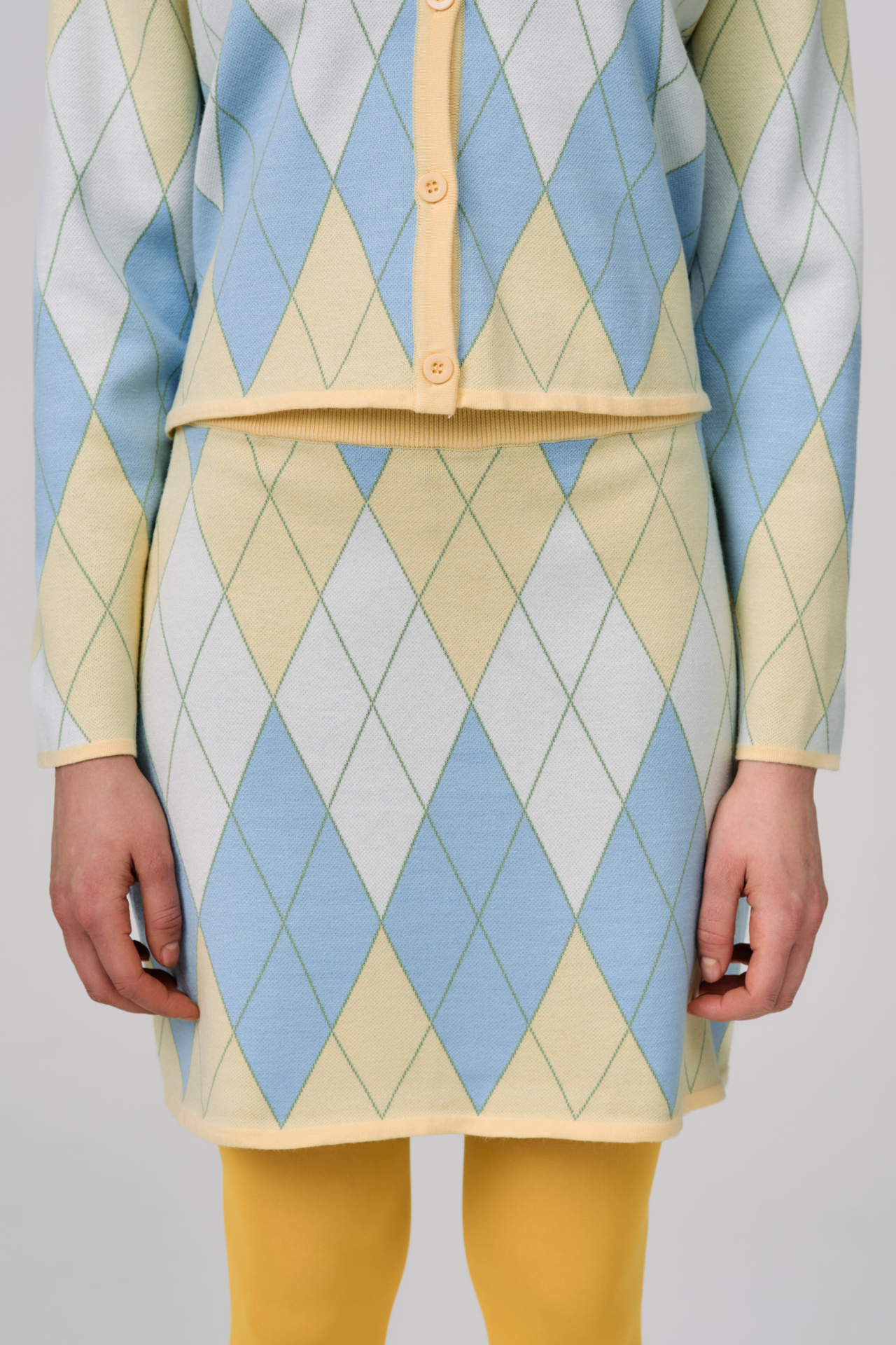 Argyle Code — трикотажная юбка с классическим ромбовым паттерном, выполненная в мягкой пастельной палитре. Геометричный рисунок задаёт образу графичный ритм и делает силуэт выразительным, сохраняя лёгкость и летнее настроение.