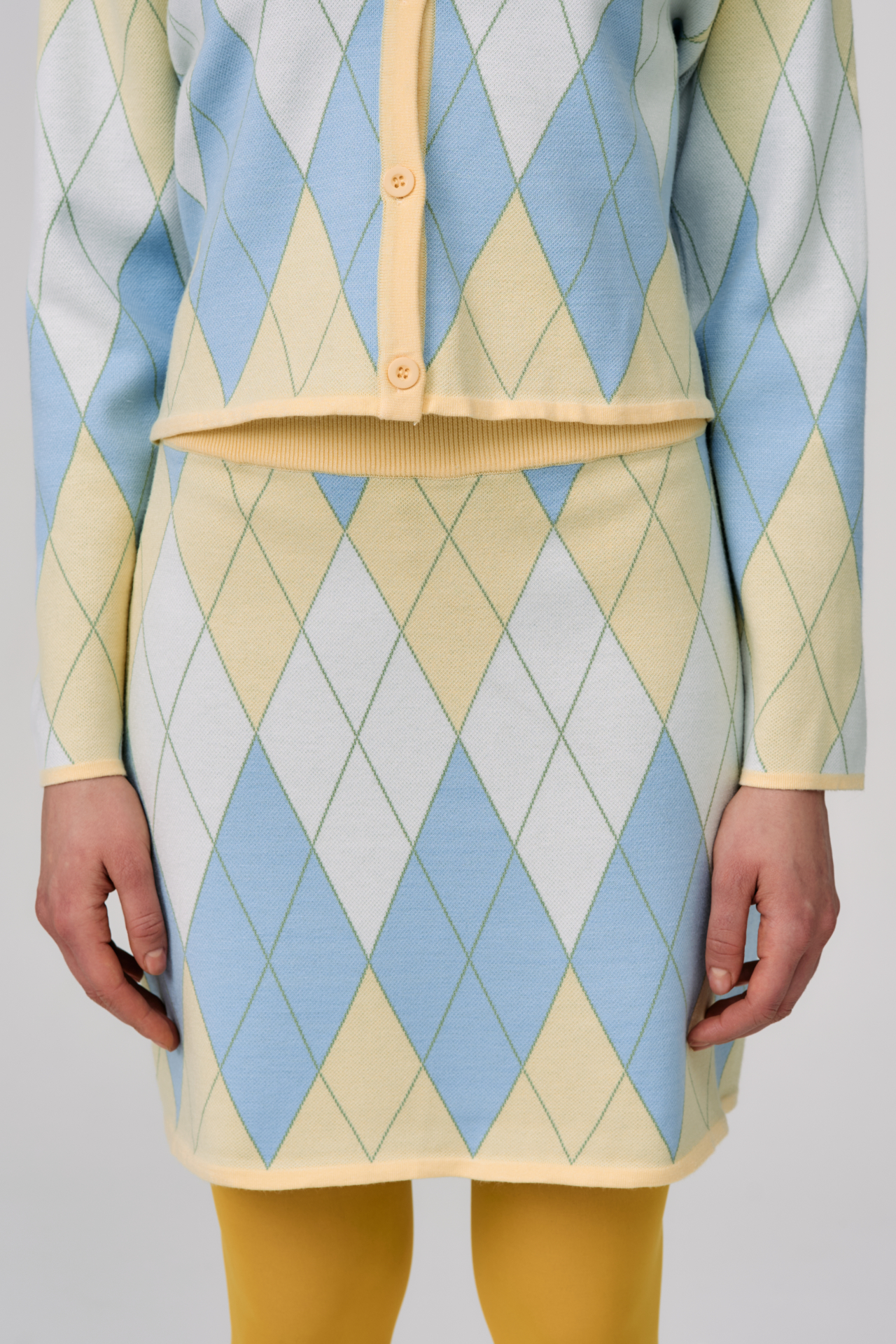Argyle Code — трикотажная юбка с классическим ромбовым паттерном, выполненная в мягкой пастельной палитре. Геометричный рисунок задаёт образу графичный ритм и делает силуэт выразительным, сохраняя лёгкость и летнее настроение.