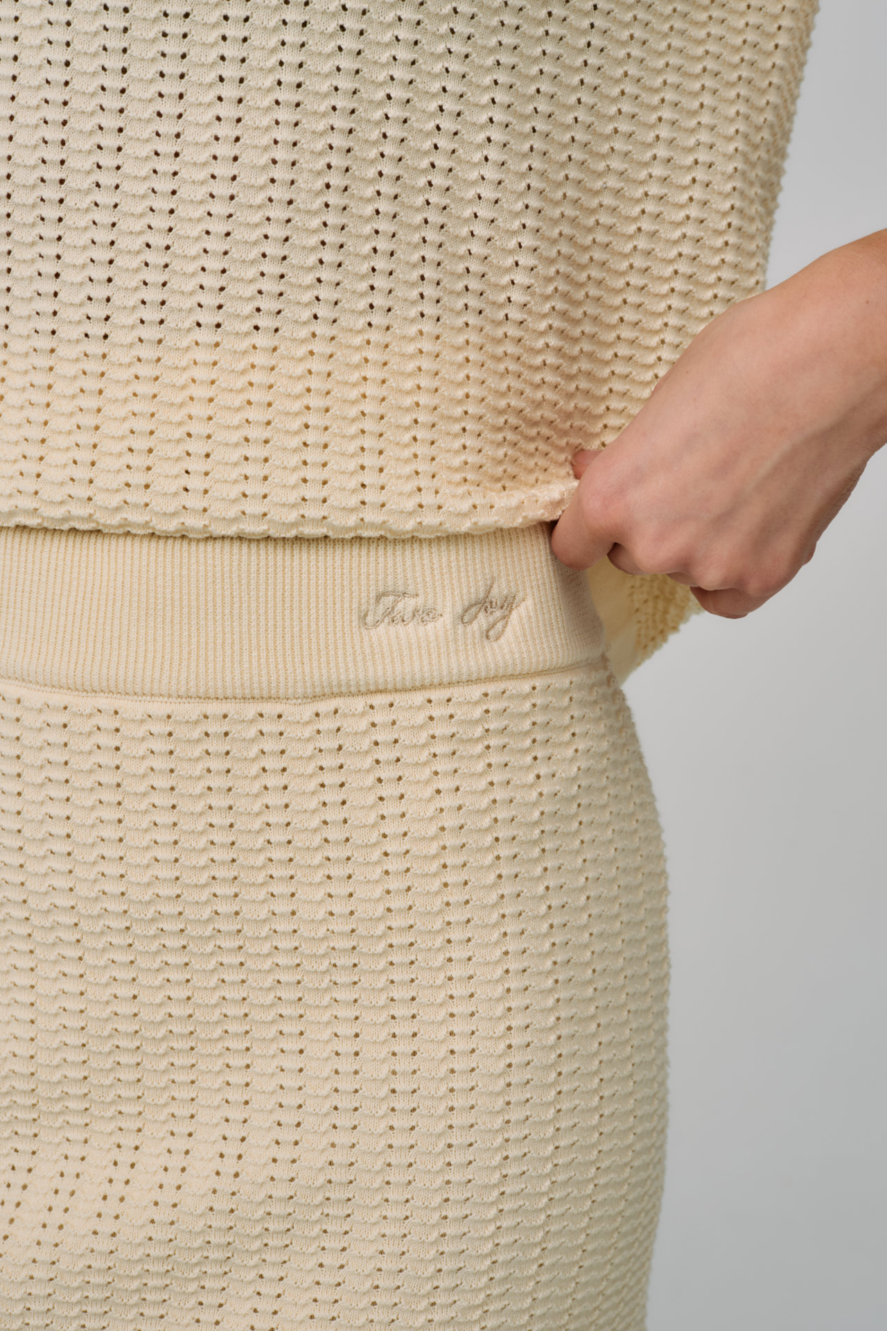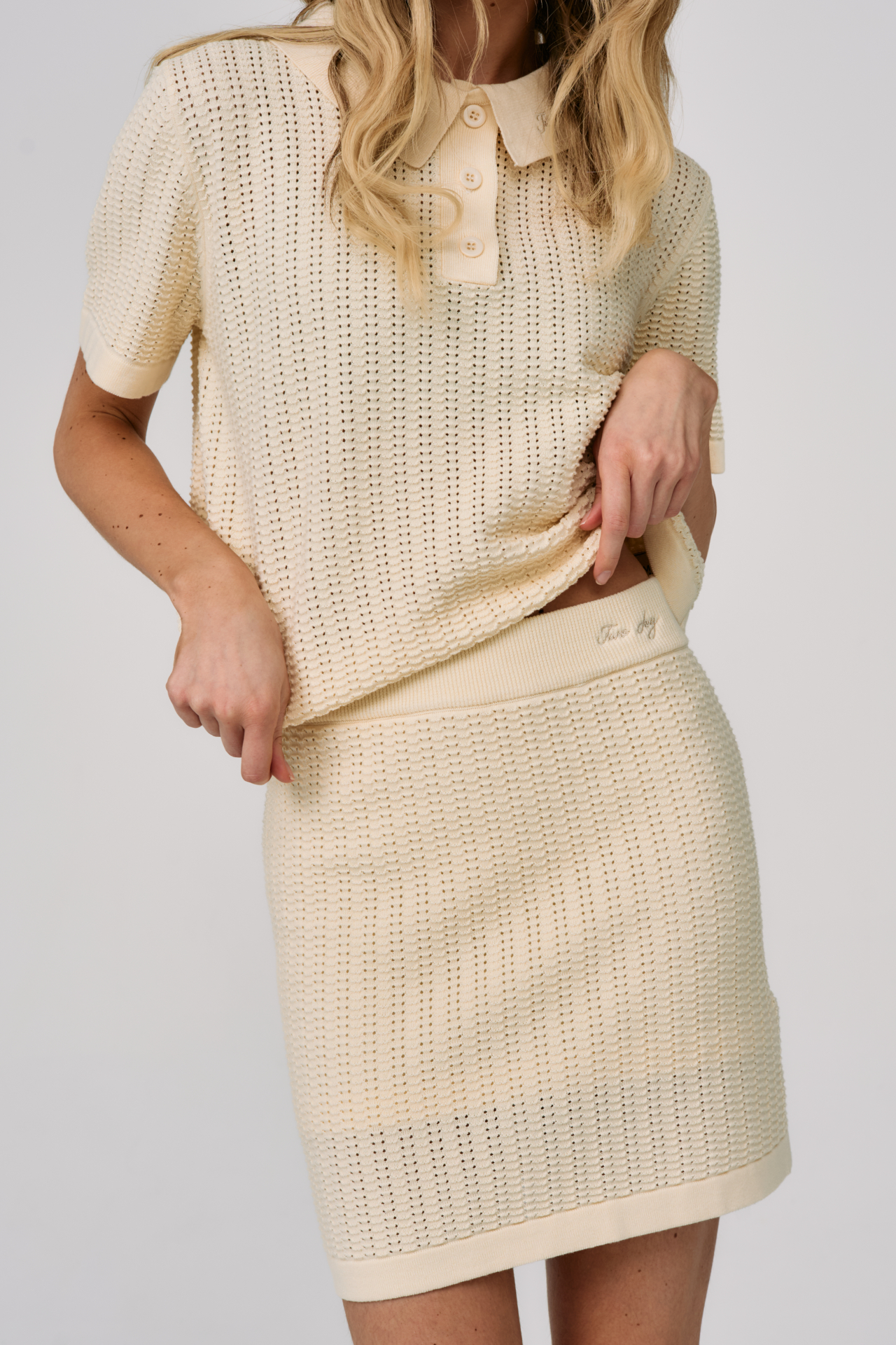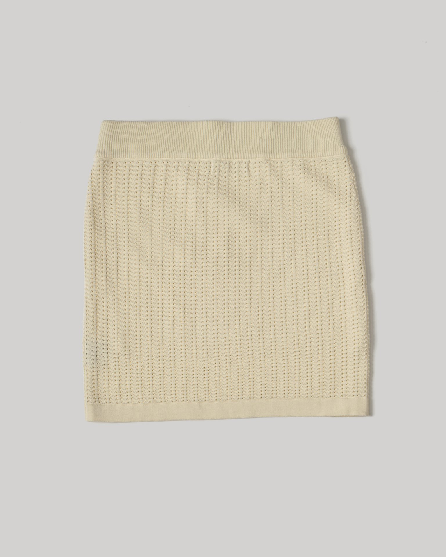 Butter Club — трикотажная юбка из мягкого фактурного хлопка в тёплом оттенке сливочного масла. Лаконичный силуэт и деликатная текстура создают спокойный и элегантный образ в духе современной преппи-эстетики.