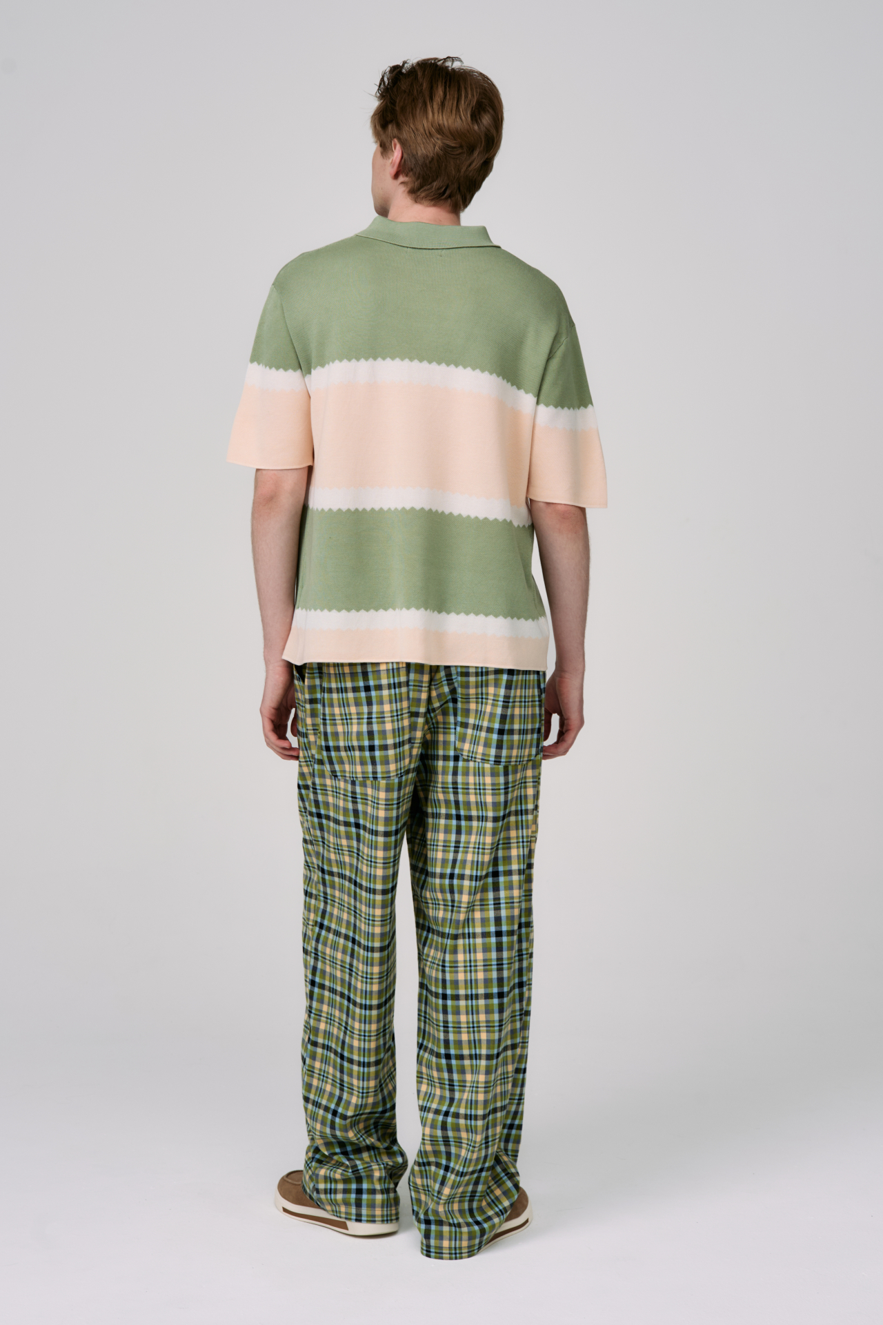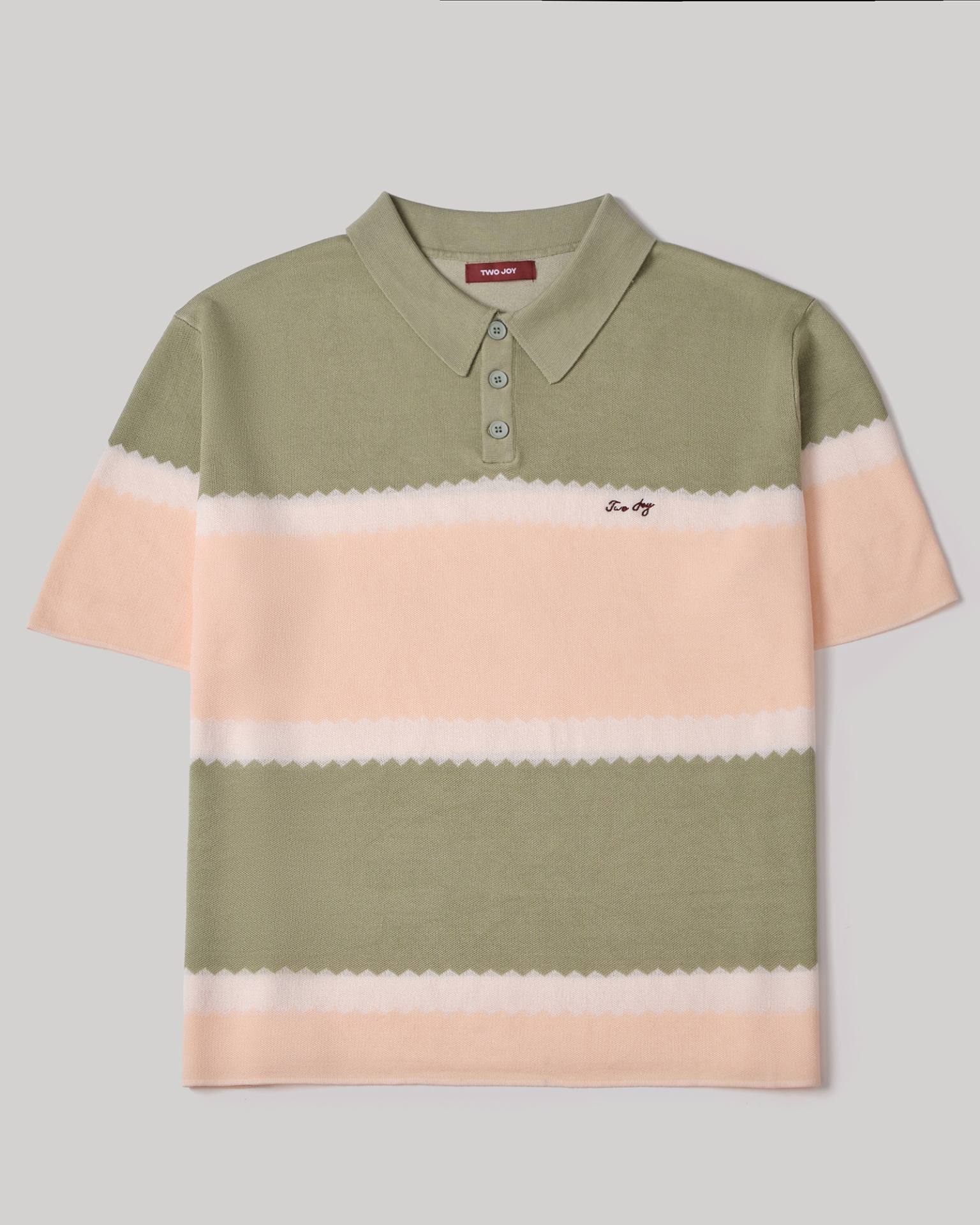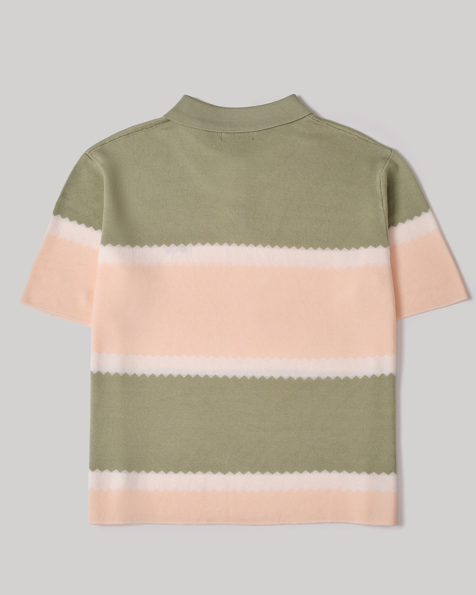 Сочетание оливкового, сливочного и персикового оттенков формирует мягкую графику горизонтальных полос. Зигзагообразная линия перехода цвета добавляет модели характер и лёгкую винтажную динамику.