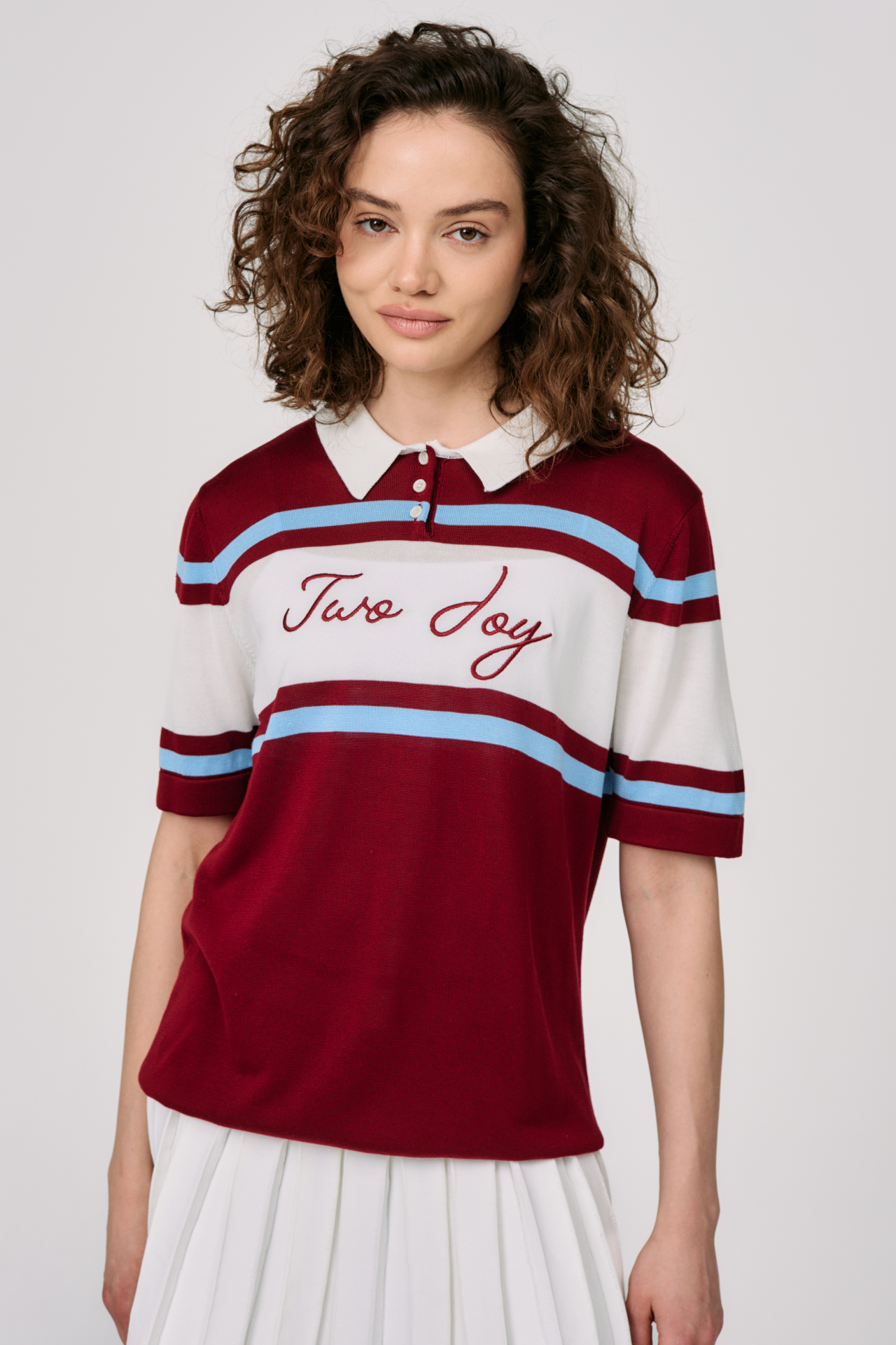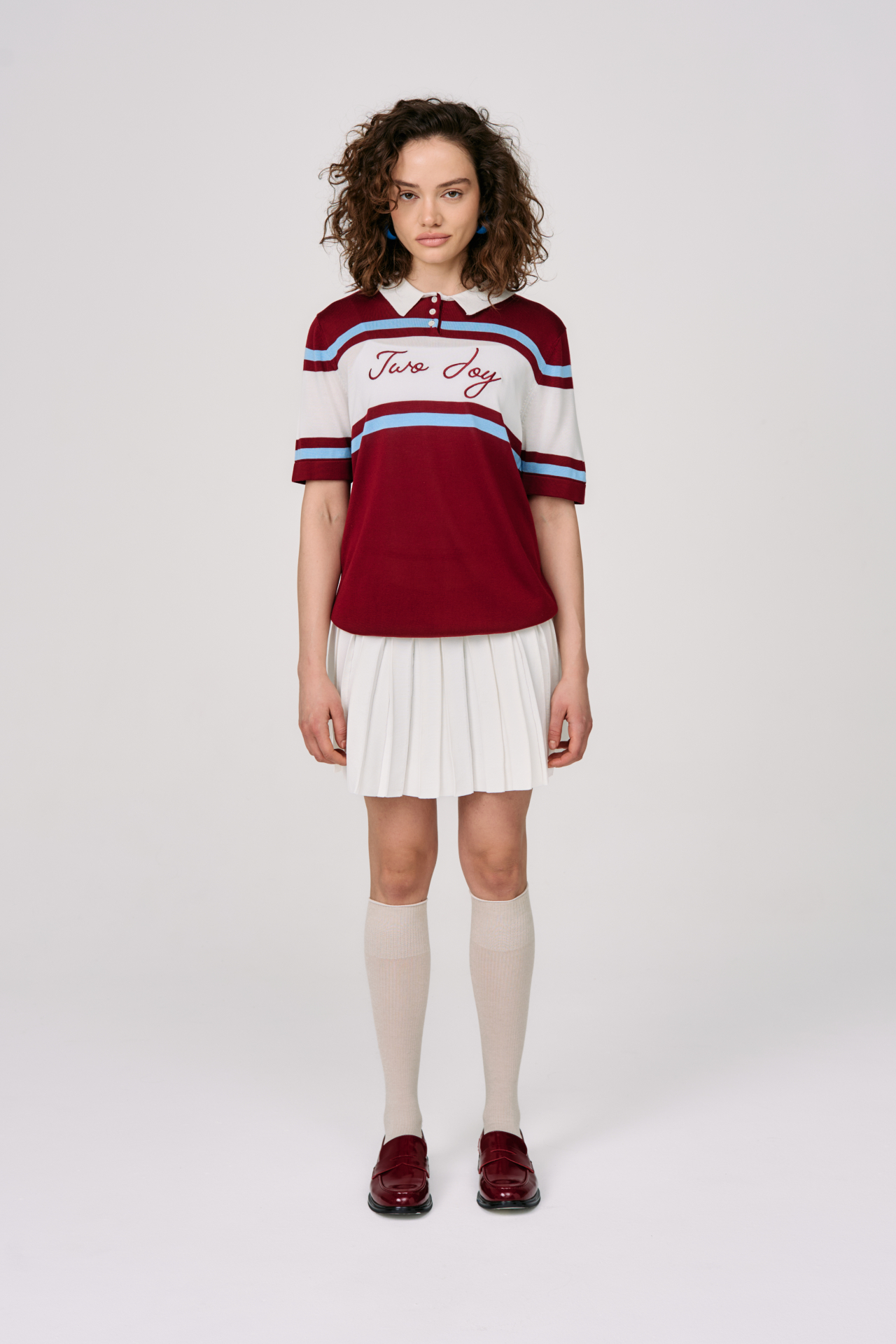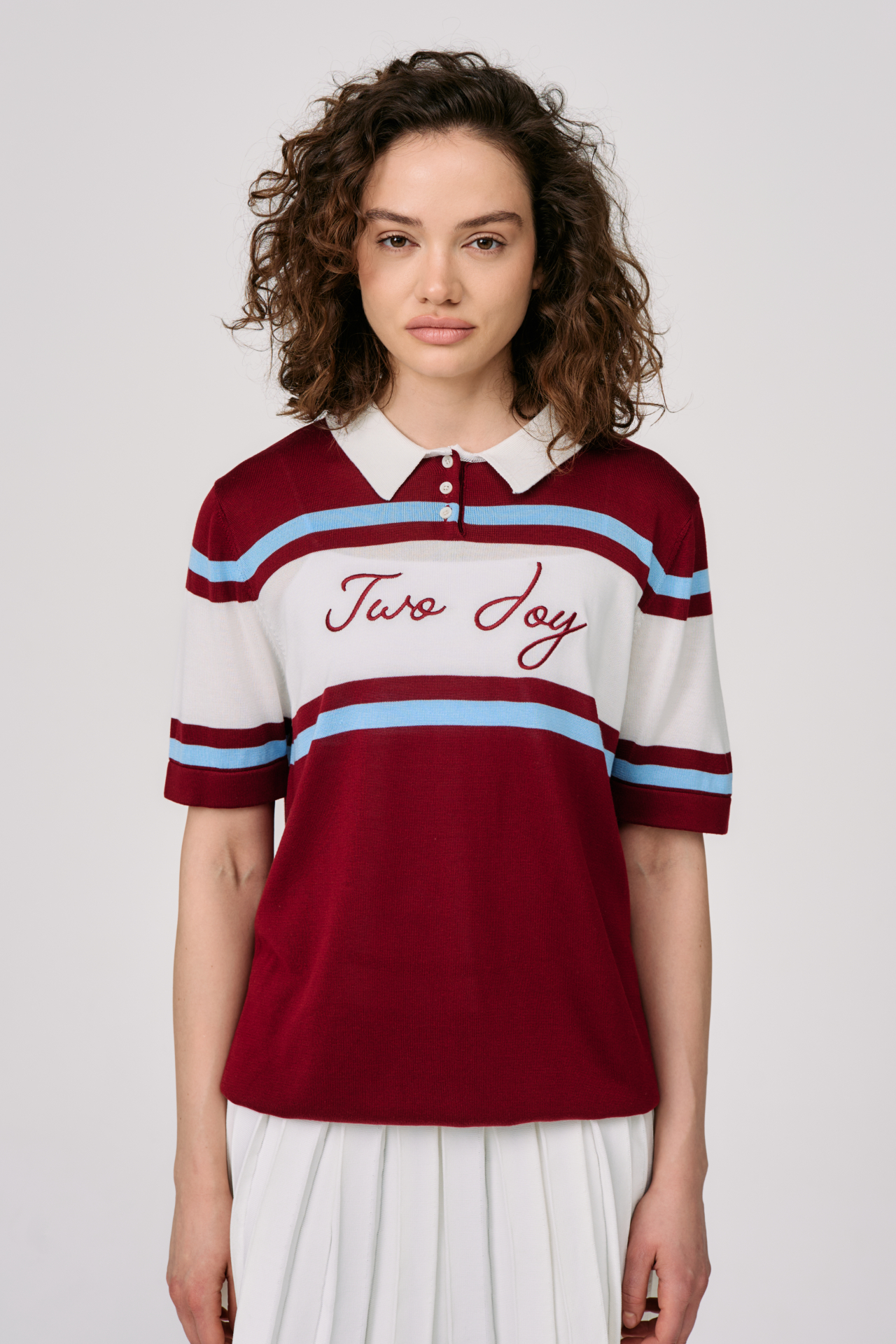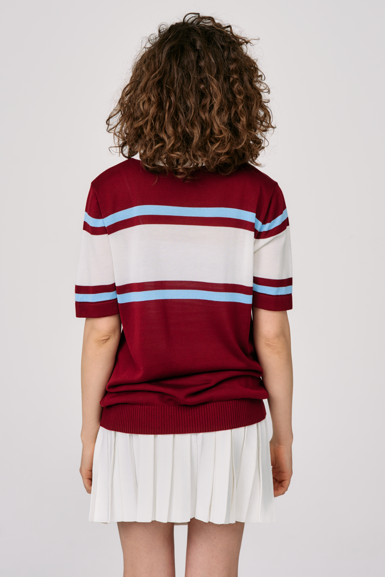 Ruby Tempo — трикотажное поло с графичным полосатым рисунком, вдохновлённым эстетикой винтажной спортивной формы и университетских команд. Контрастные линии создают динамичный ритм, а насыщенный рубиновый оттенок делает модель ярким акцентом образа.
