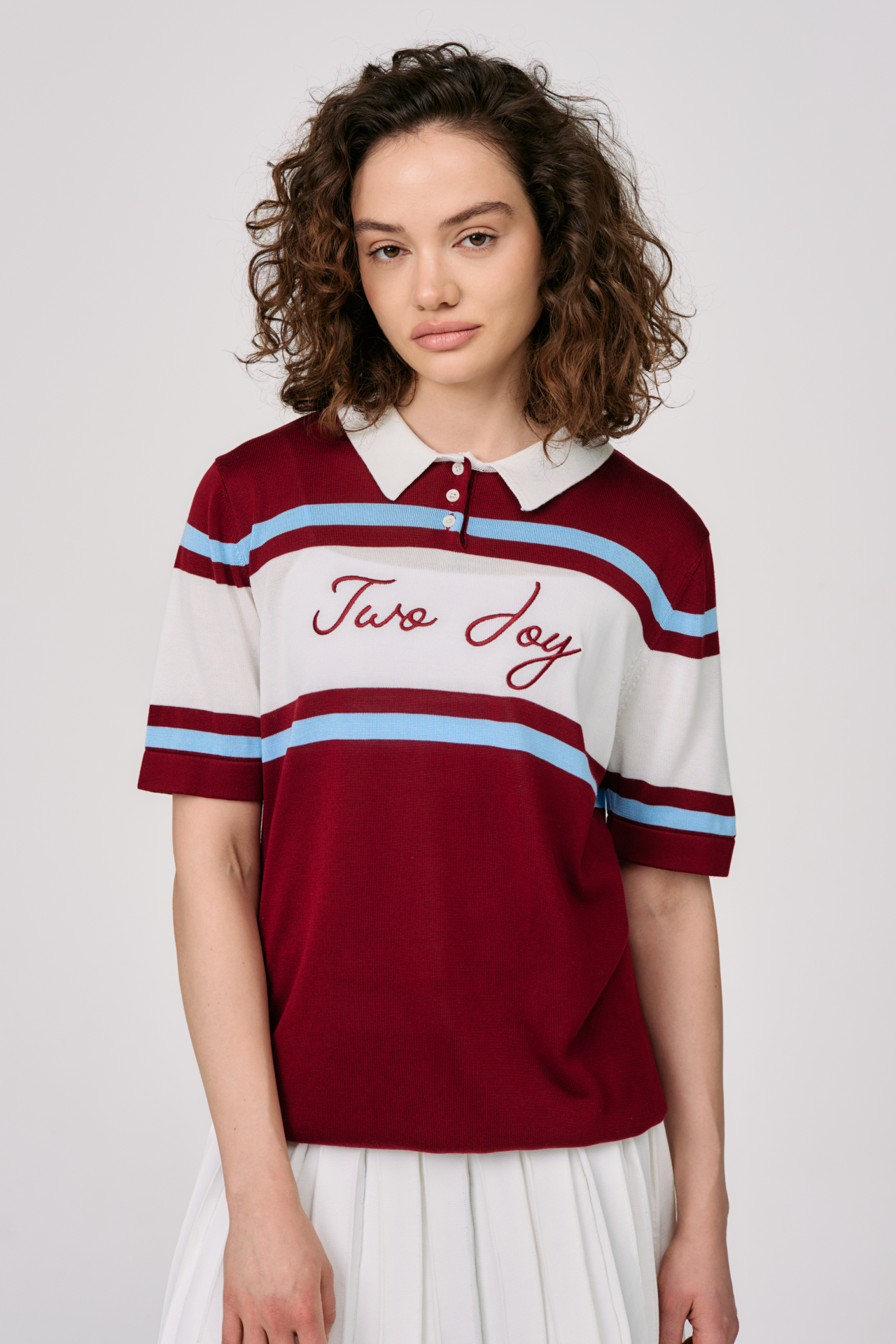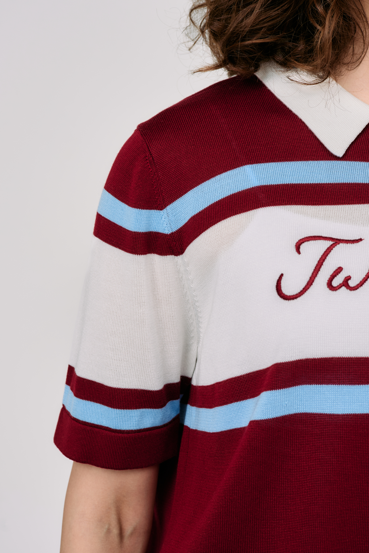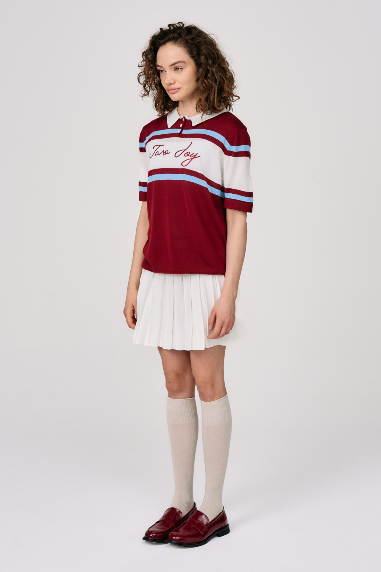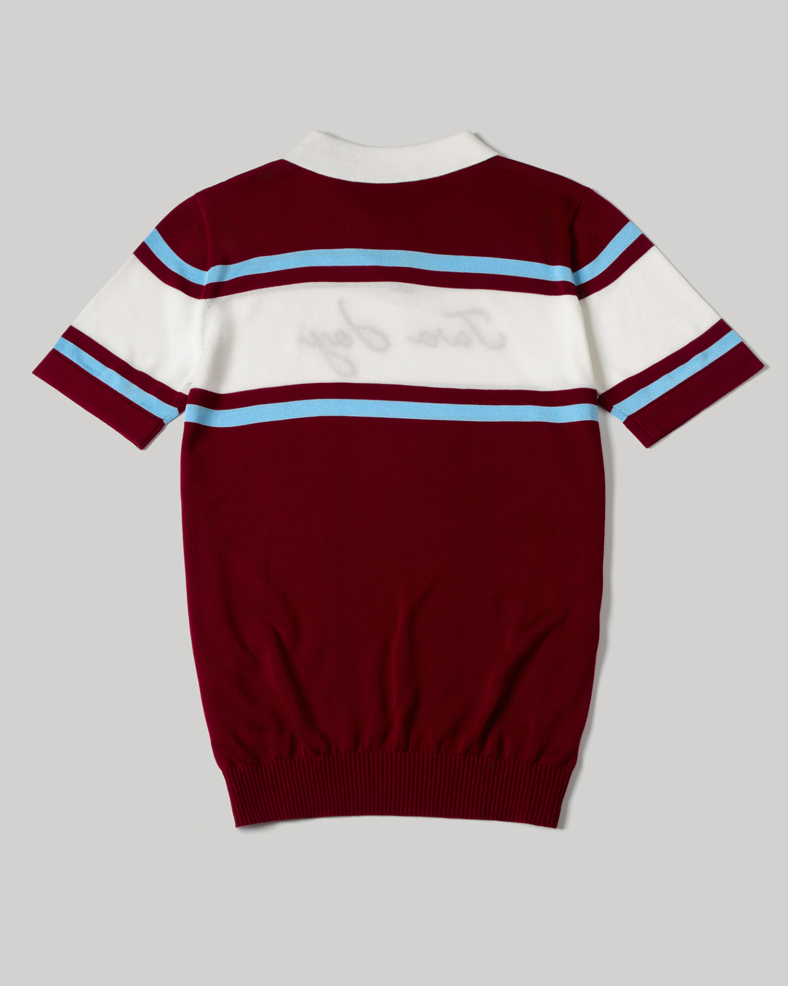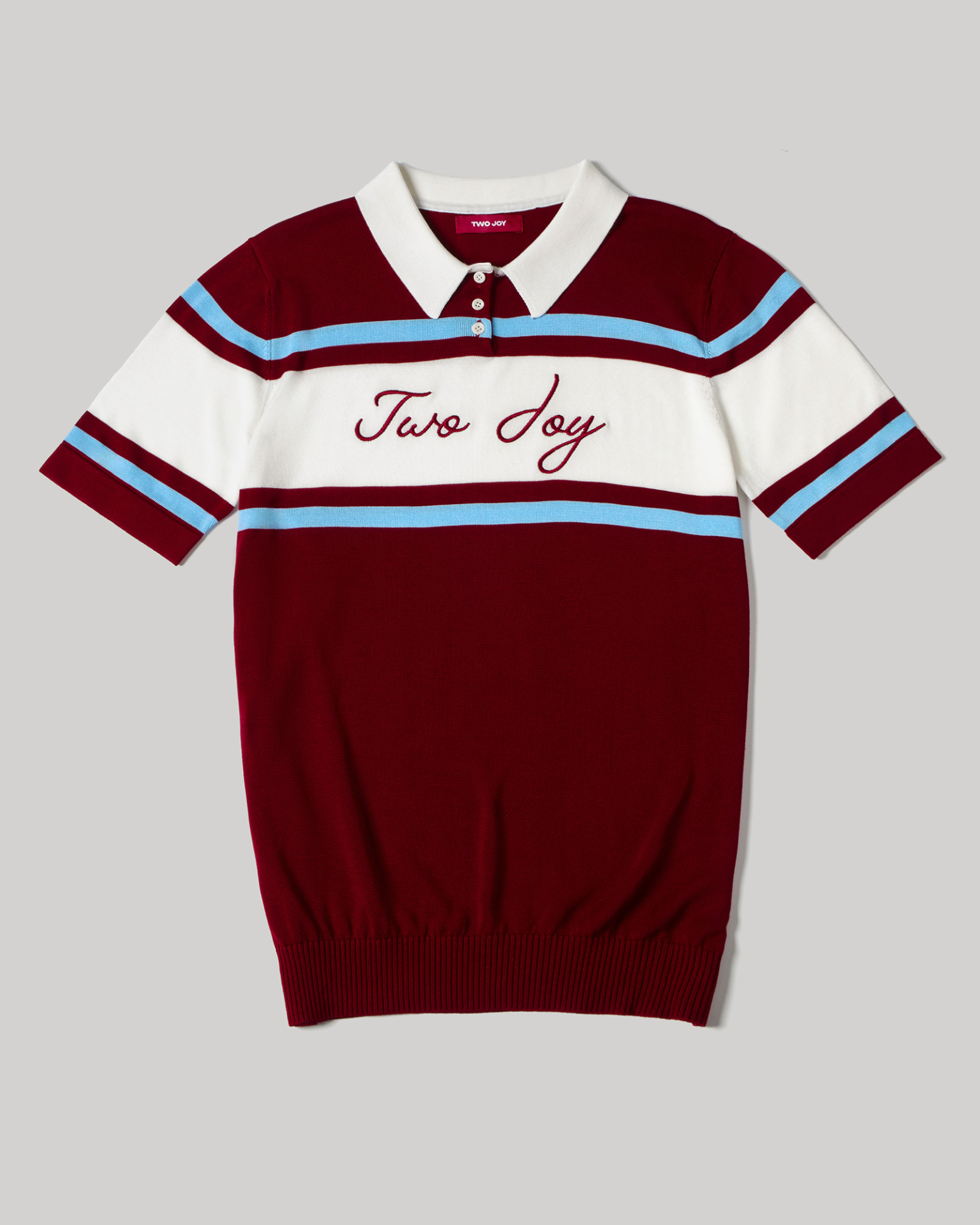 Ruby Tempo — трикотажное поло с графичным полосатым рисунком, вдохновлённым эстетикой винтажной спортивной формы и университетских команд. Контрастные линии создают динамичный ритм, а насыщенный рубиновый оттенок делает модель ярким акцентом образа.