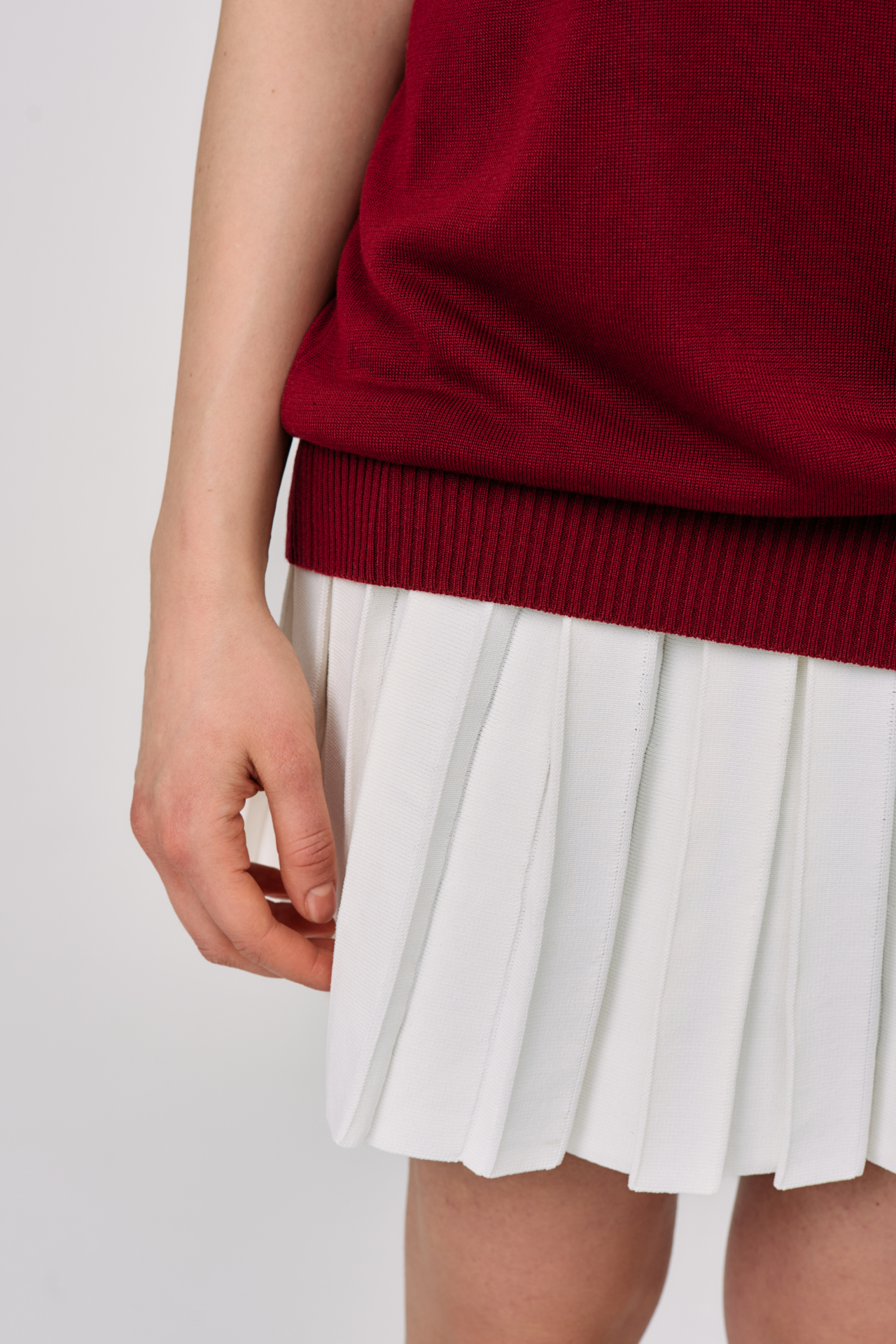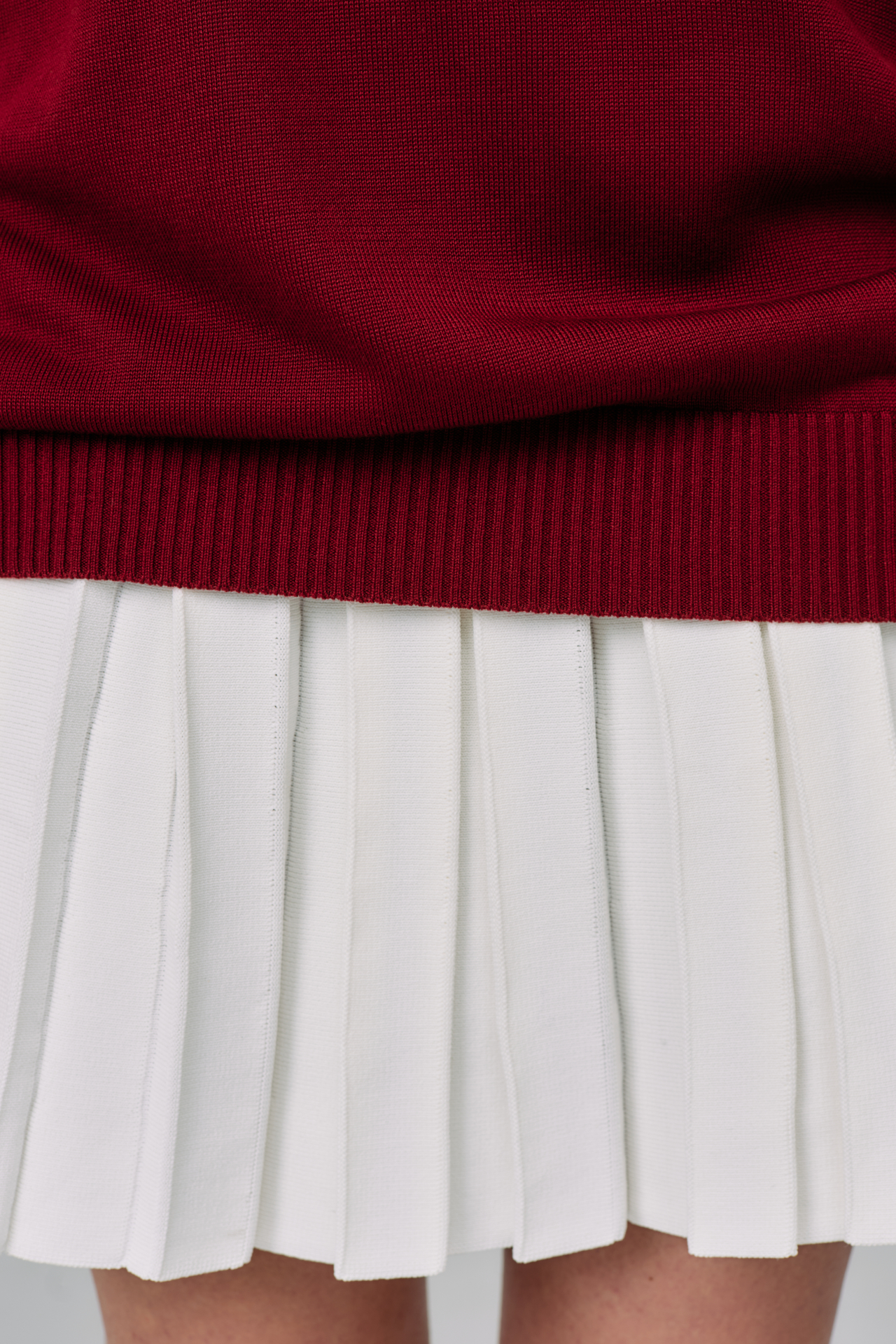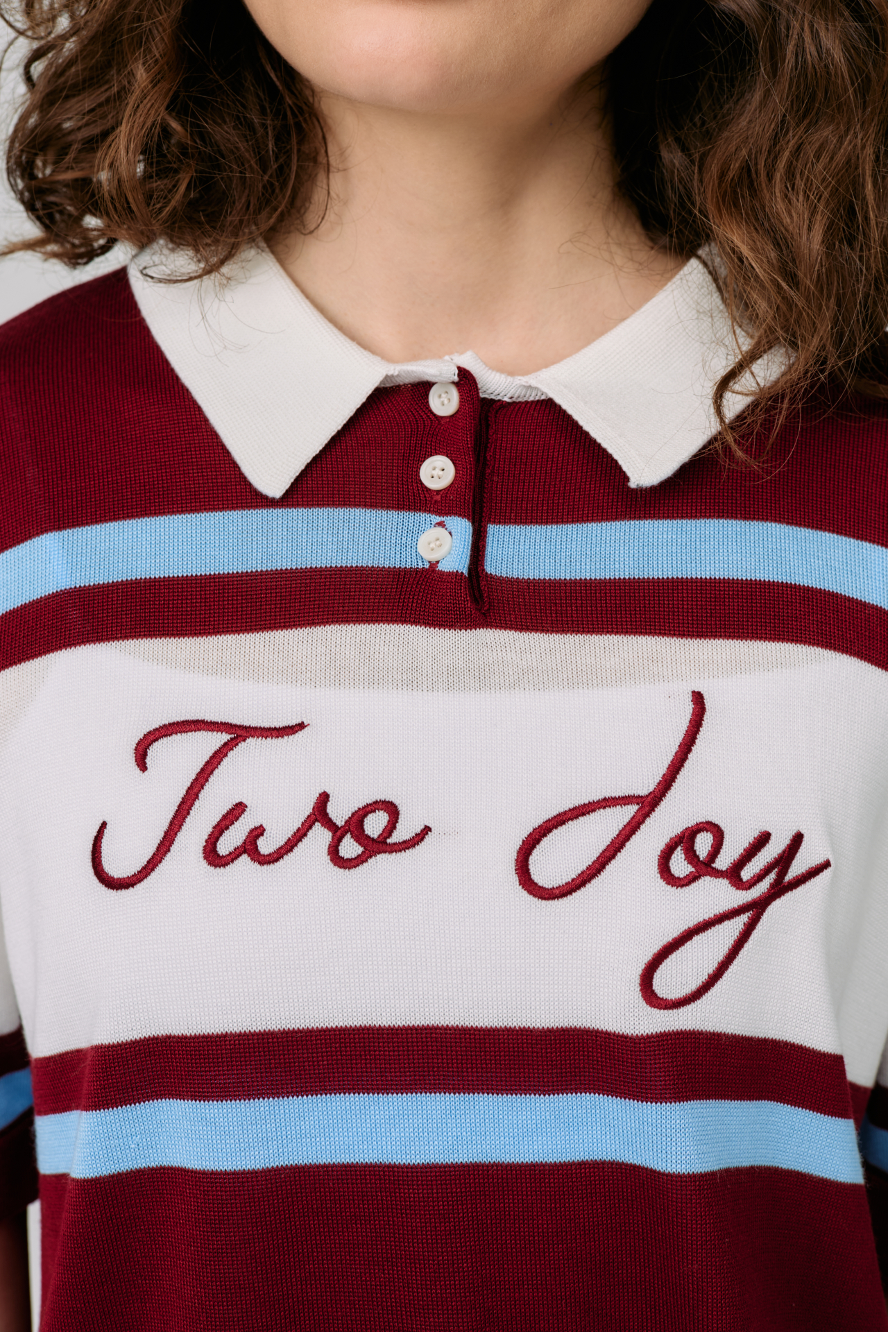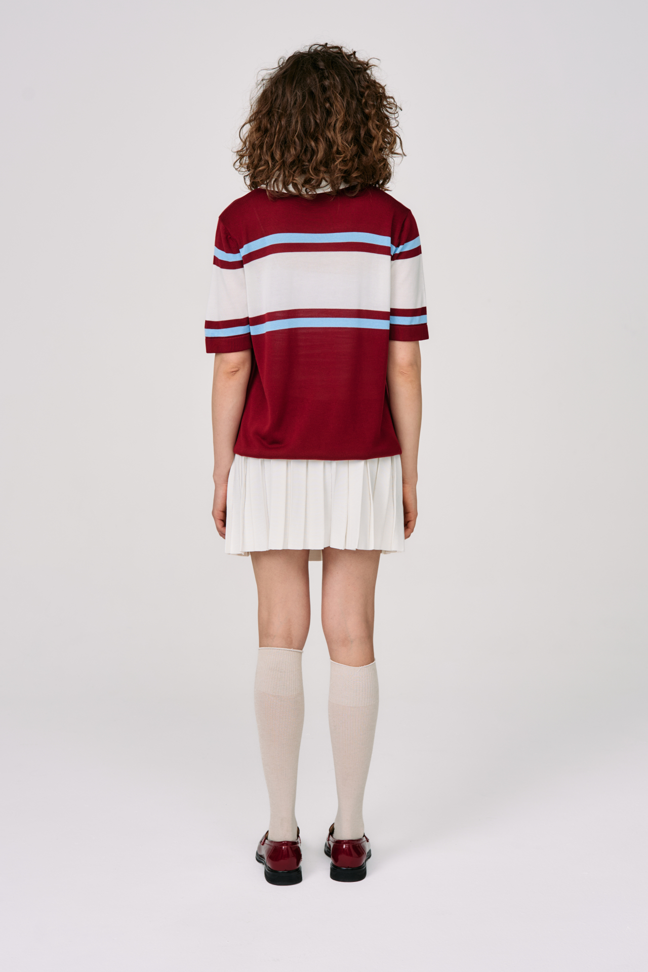 Ruby Tempo — трикотажное поло с графичным полосатым рисунком, вдохновлённым эстетикой винтажной спортивной формы и университетских команд. Контрастные линии создают динамичный ритм, а насыщенный рубиновый оттенок делает модель ярким акцентом образа.
